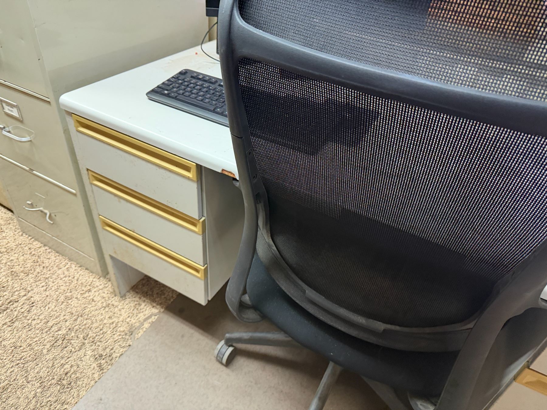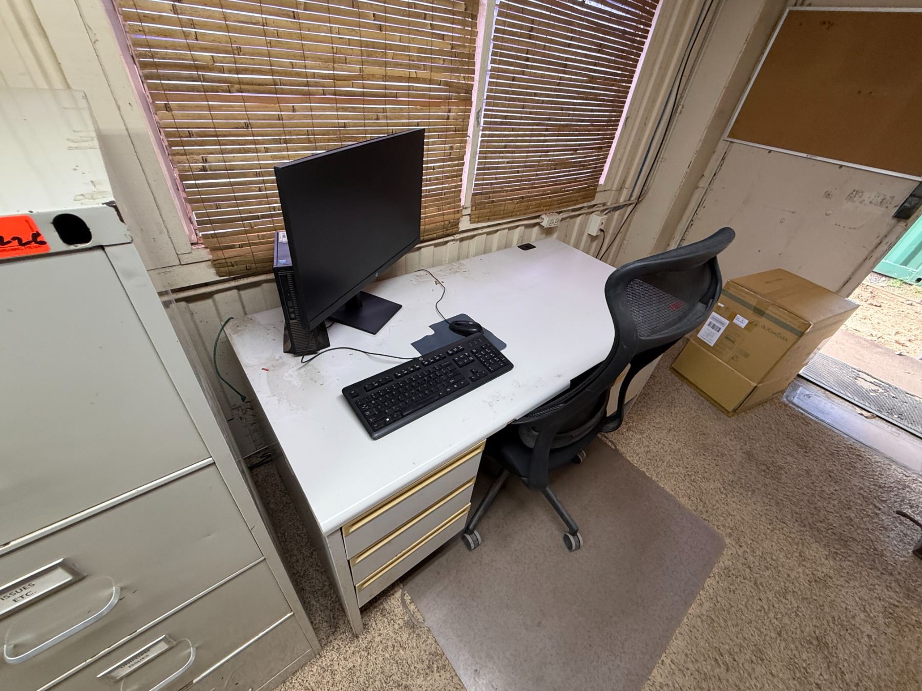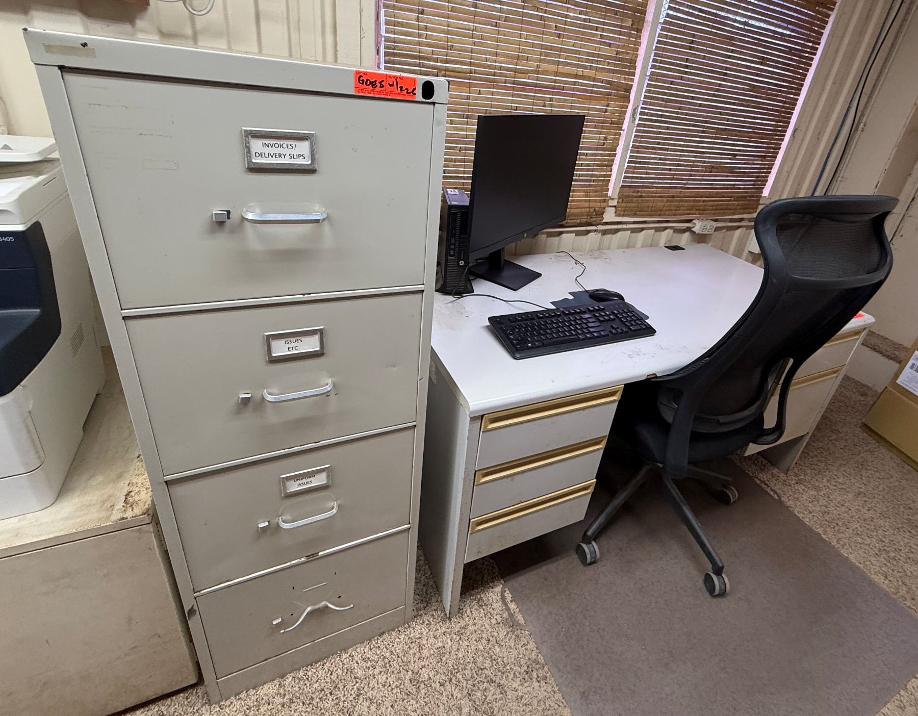 Metal 4-Drawer Filing Cabinet w/ Desk, Chair, Monitor, Keyboard, etc