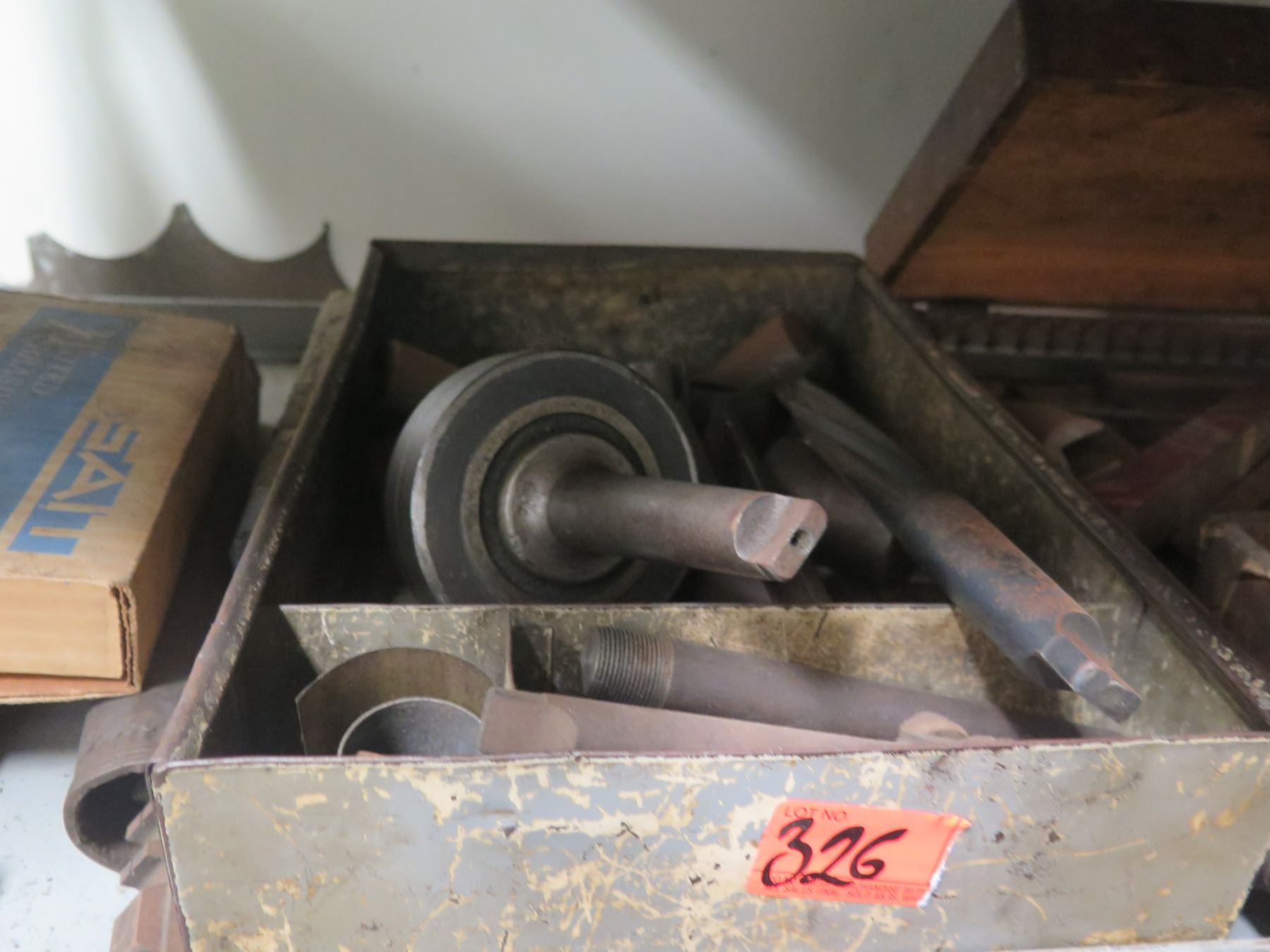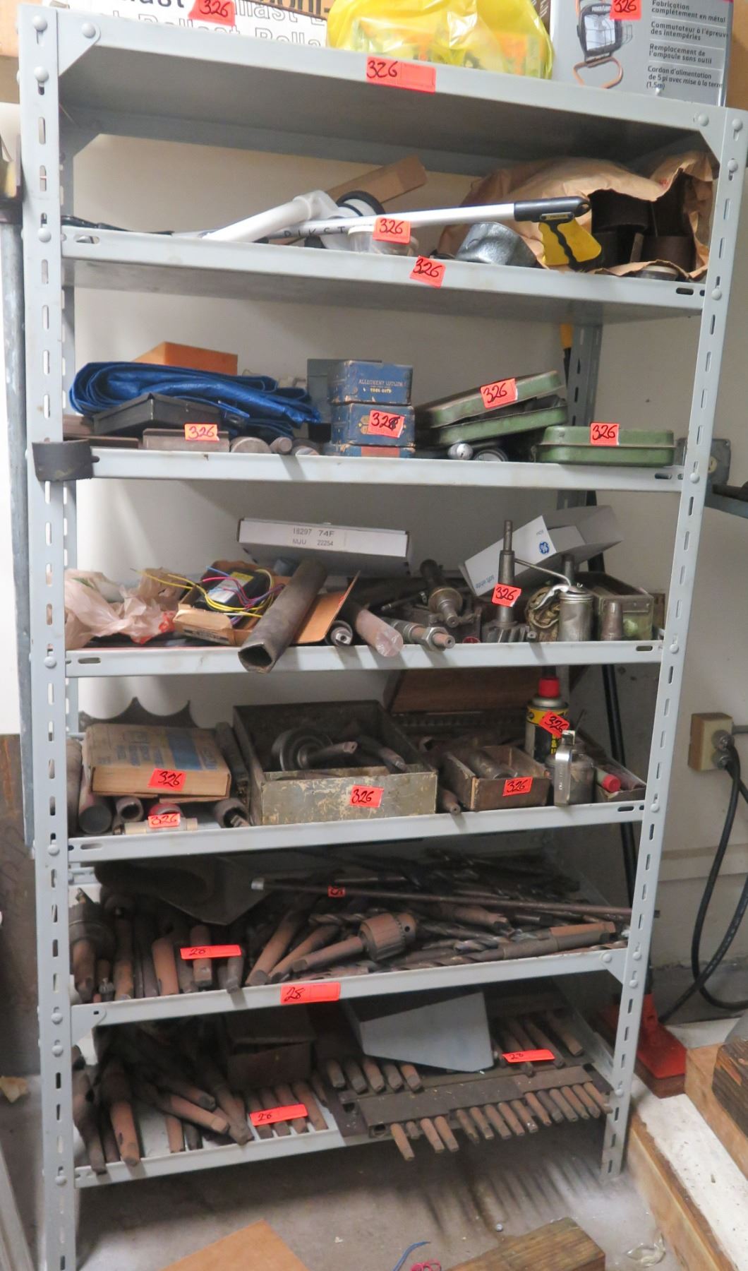 Metal 6-Tier Shelf & Contents: Lights, Hand Tools, Grinding Wheels, Oil Can, Bits, etc