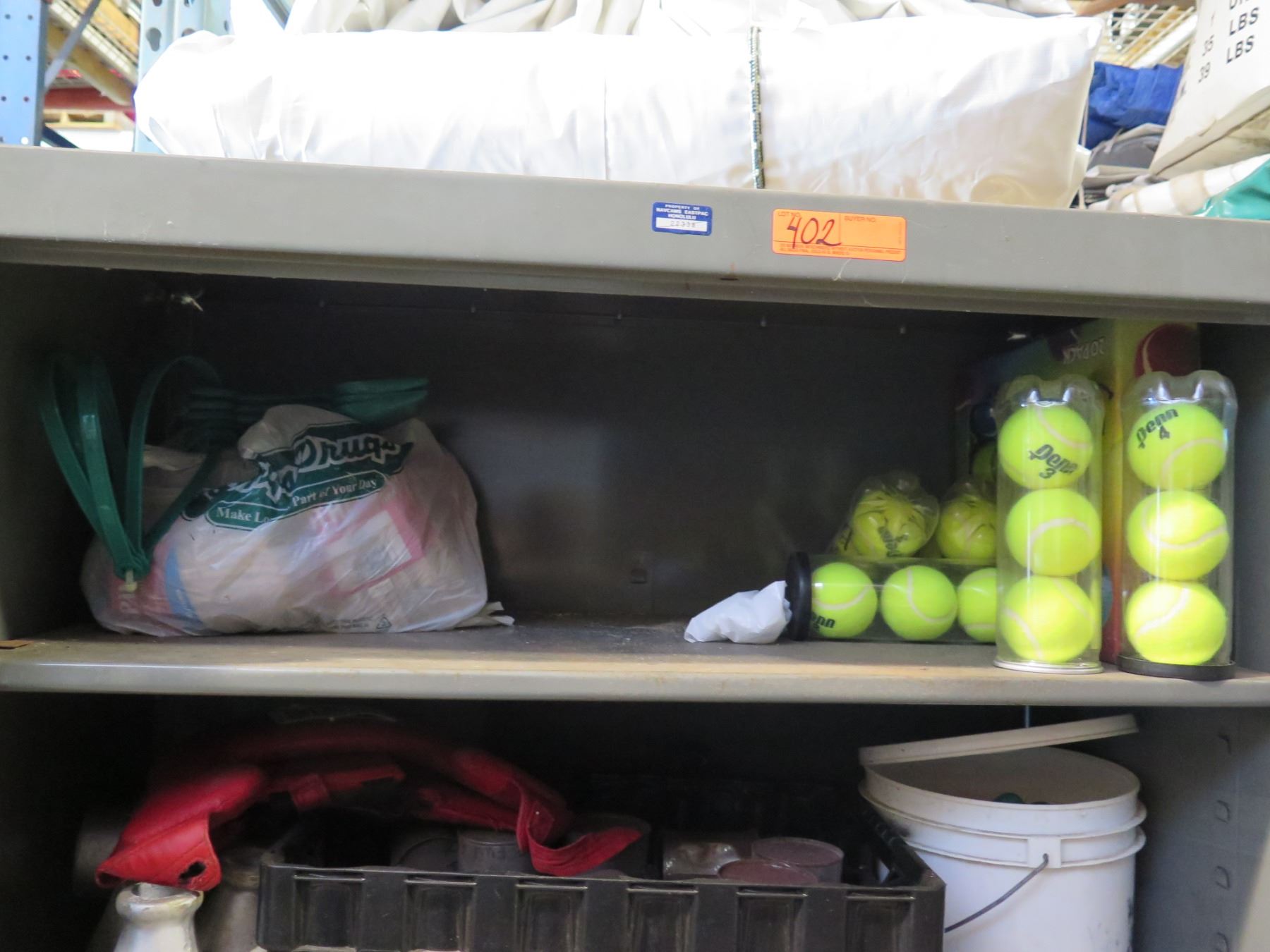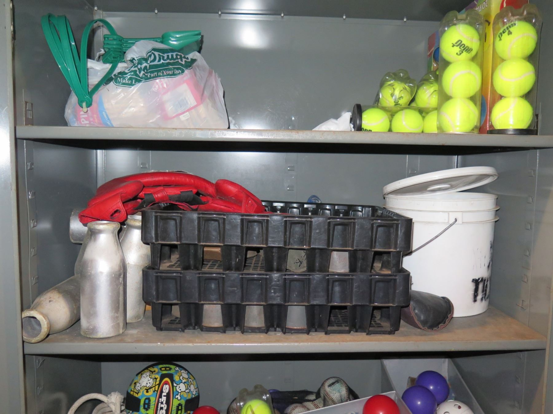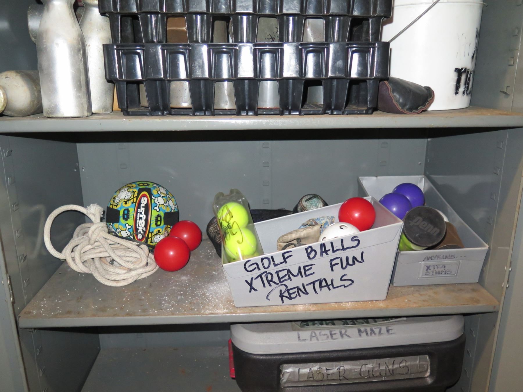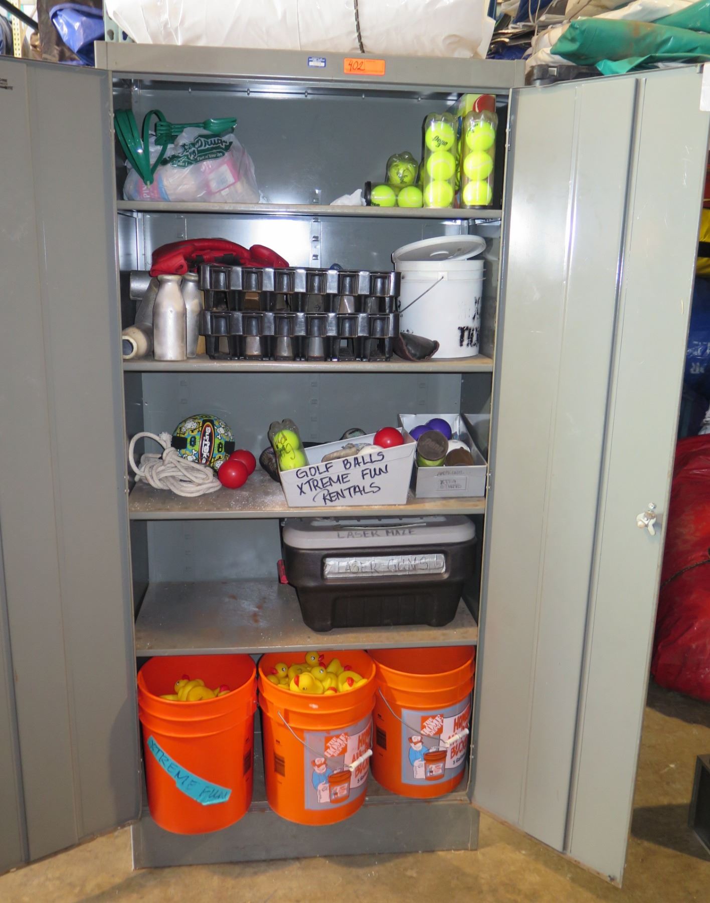 Metal Cabinet with all contents as pictured. Misc items, carnival game parts, balls, cans, bottles