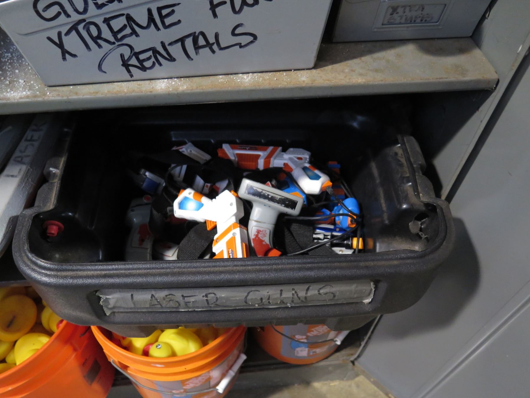 Metal Cabinet with all contents as pictured. Misc items, carnival game parts, balls, cans, bottles and bucket of floating ducks. Ducks was used for a duck game. Float the ducks and spin in the pool. Participant chooses a duck and prize is given with cooresponding number under the duck.