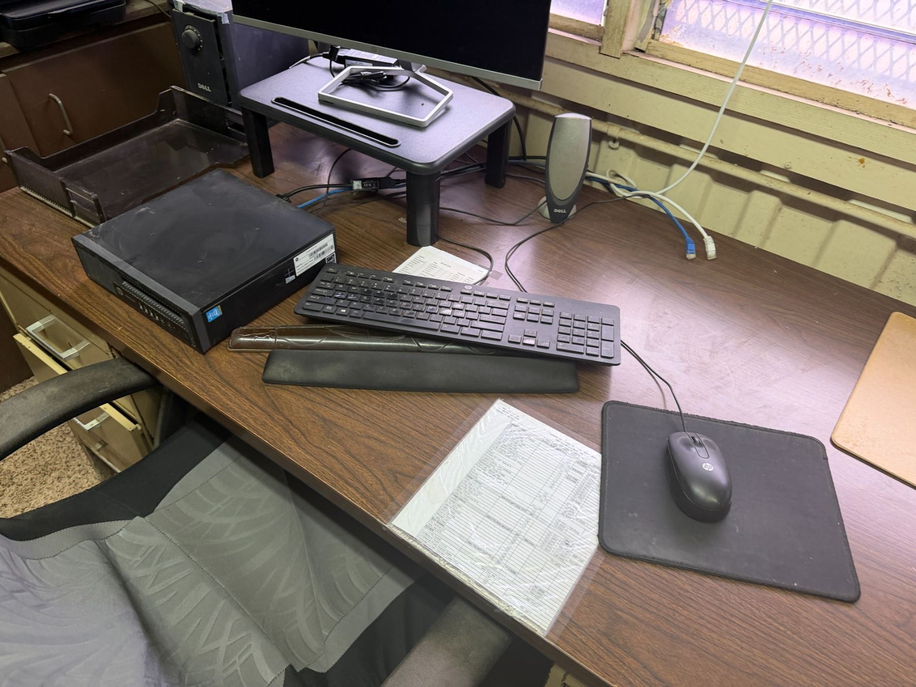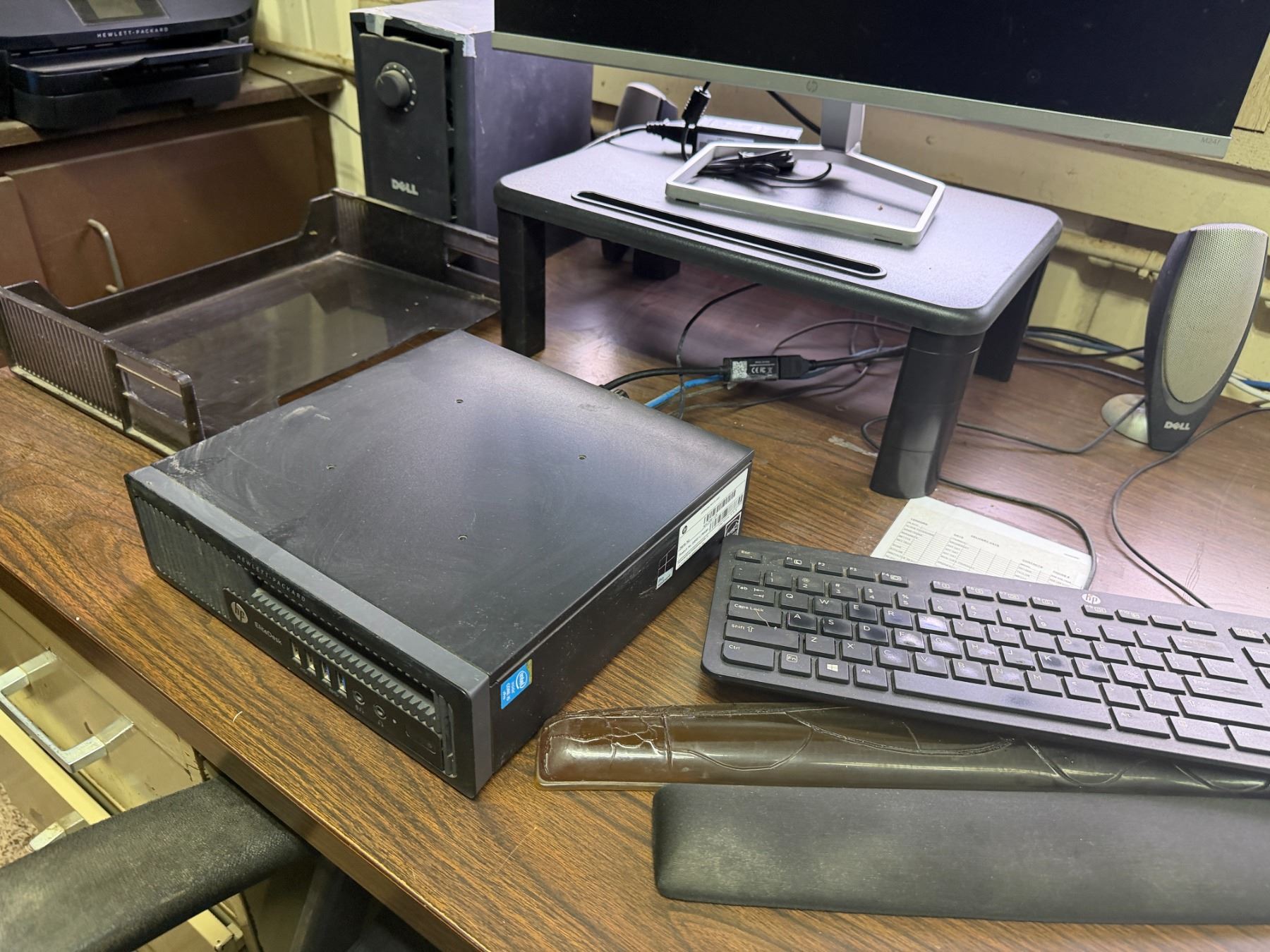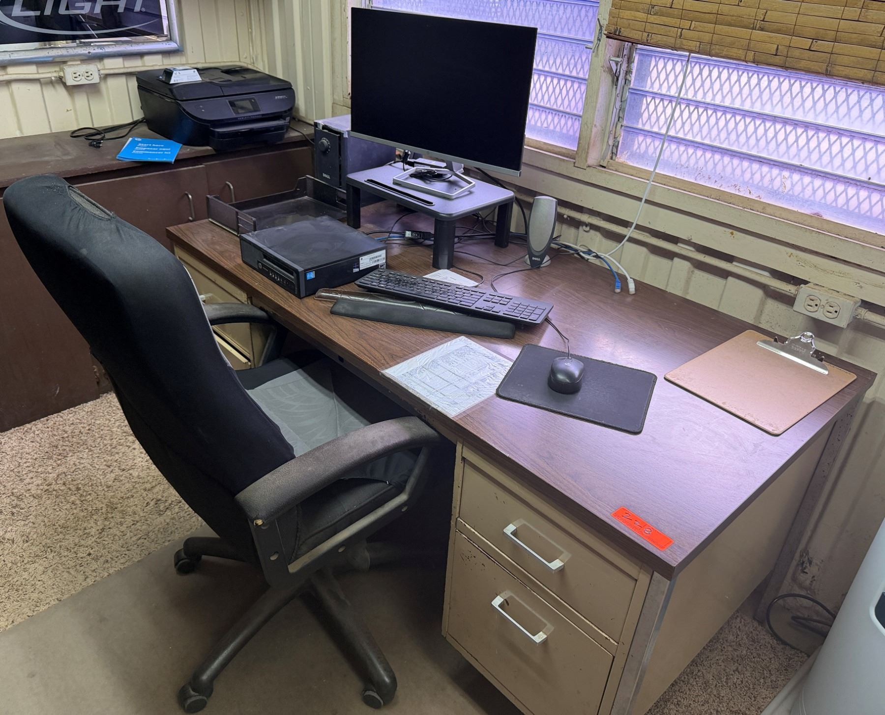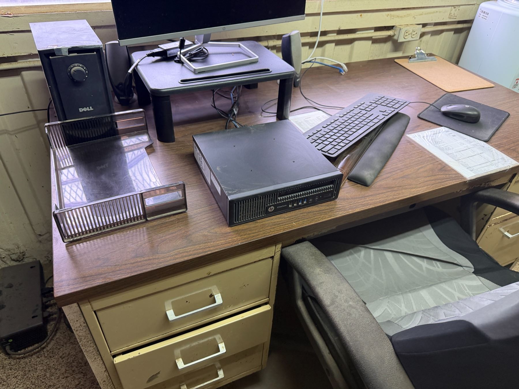 Metal Desk w/ Laminate Top, Chair & Contents: HP Elitedesk, Monitor, Printer, Sunbeam Mini-Fridge, e