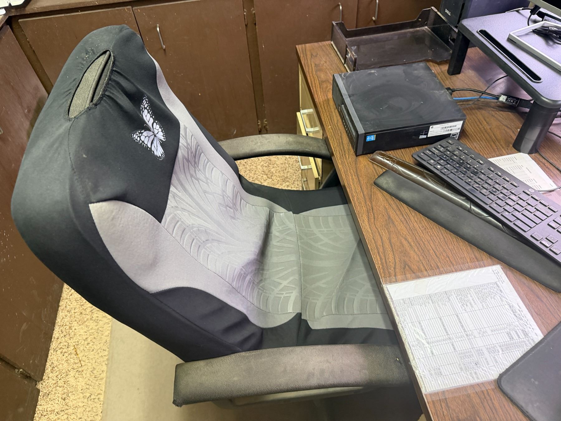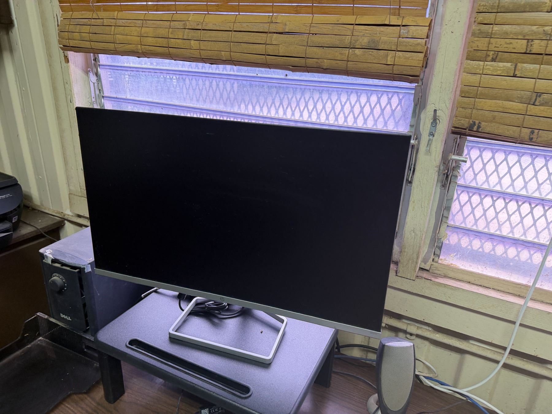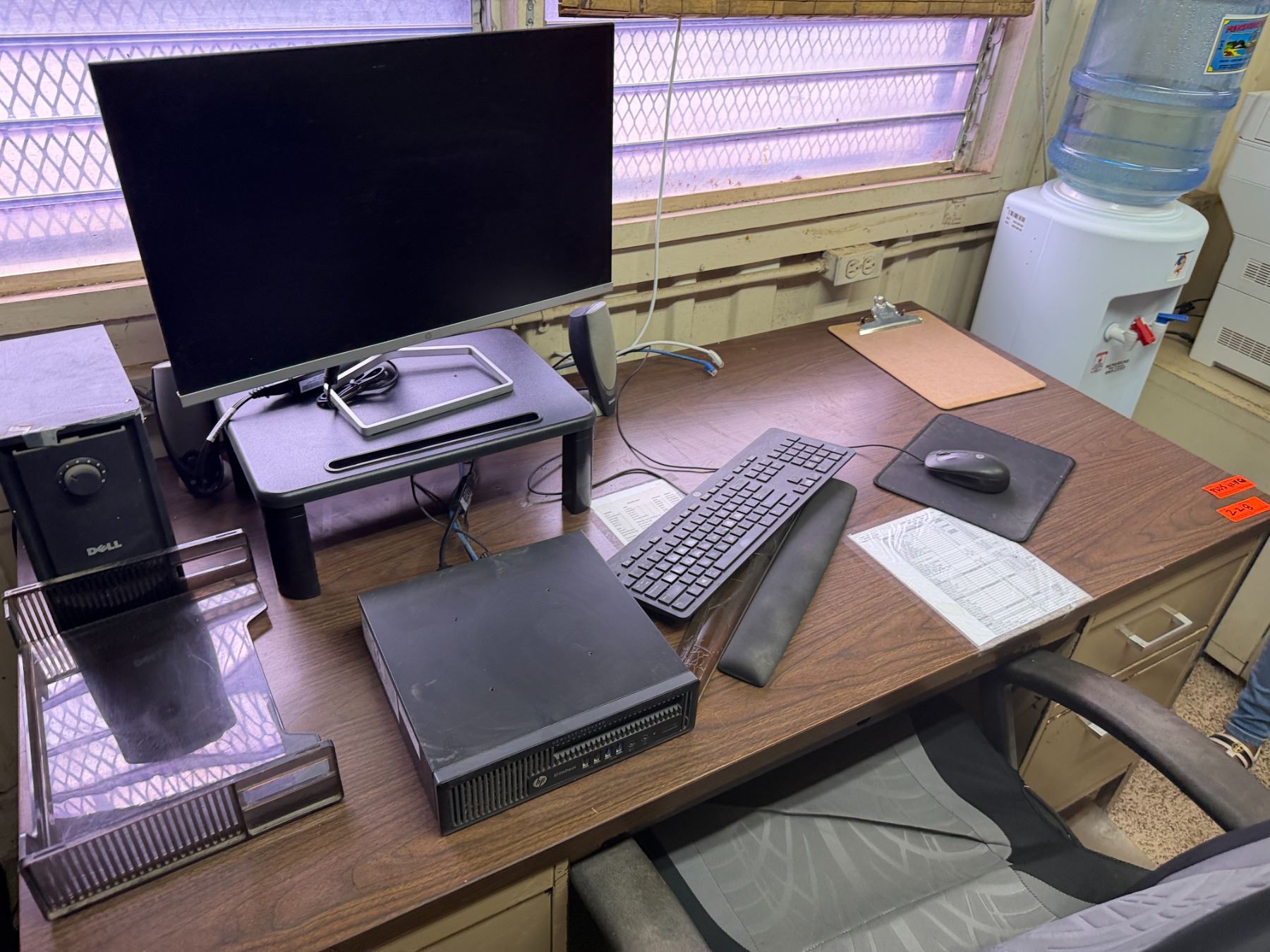 Metal Desk w/ Laminate Top, Chair & Contents: HP Elitedesk, Monitor, Printer, Sunbeam Mini-Fridge, e