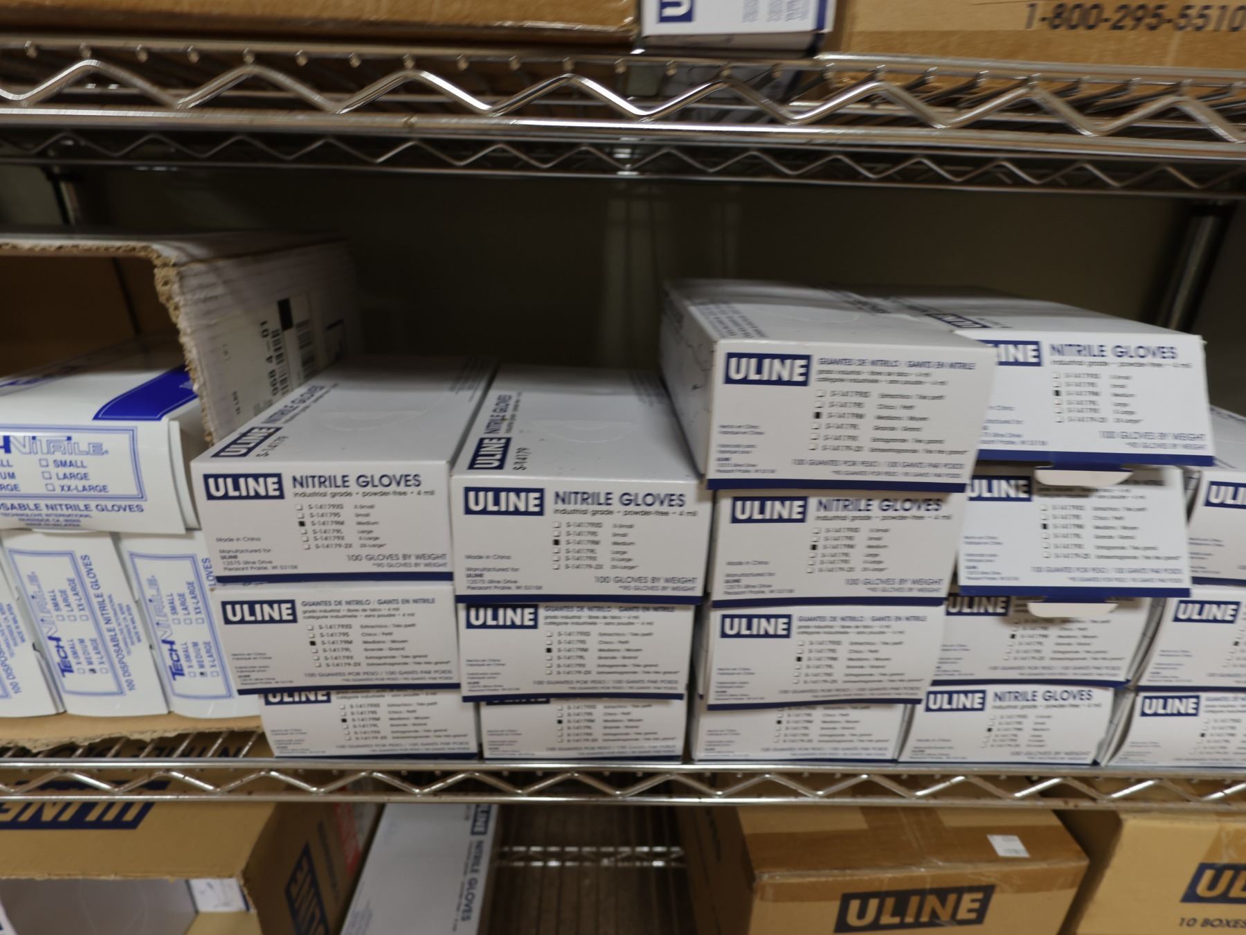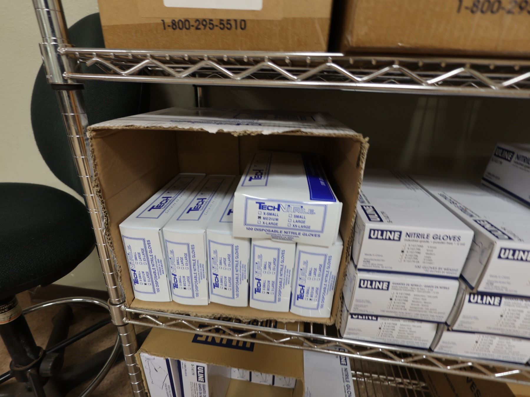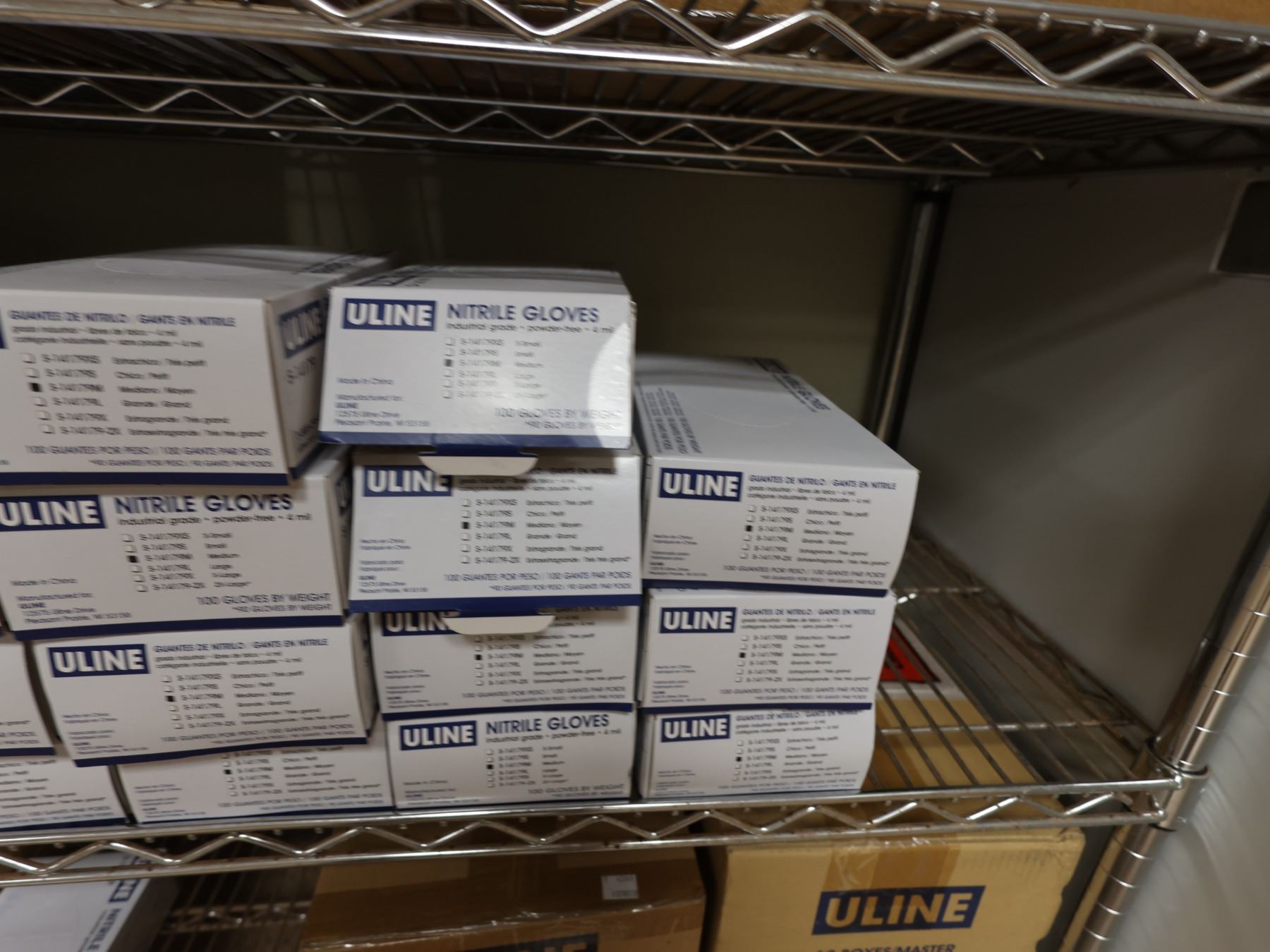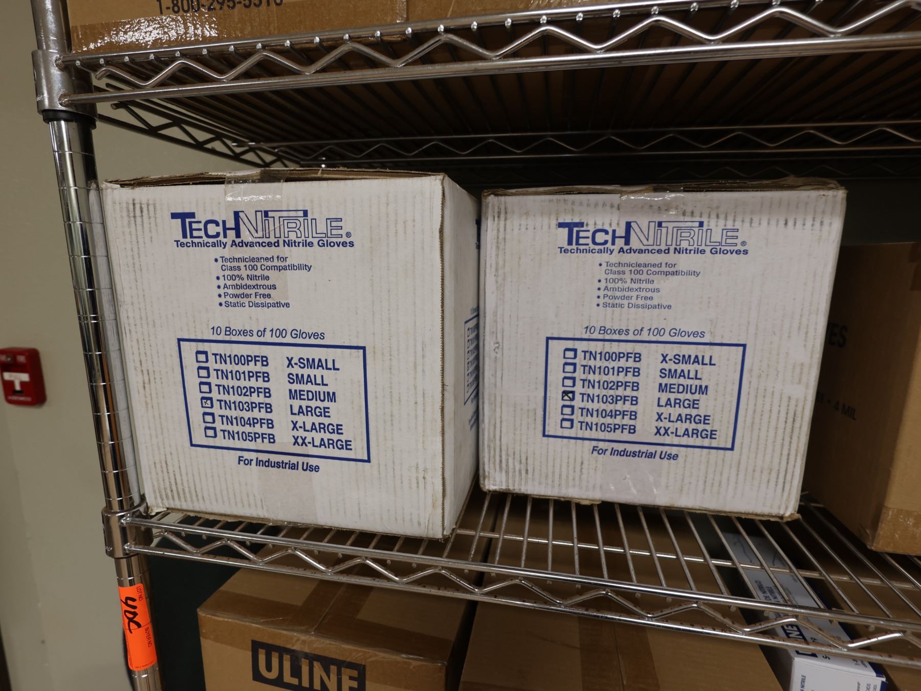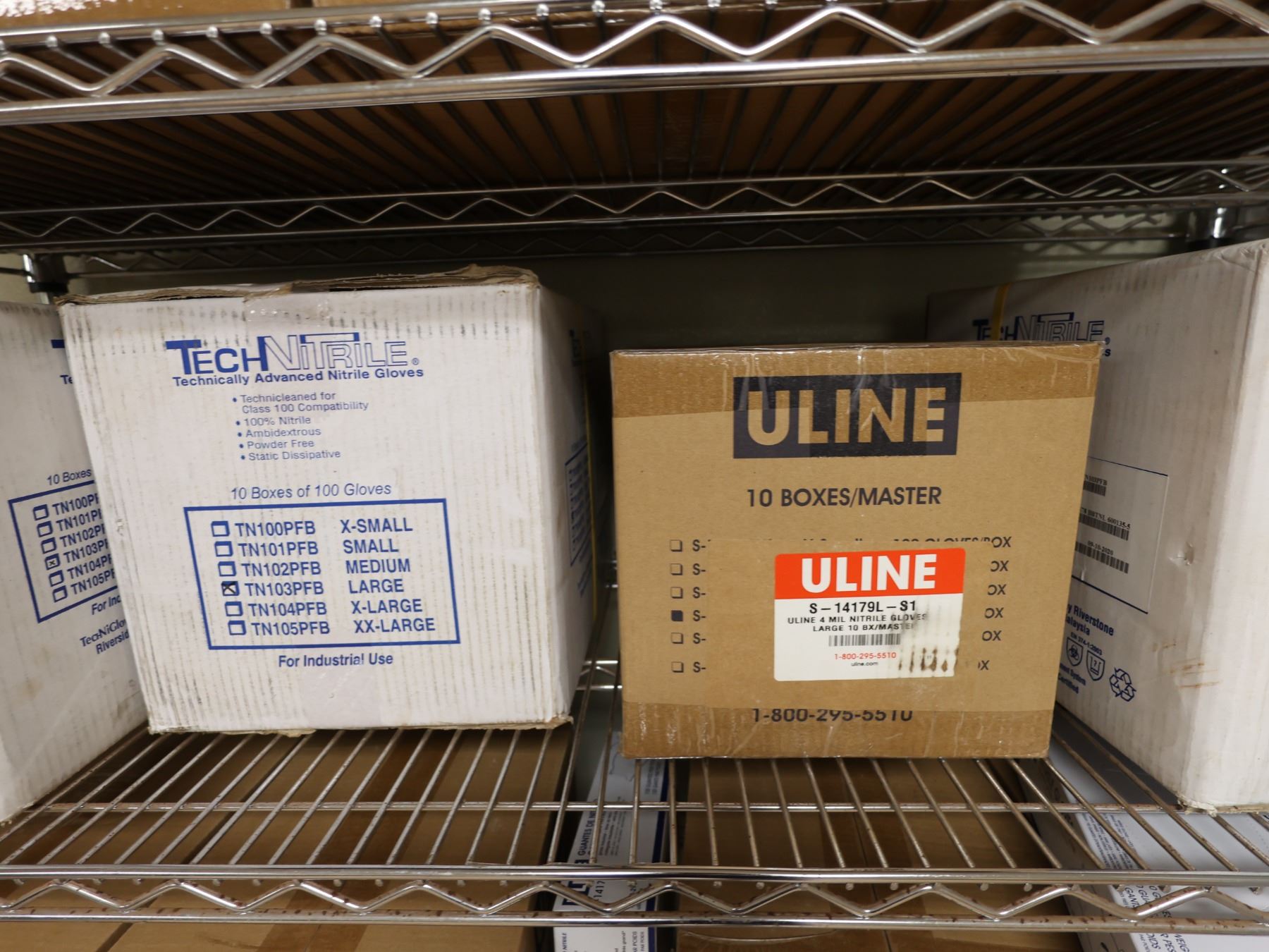Metal Rolling Wire Mesh 5-Tier Shelving Unit & Contents: Nitrile Gloves, Misc Brands & Sizes