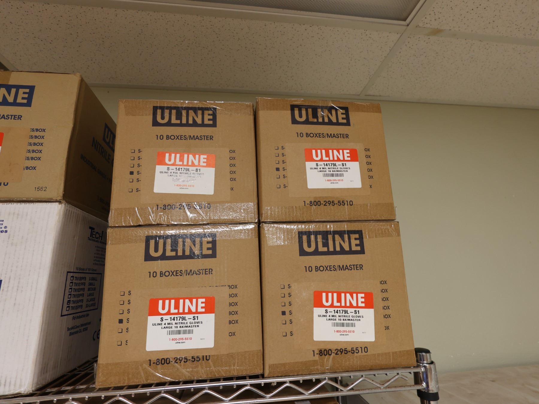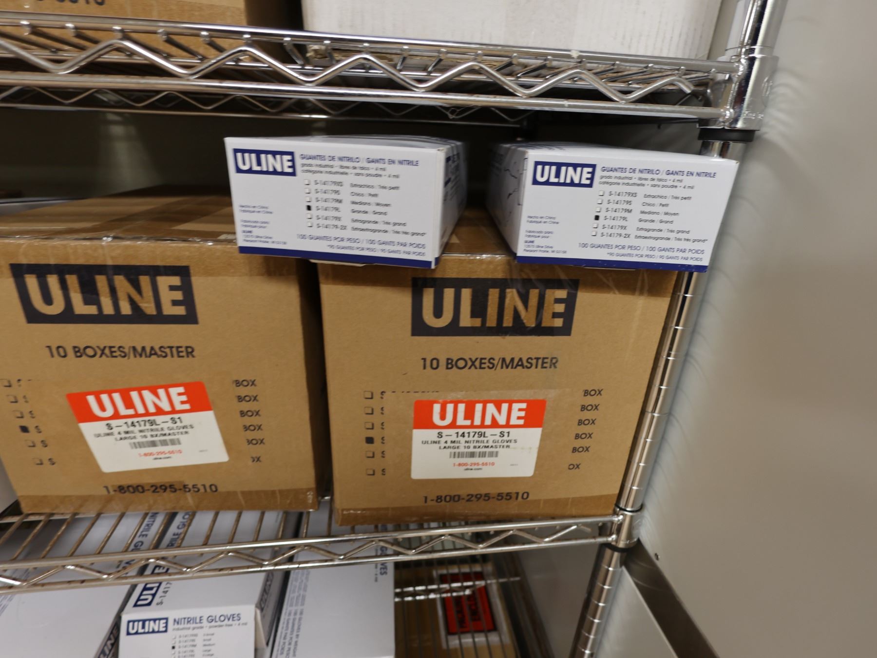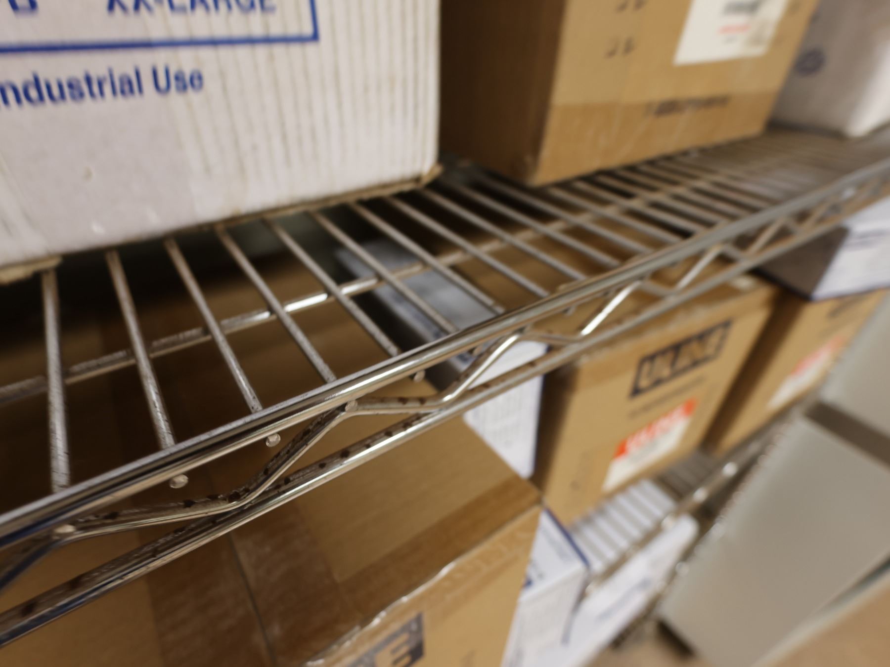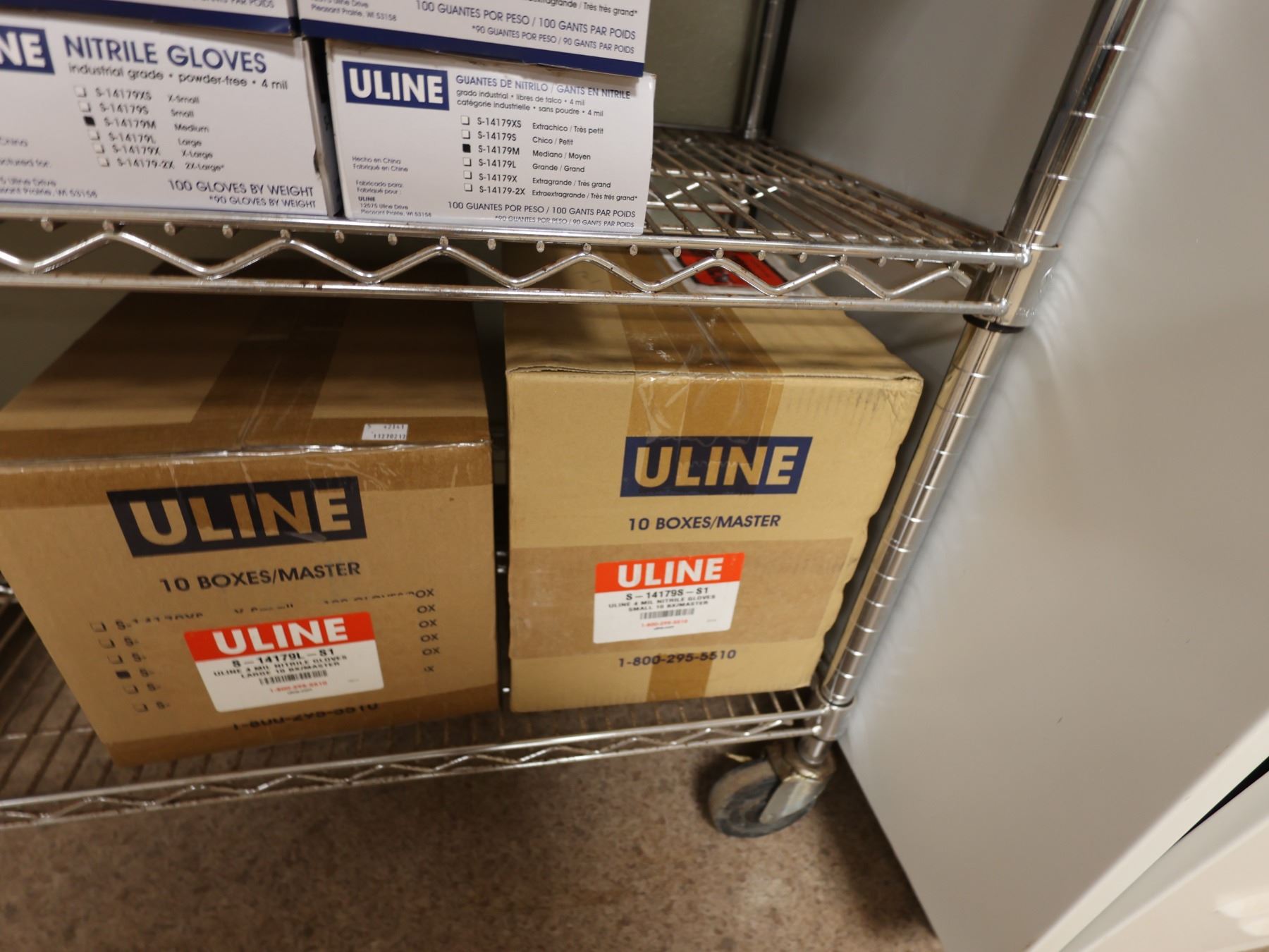 Metal Rolling Wire Mesh 5-Tier Shelving Unit & Contents: Nitrile Gloves, Misc Brands & Sizes