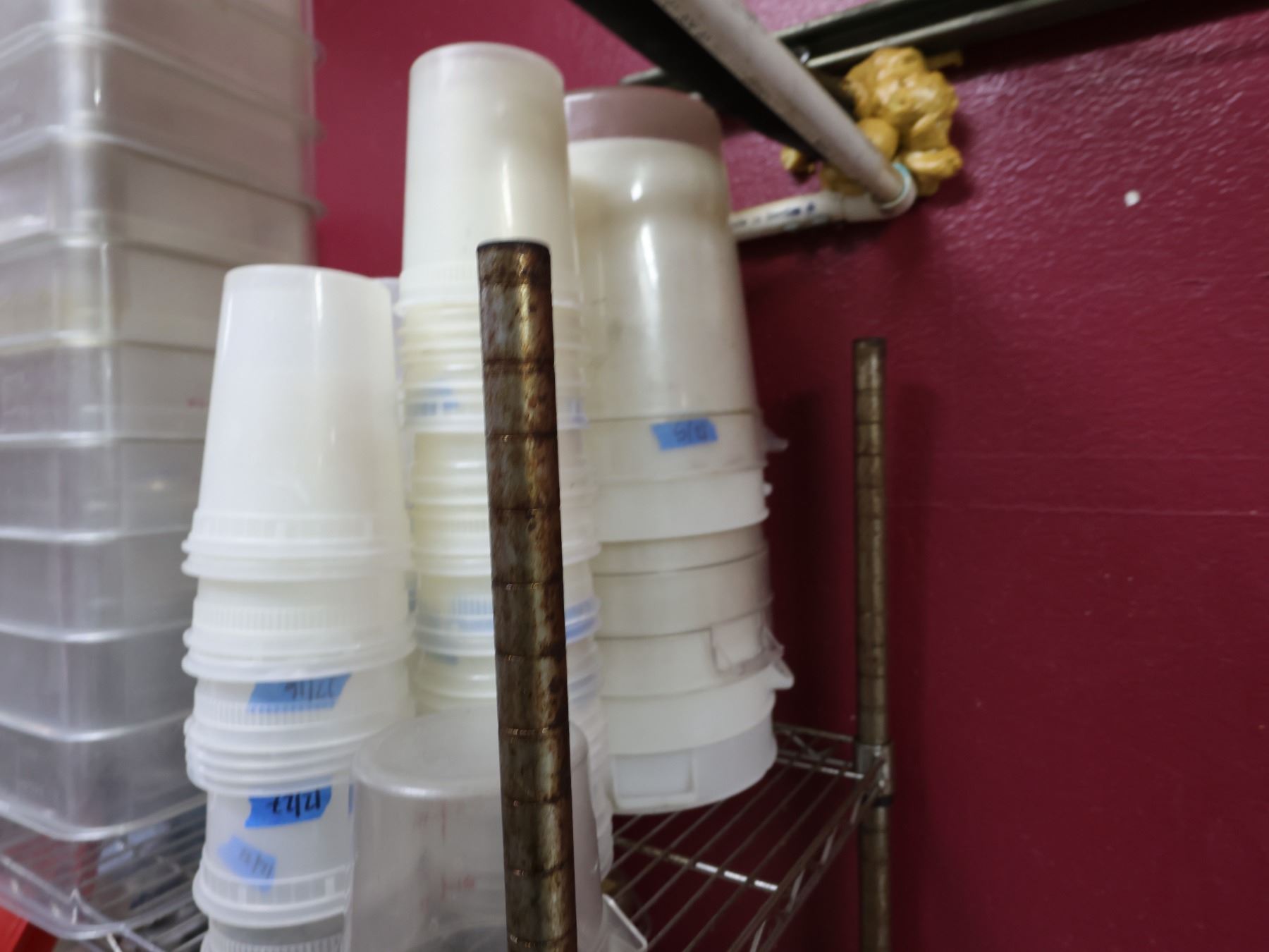 Metal Shelving Unit & Contents: Multiple Metal & Plastic Food Storage Containers, Pitchers, Plates, etc.