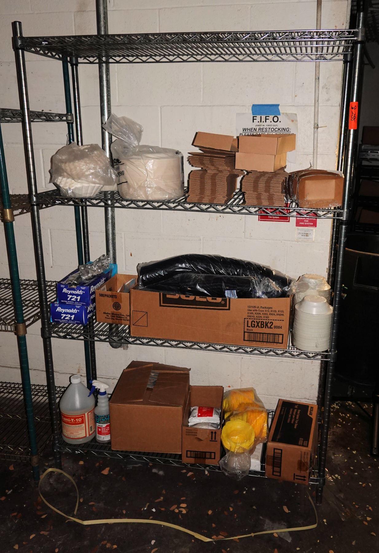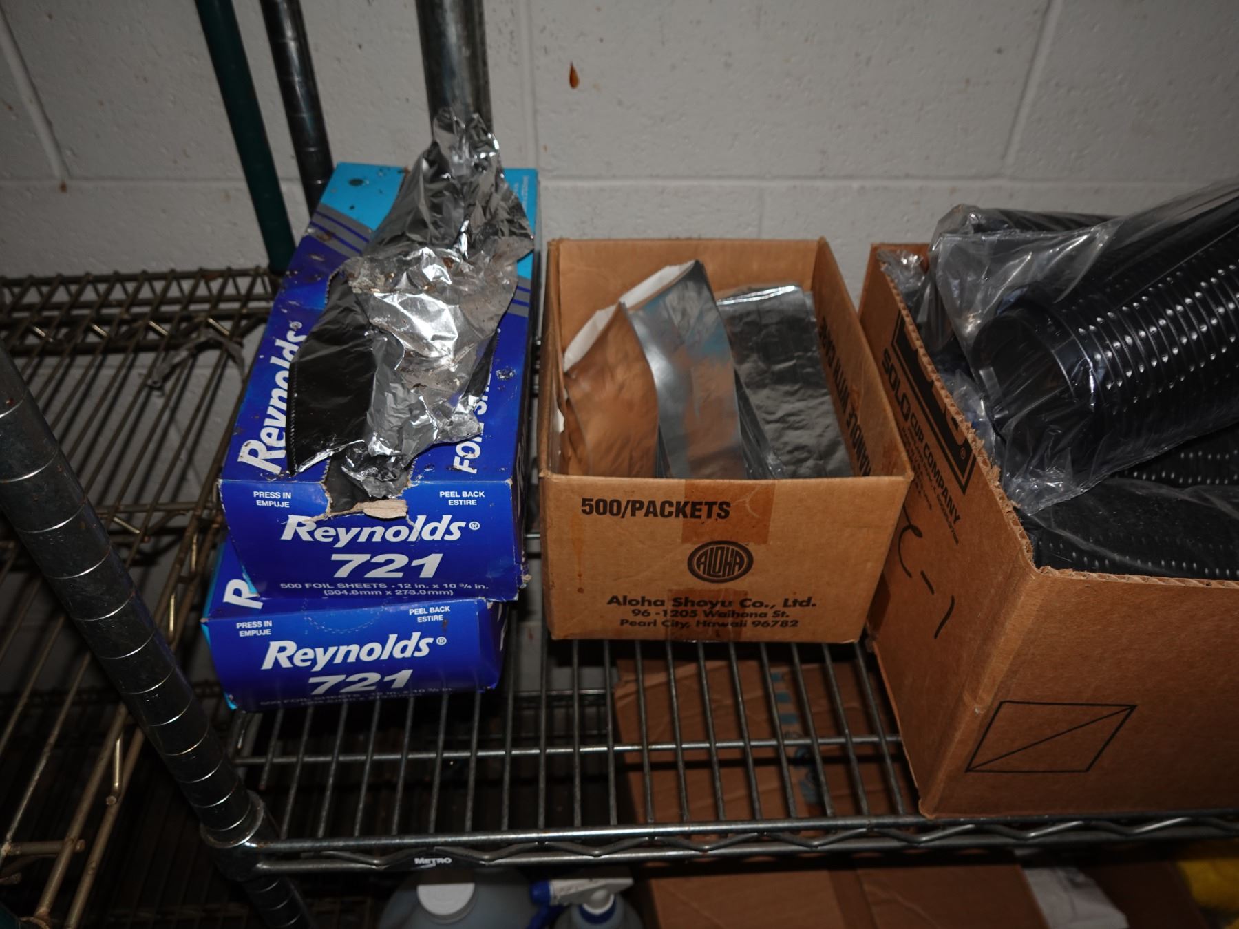 Metro Metal Shelving Unit 46" x 18" x 74"H & Contents: Plates & Take-Out Containers, Foil, Lids, etc.