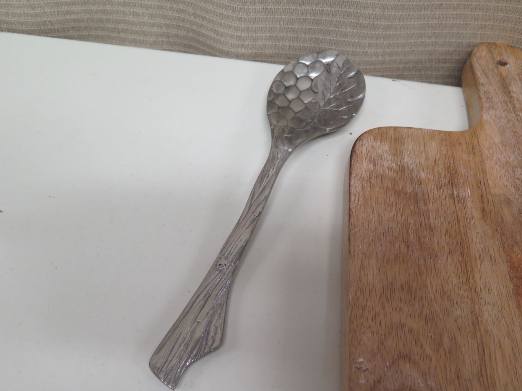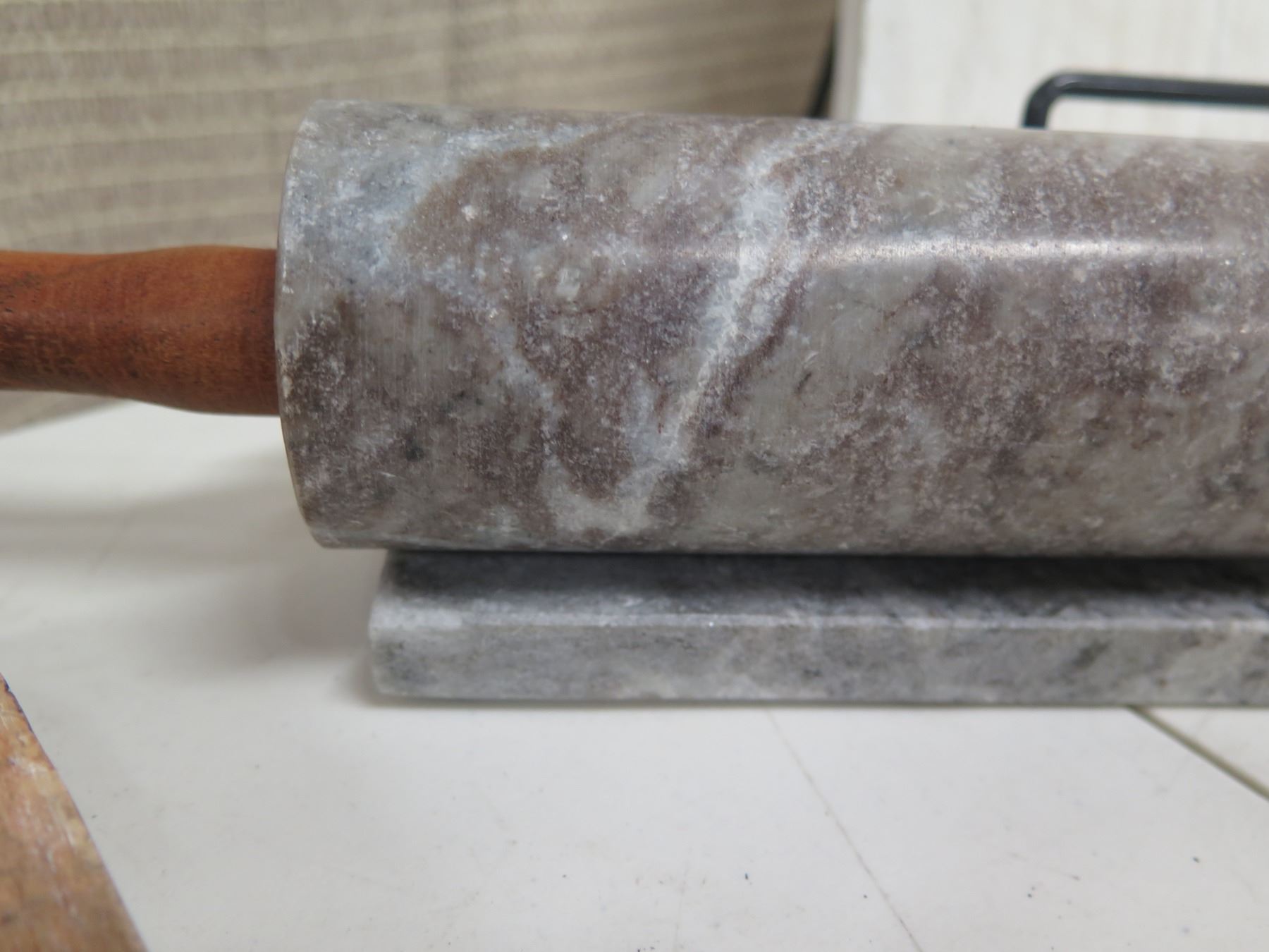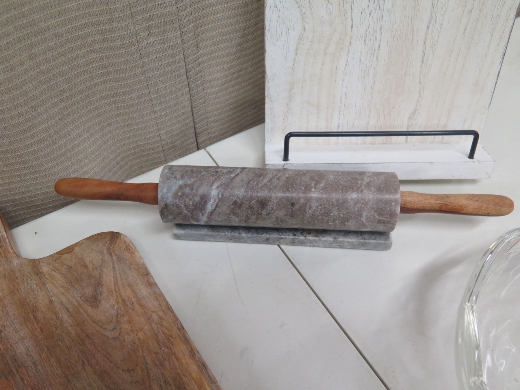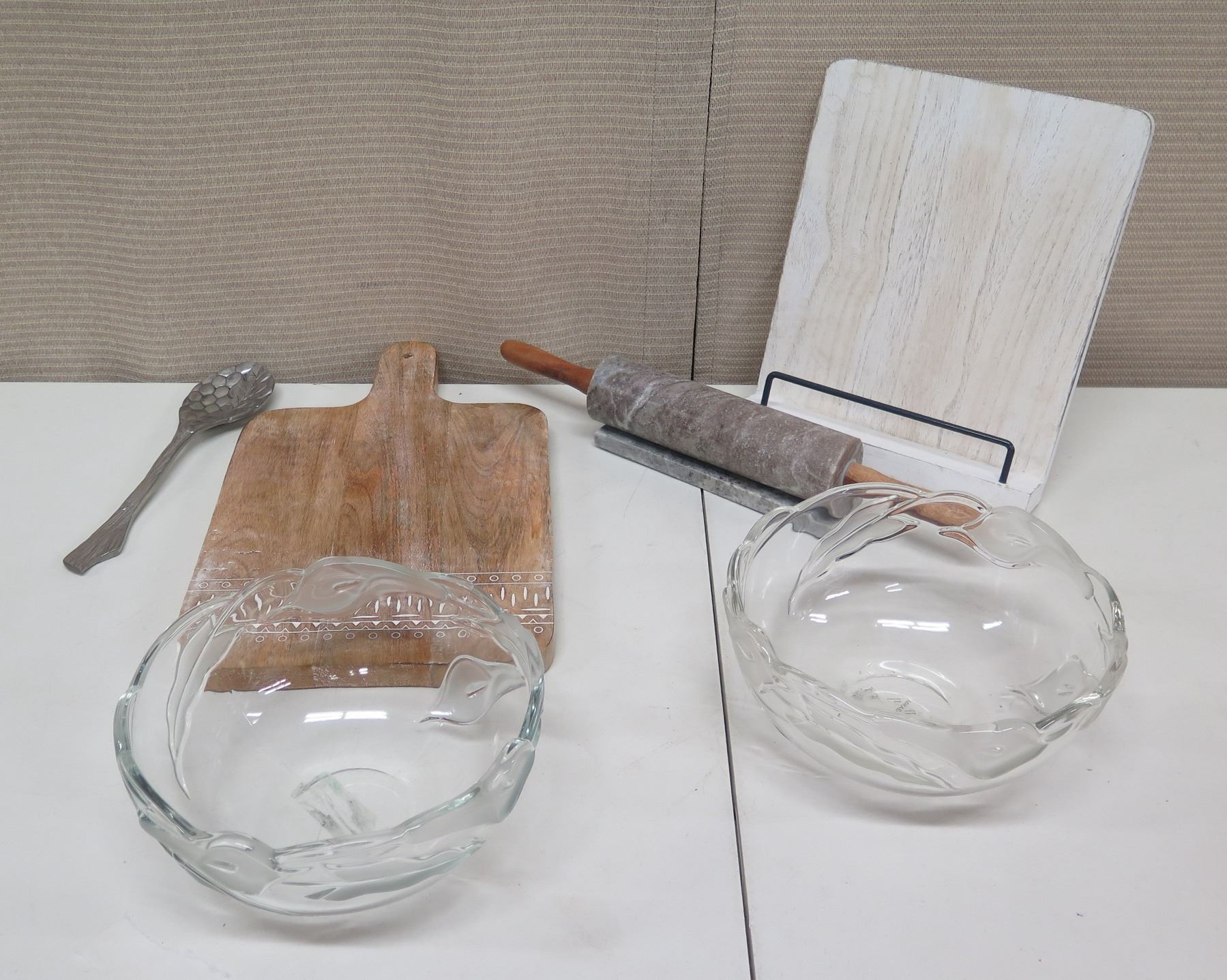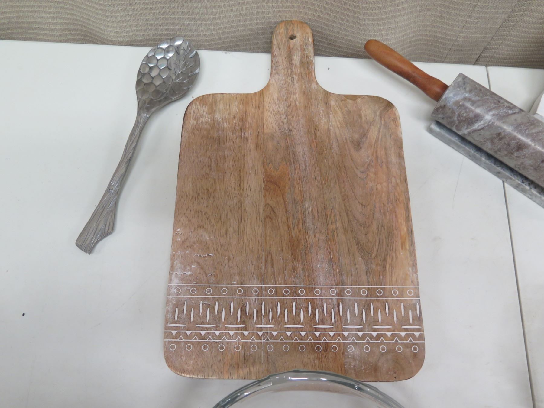 Mikasa Glass Bowl w/ Cut-Out Design, Bee & Willow Cutting Board, Stone Rolling Pin, etc