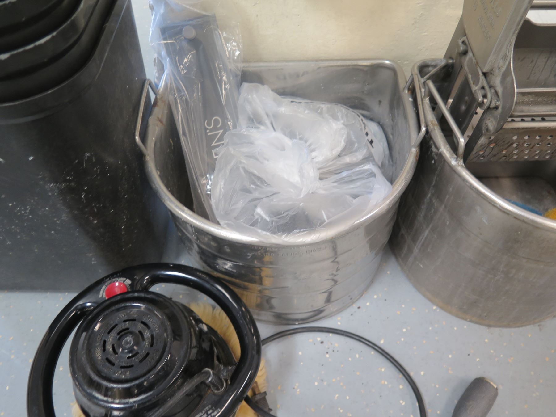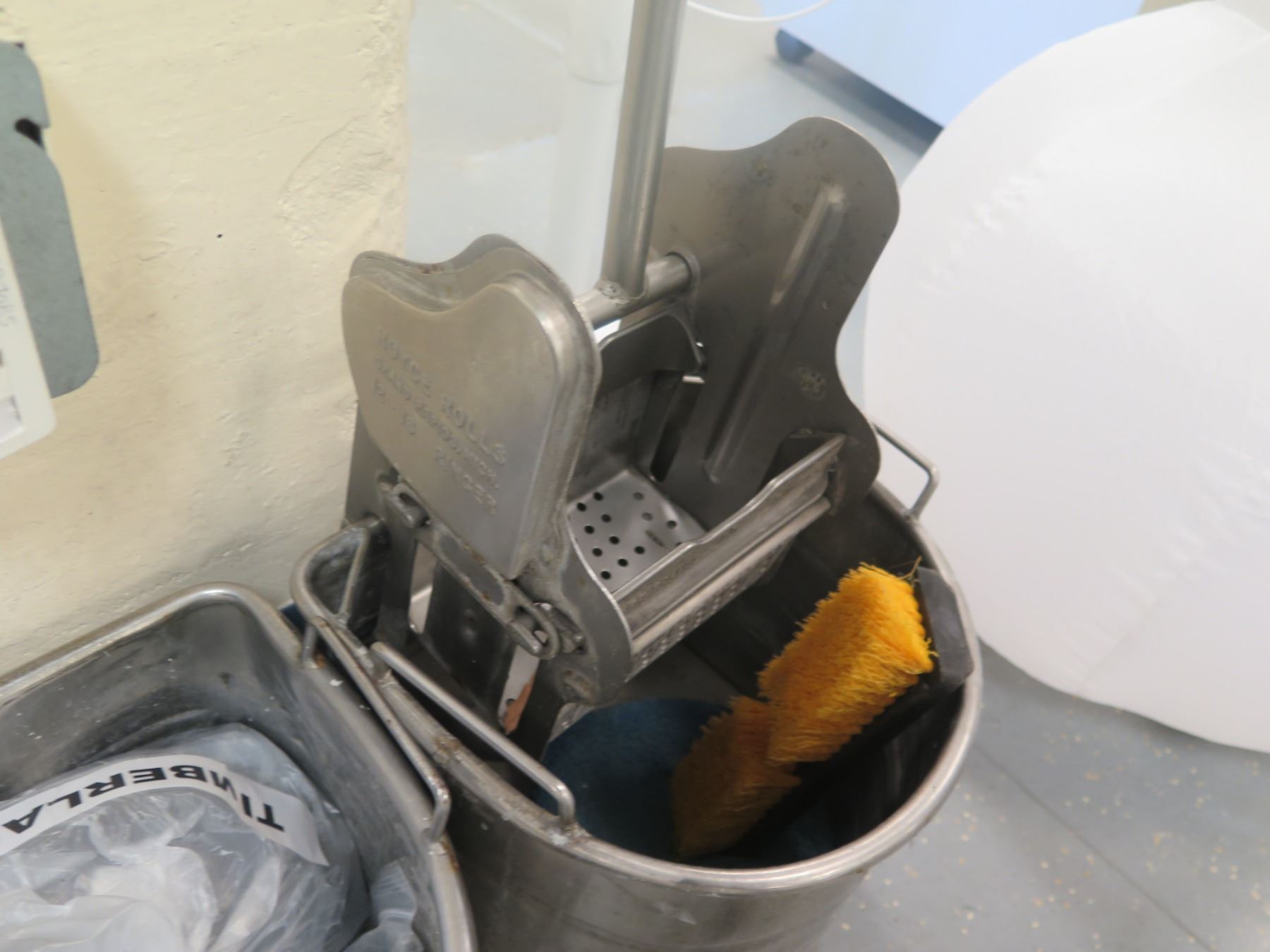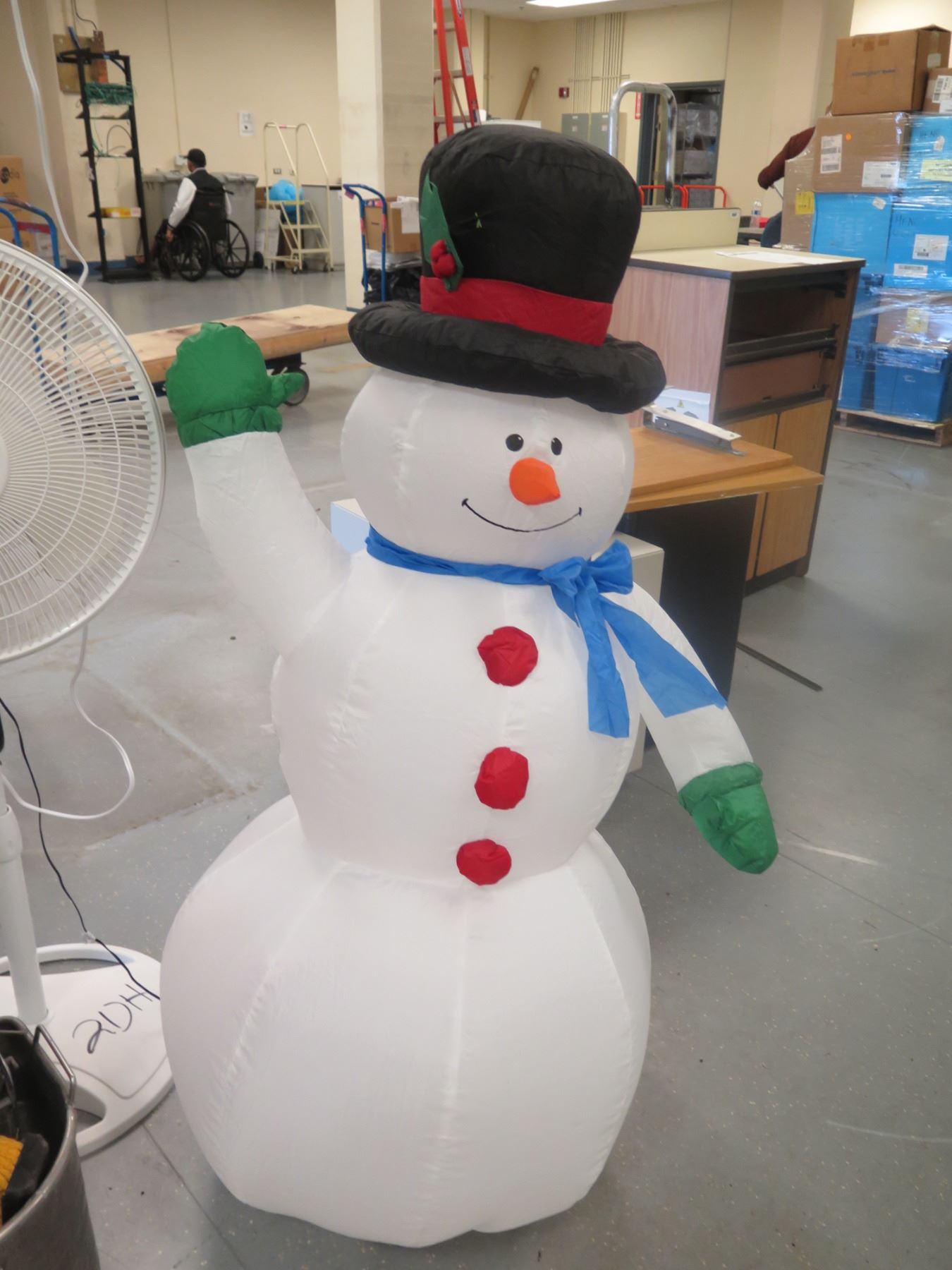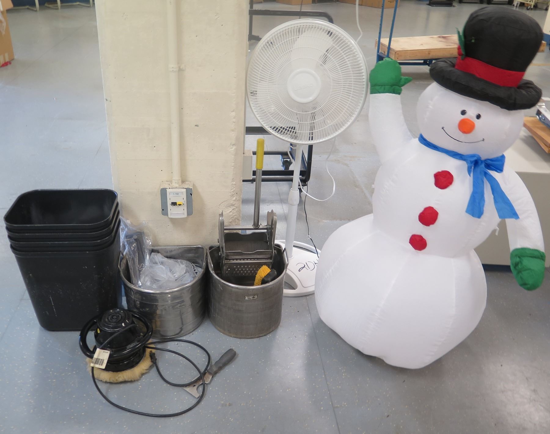 Misc Cleaning Equipment: Waste Cans, Mop Bucket, Fan, etc w/ Inflatable Snowman