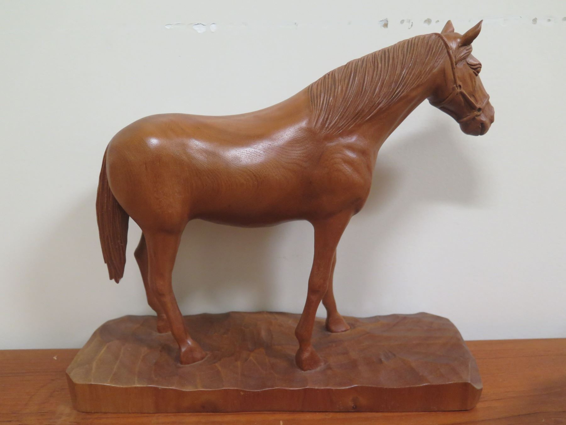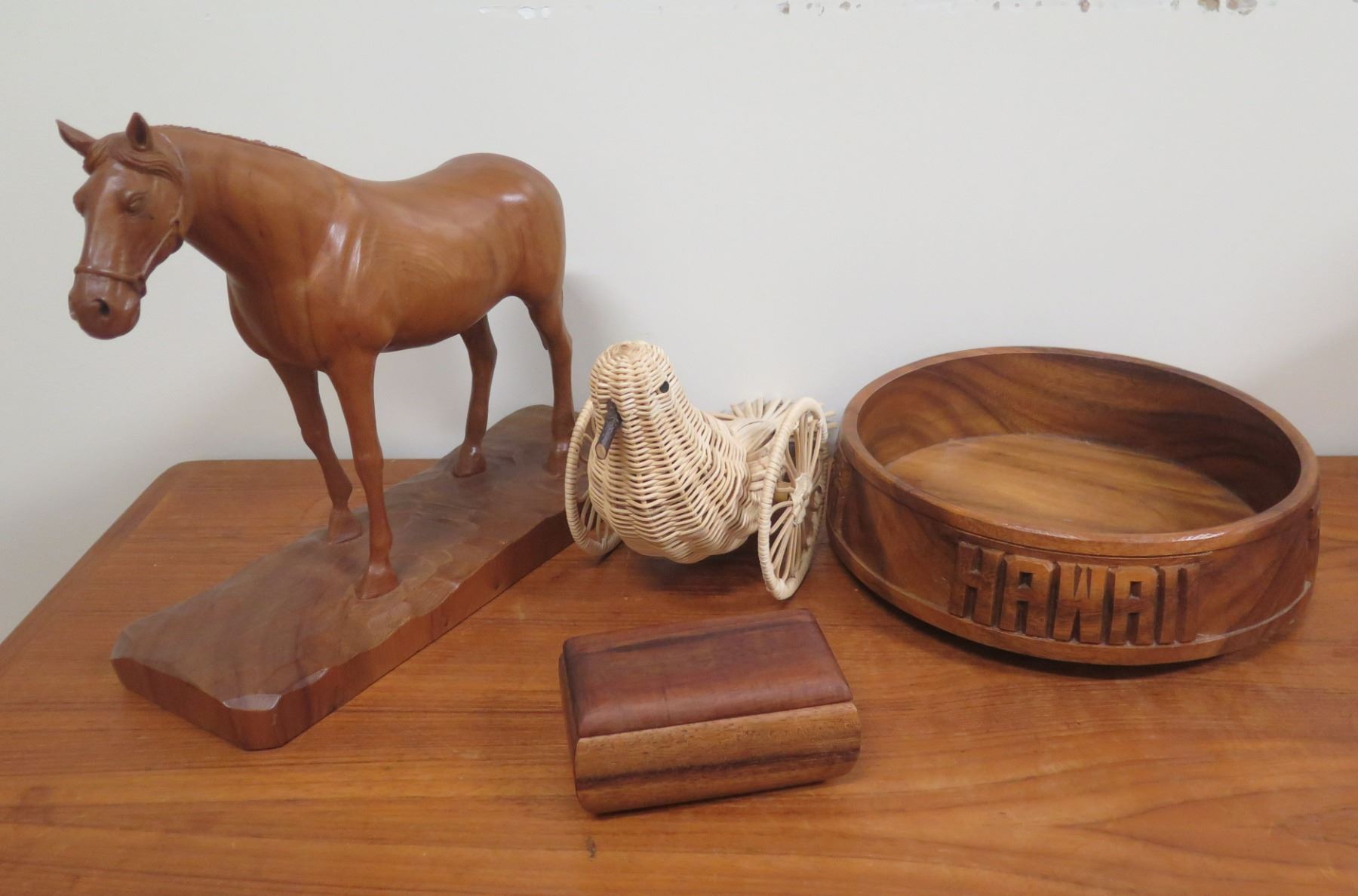 Misc Décor: Wooden Horse Statue, Monkeypod Bowl, Small Box & Wicker Cornucopia