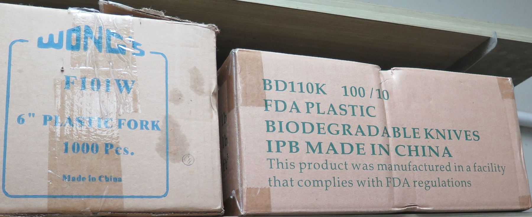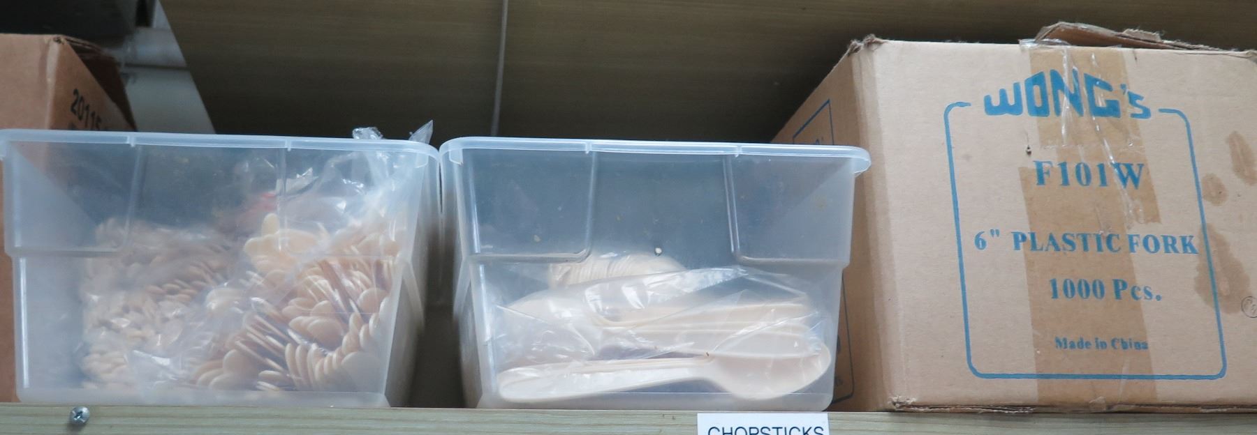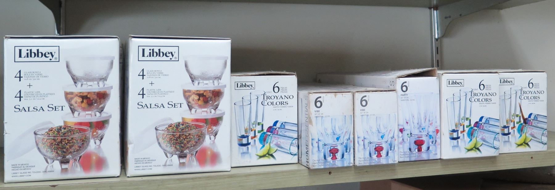 Misc. Glass Bowls, Glass Shooters, Boxes of Plastic Forks & Spoons