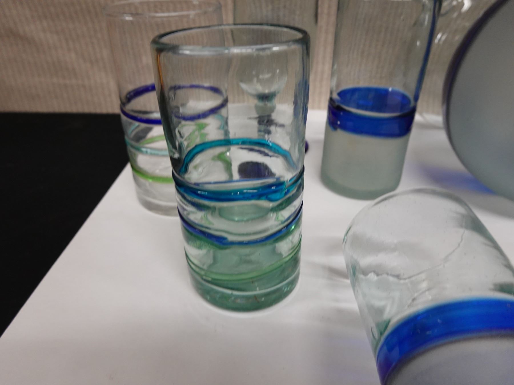 Misc Glassware w/ Blue Stripe: Glasses, Footed Goblet, Pitcher, etc Misc Sizes