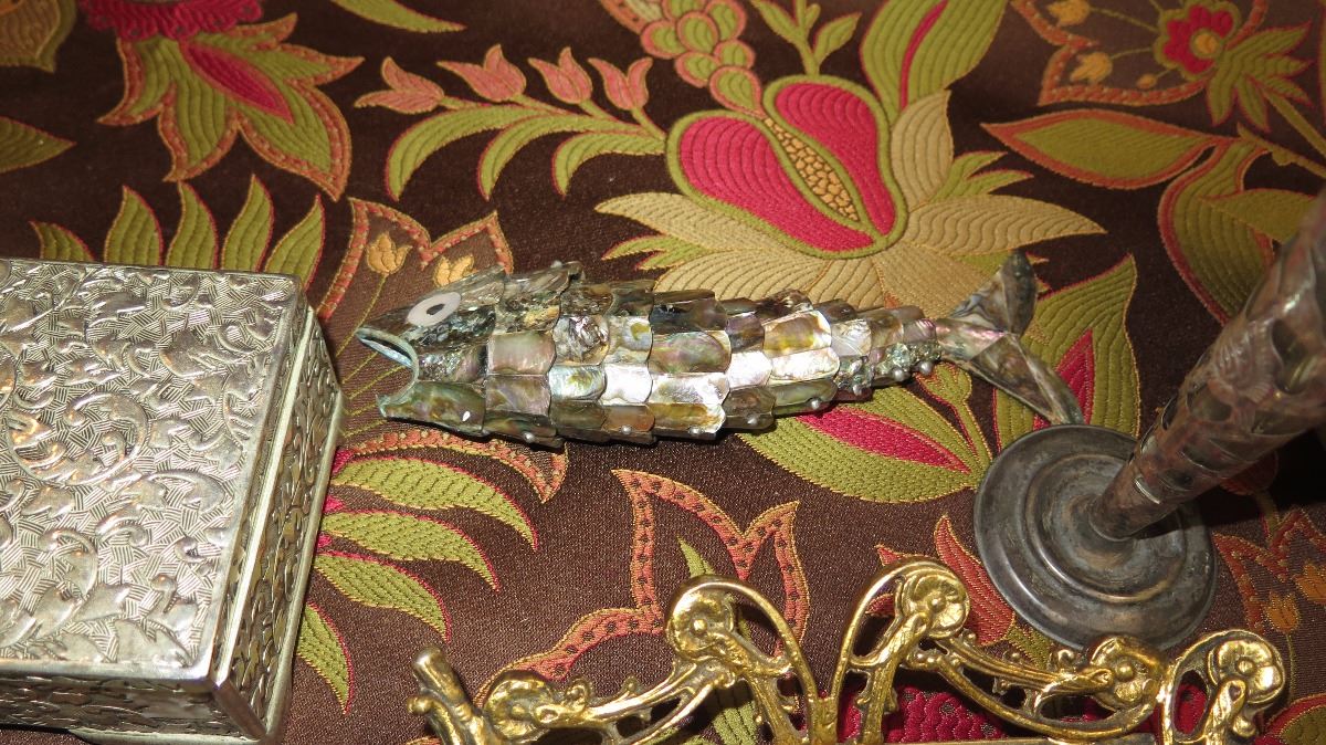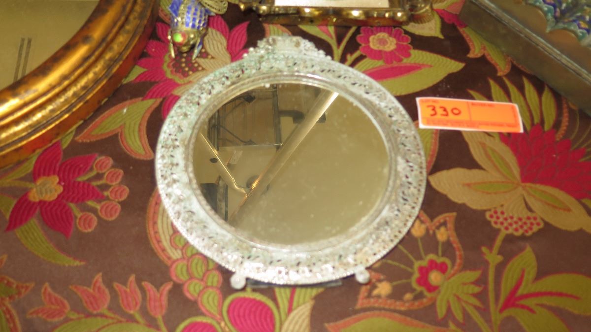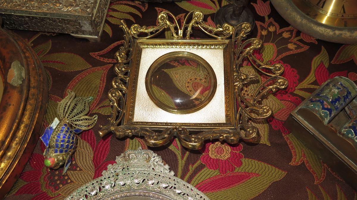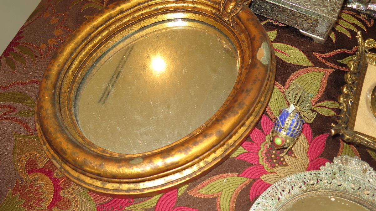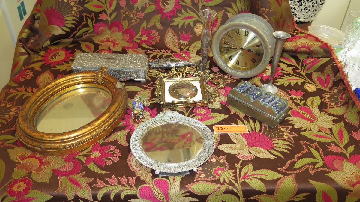 Misc. Lot: Bas Relief Silver Jewel Box, Mirrors, Ornamental Wall Hanging, Clock, Single Stem Vases