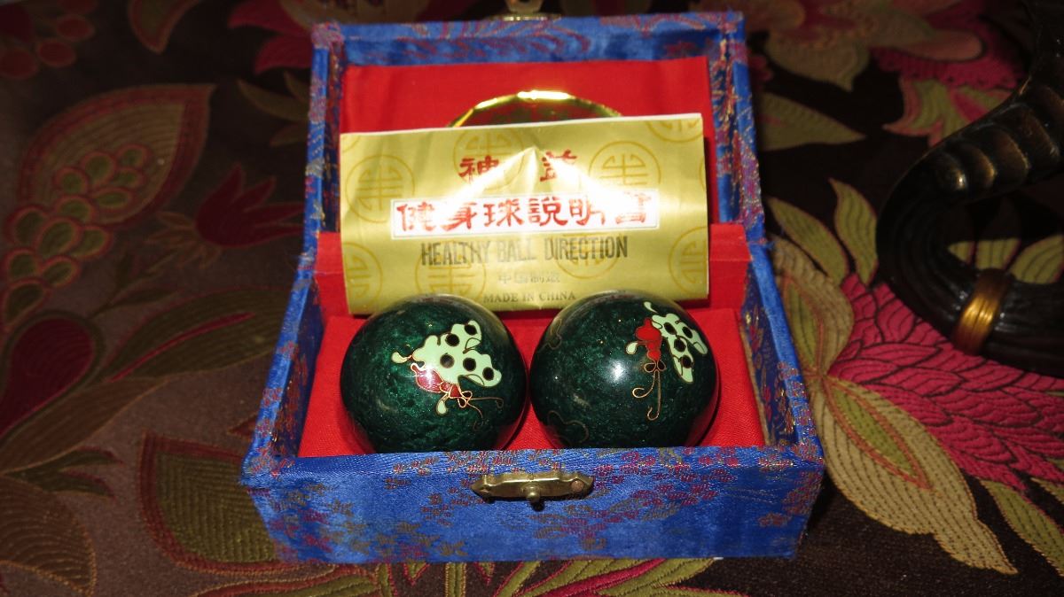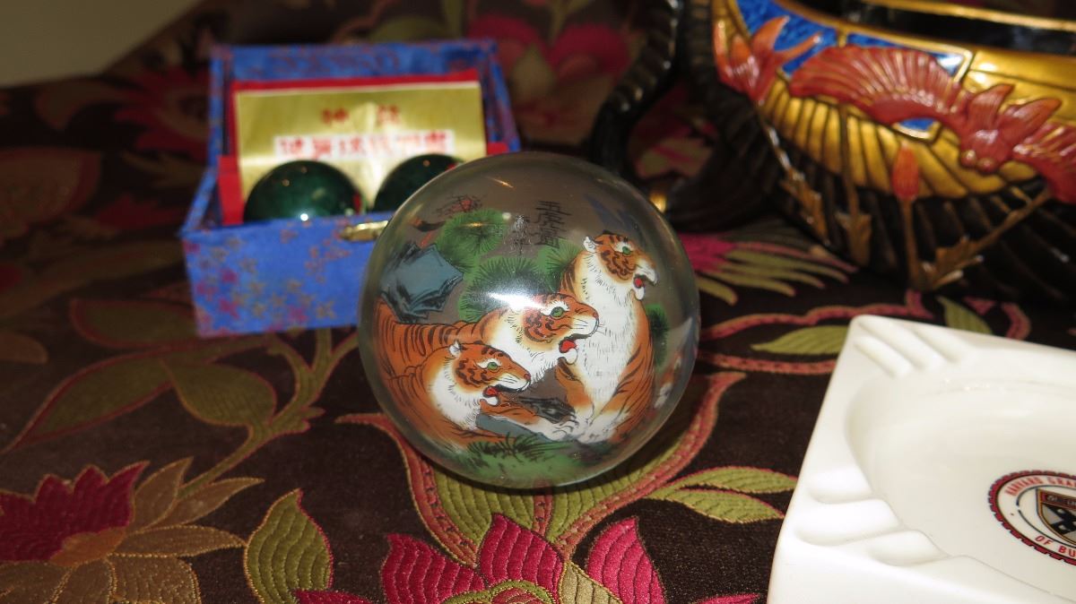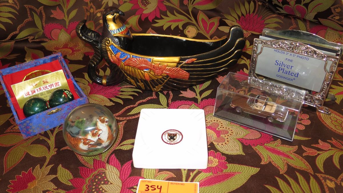 Misc. Lot: Miniature Collectible Car, Silver Plated Photo Album, Harvard Ceramic Ashtray, Chinese Balls, etc.
