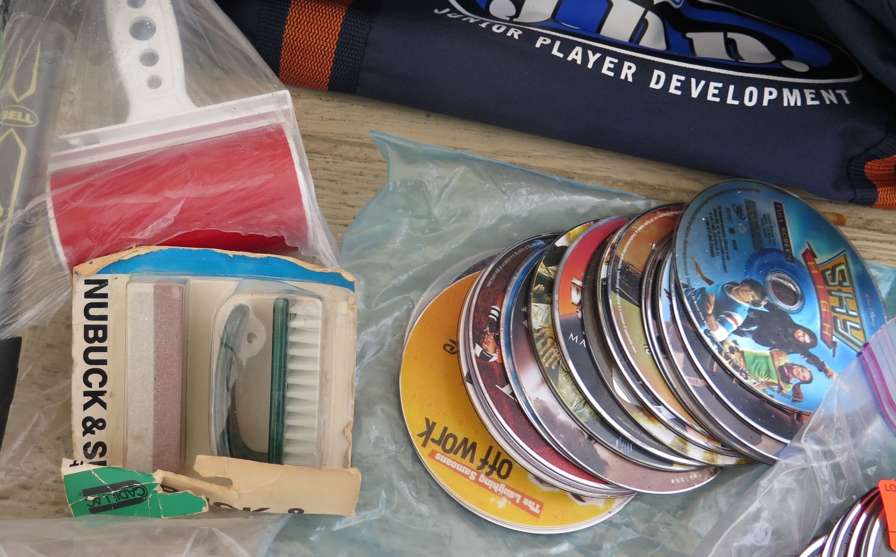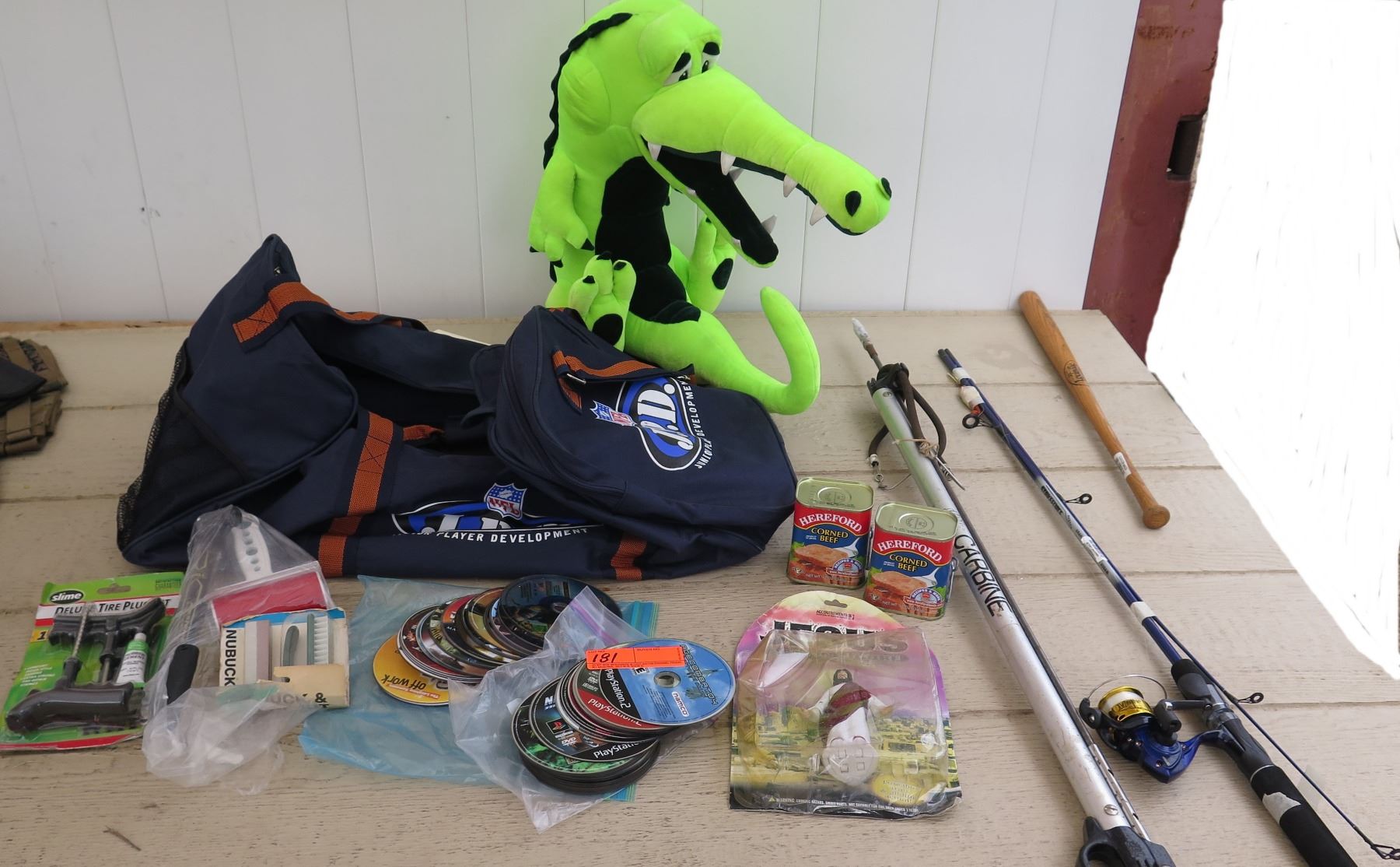 Misc. Lot - NFL Duffel Bag, Spear Gun, Fishing Pole, Jesus Figure, CDs, etc.