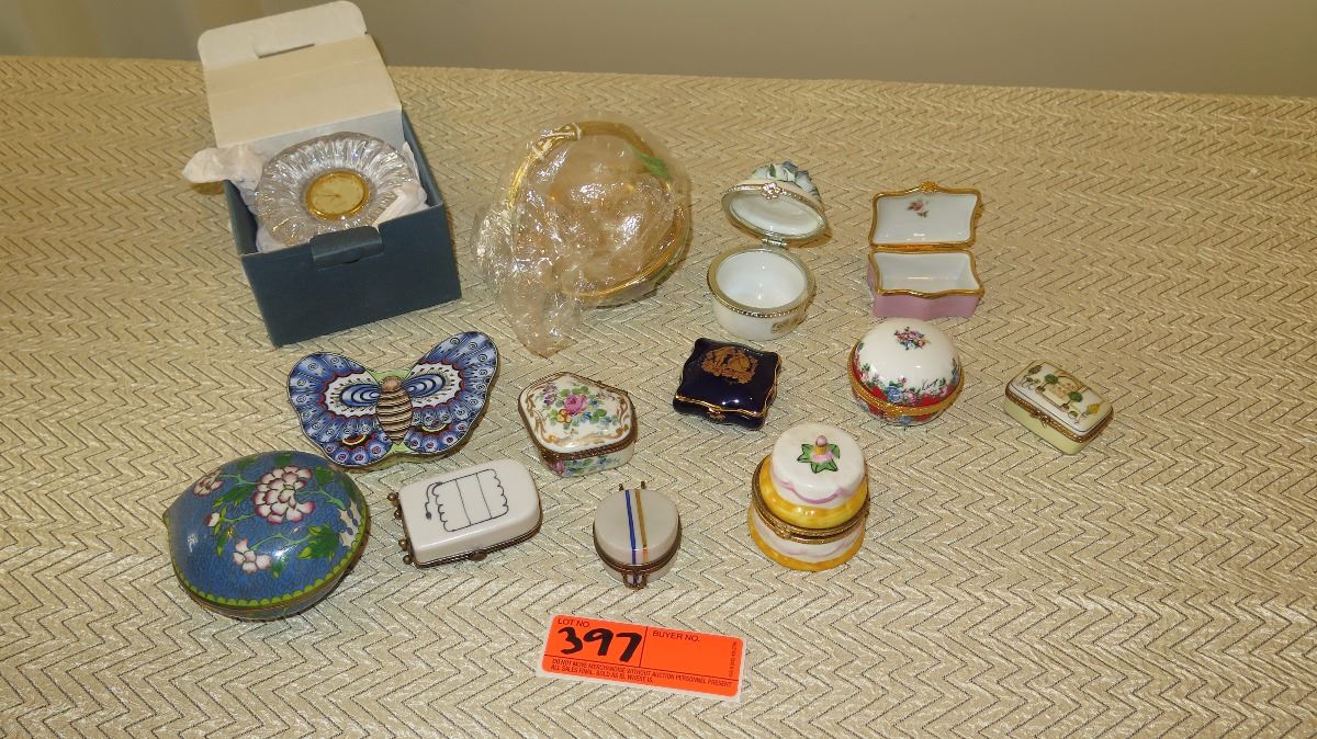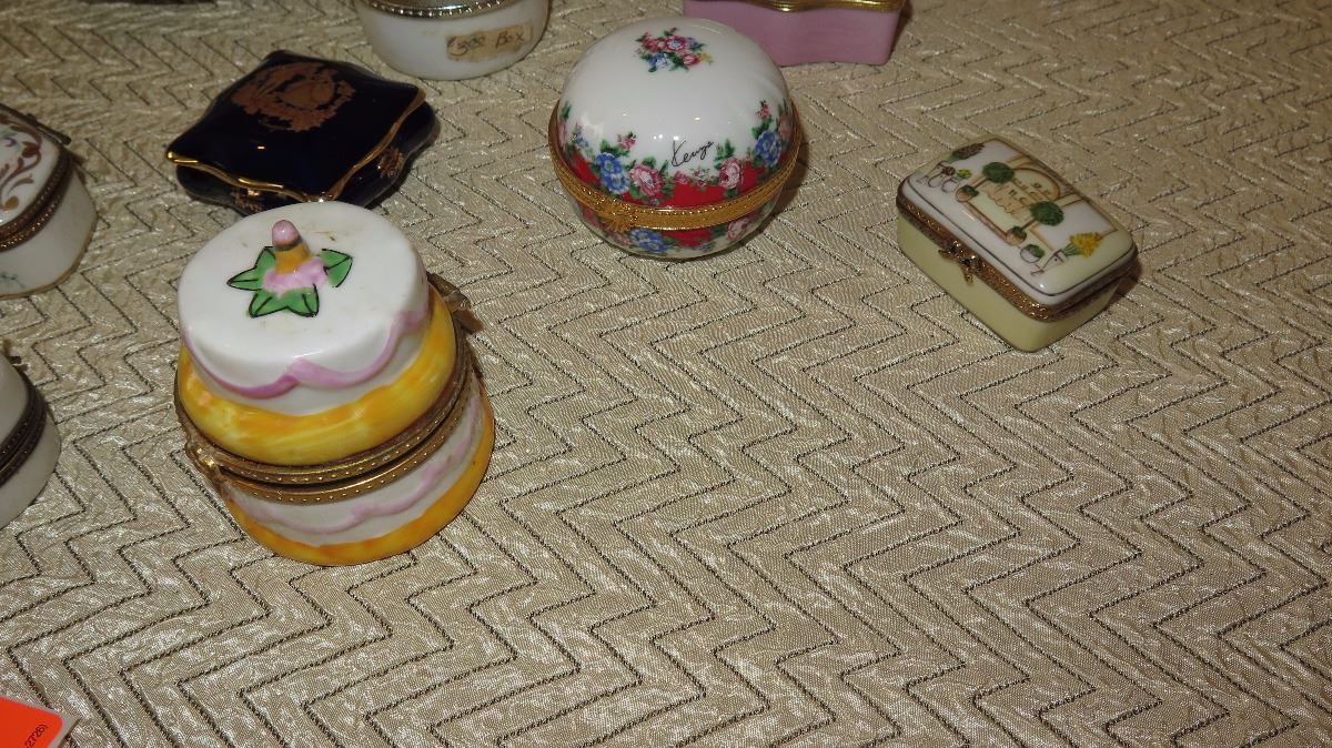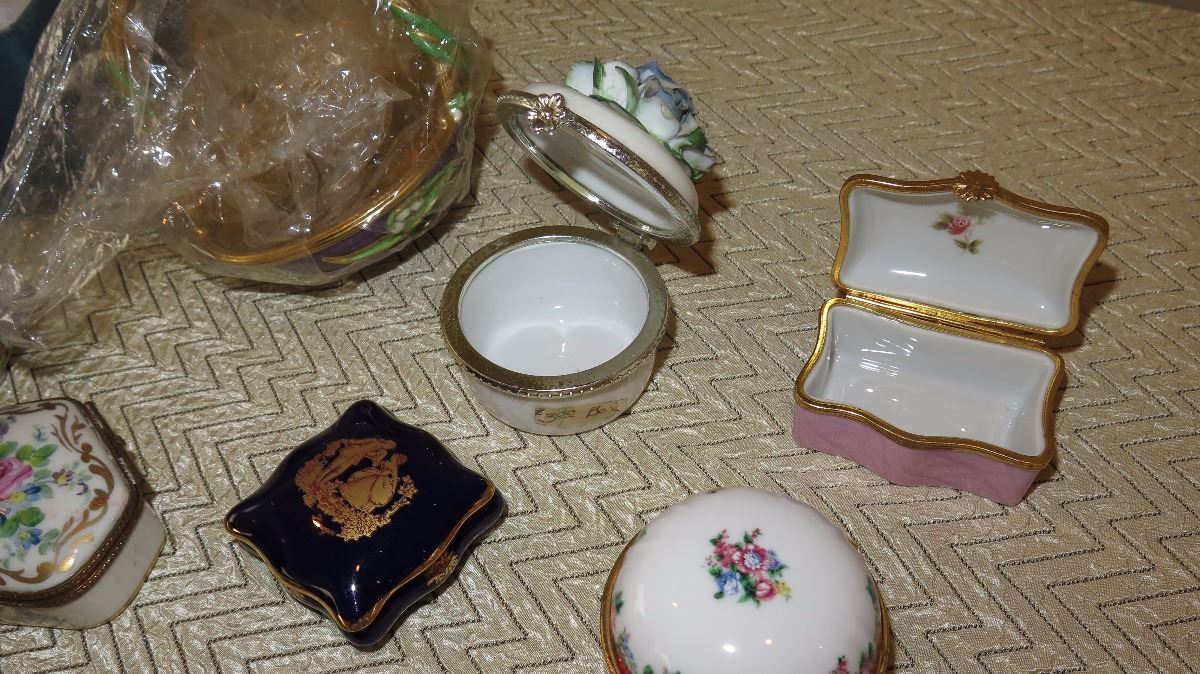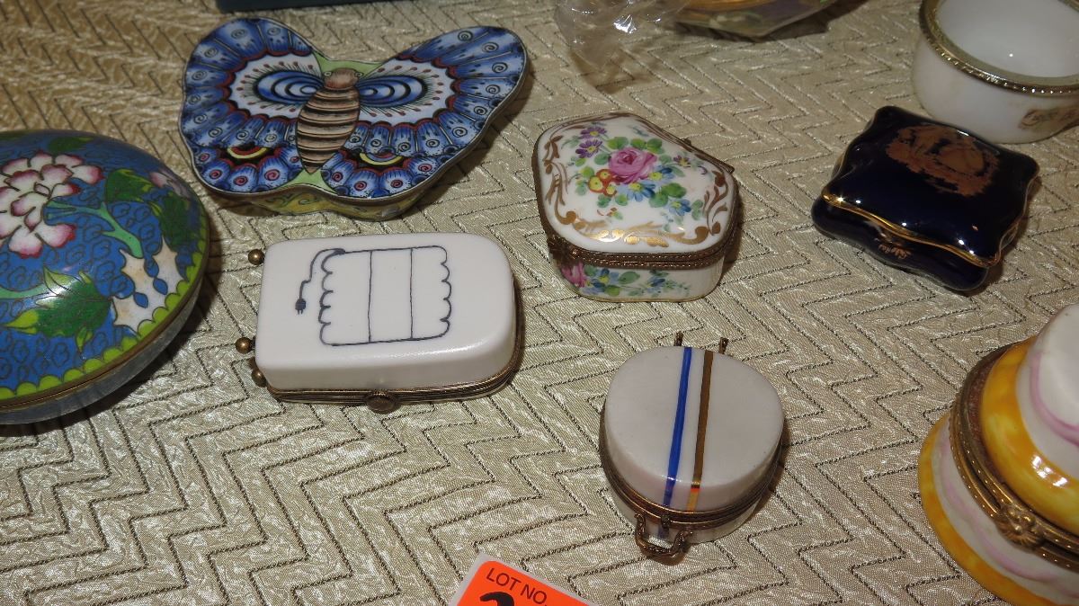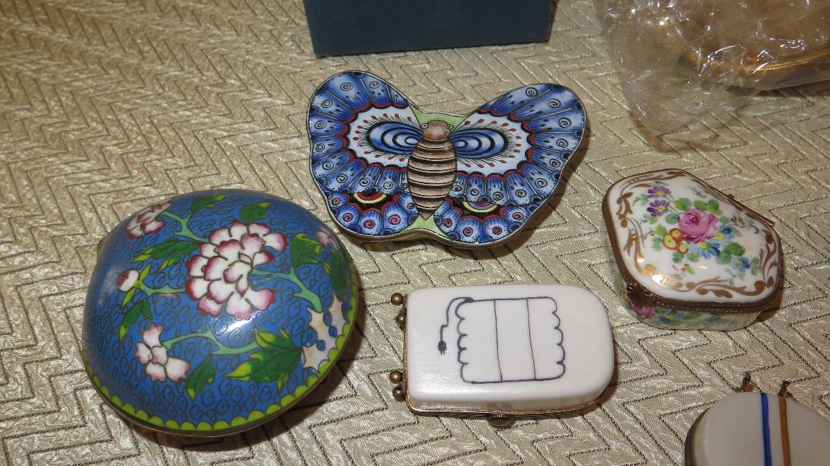 Misc. Lot of Cloisonne, Porcelain, Limoges Trinket Boxes, Pill Boxes, Miniature Collectibles, Clock, etc.