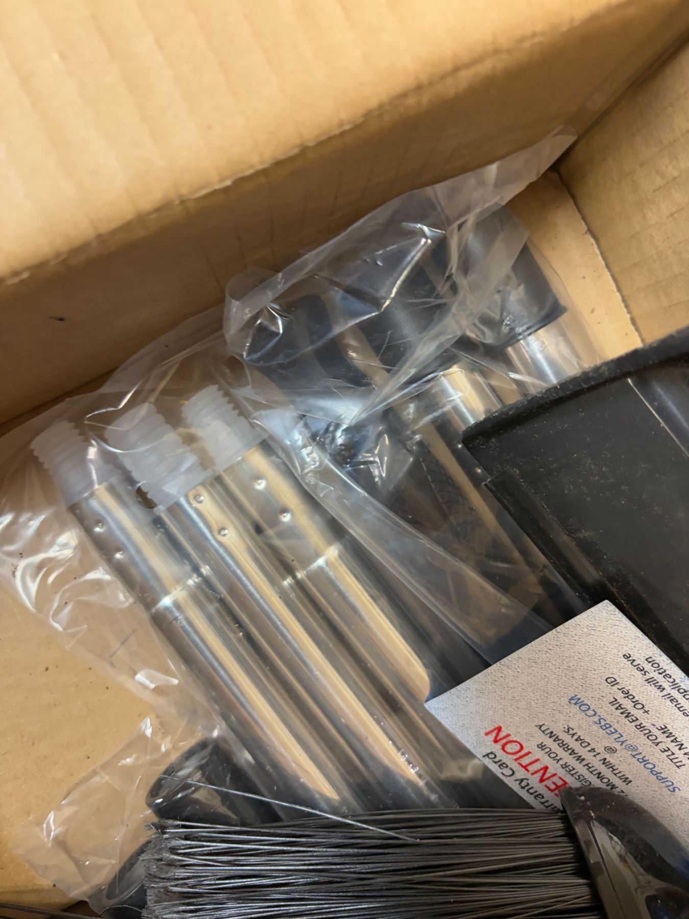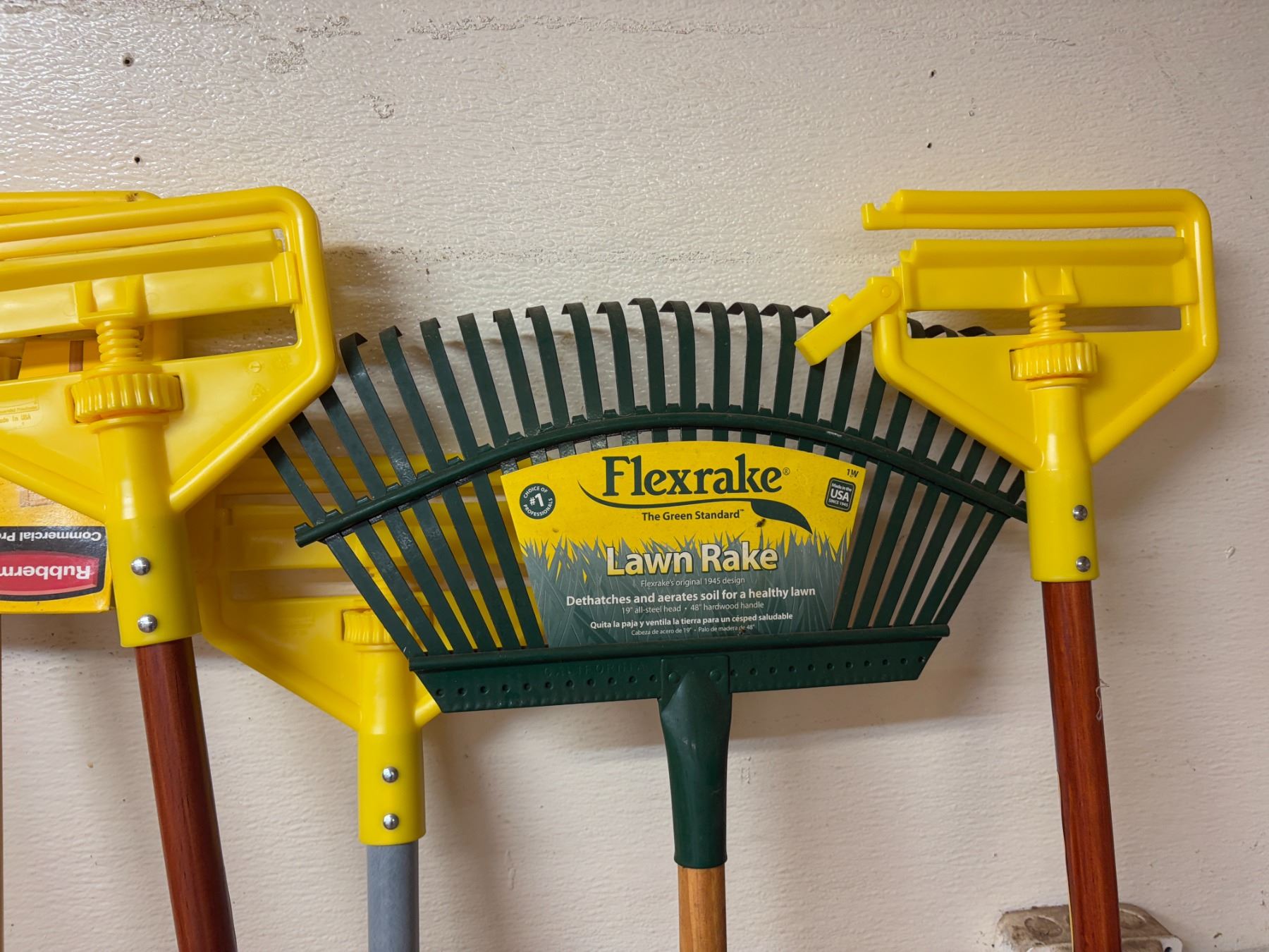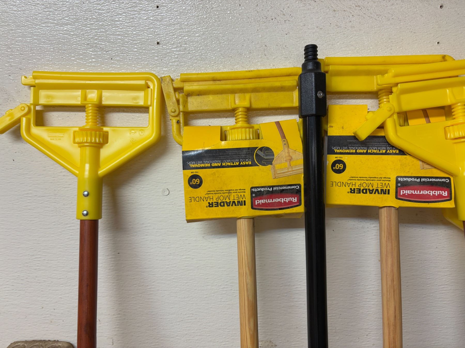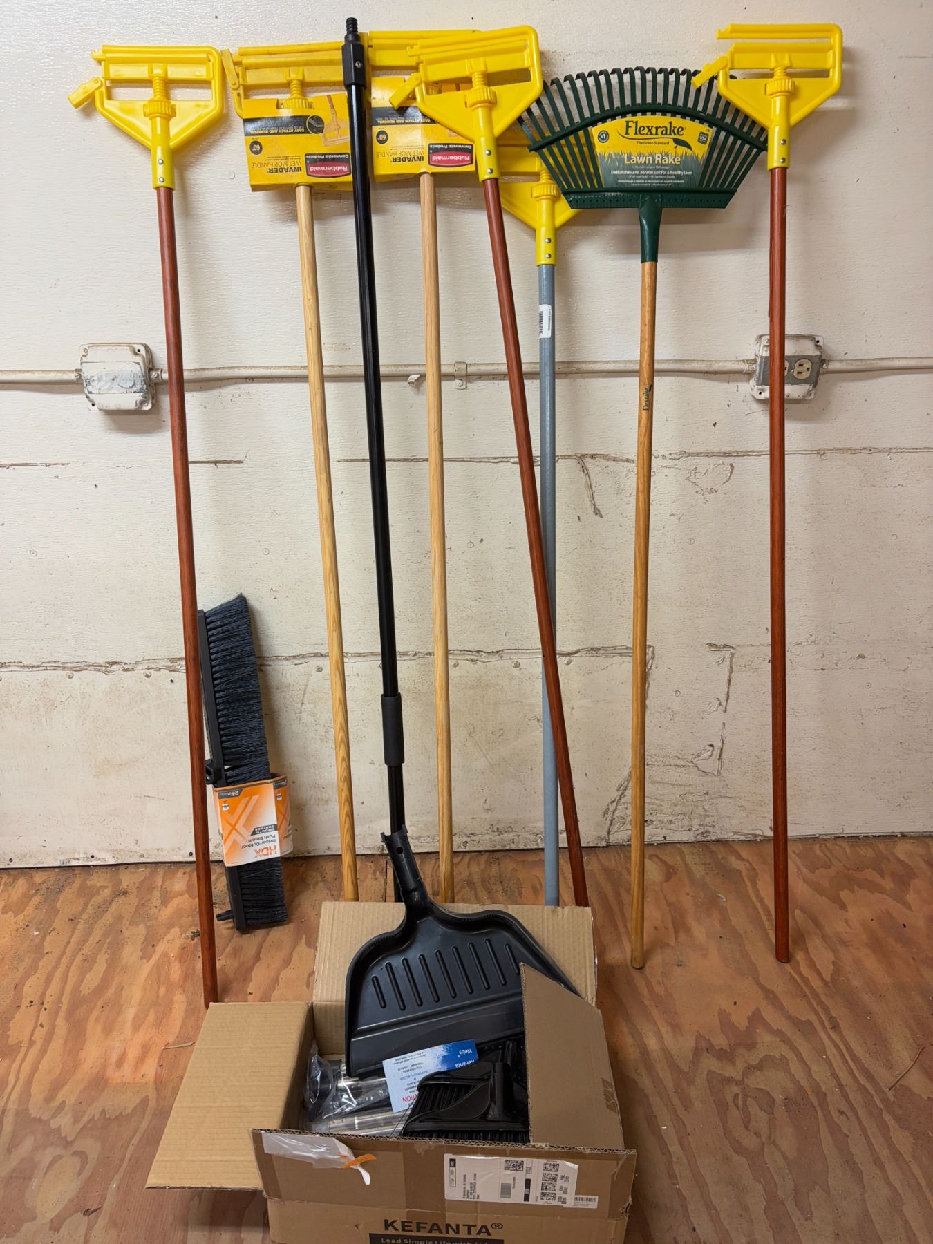 Misc. Mop Handles, Lawn Rake, Broom Sticks, Broom Parts. These appear to be unused.