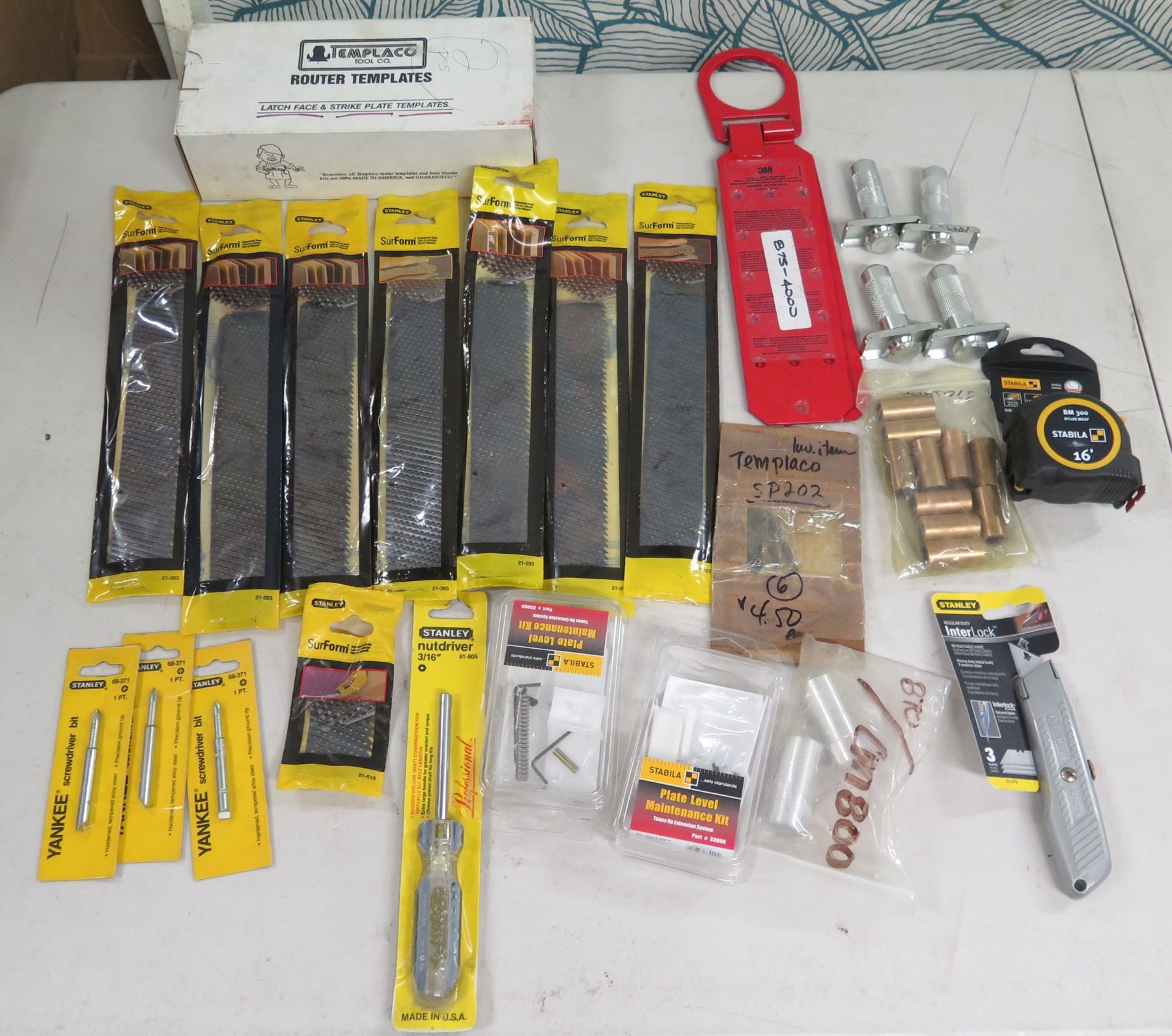 Misc Tools: Stanley SurForm Blades, 3M Roof Anchor, Templaco Router Templates, Stabila Kit, etc