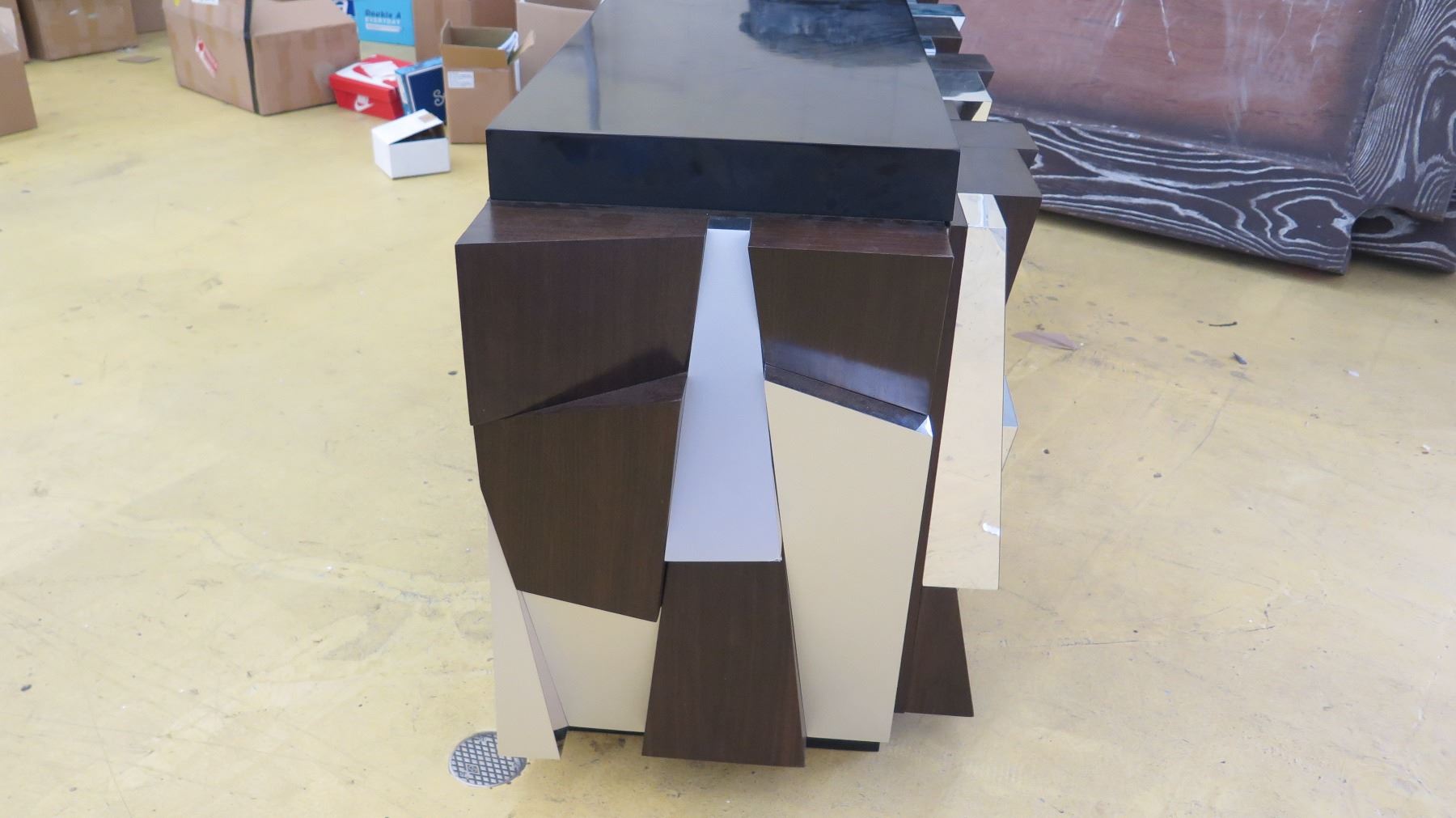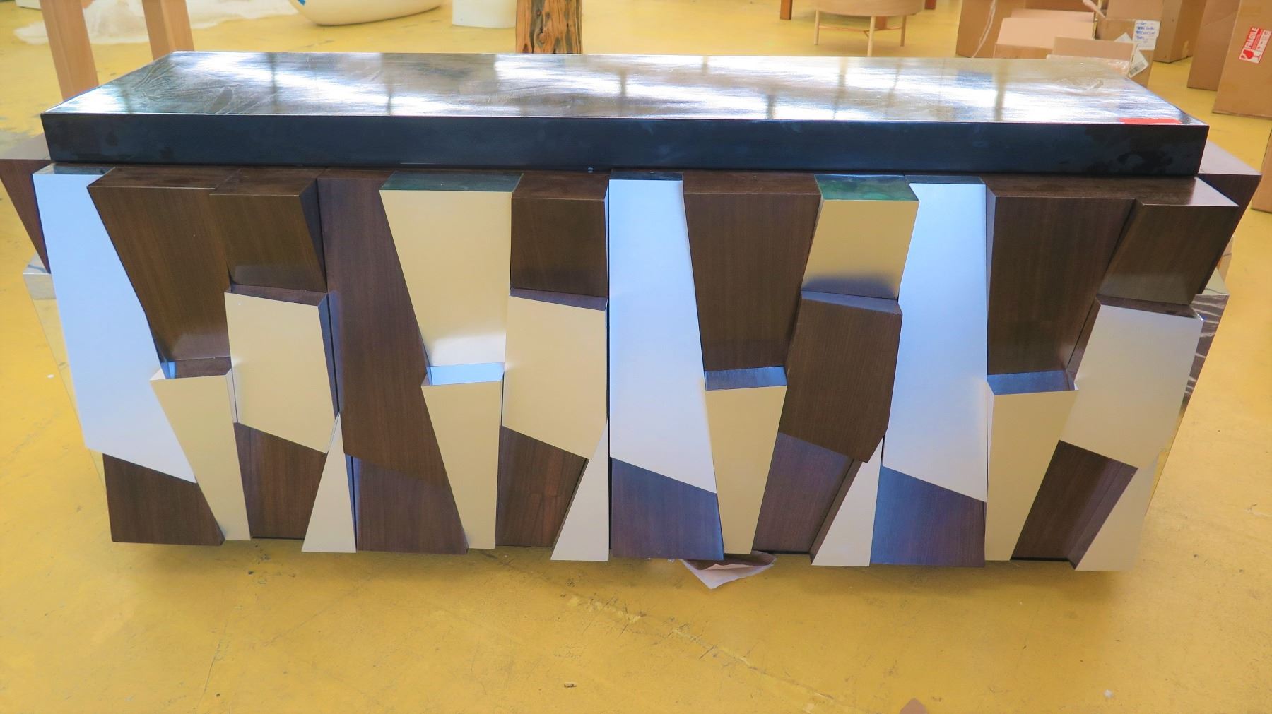 Modern Cabinet w/Geometric Brushed Metal/Dark Wood Facade, Mirrored Accents, 80" Overall Length, 24"