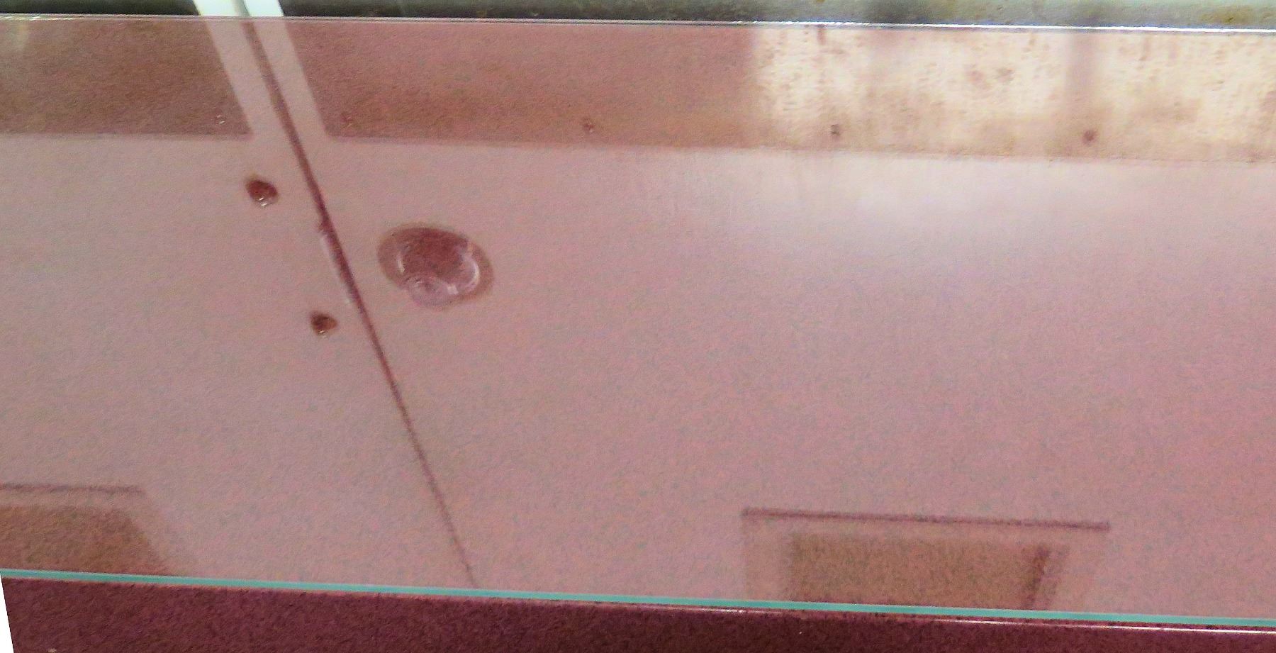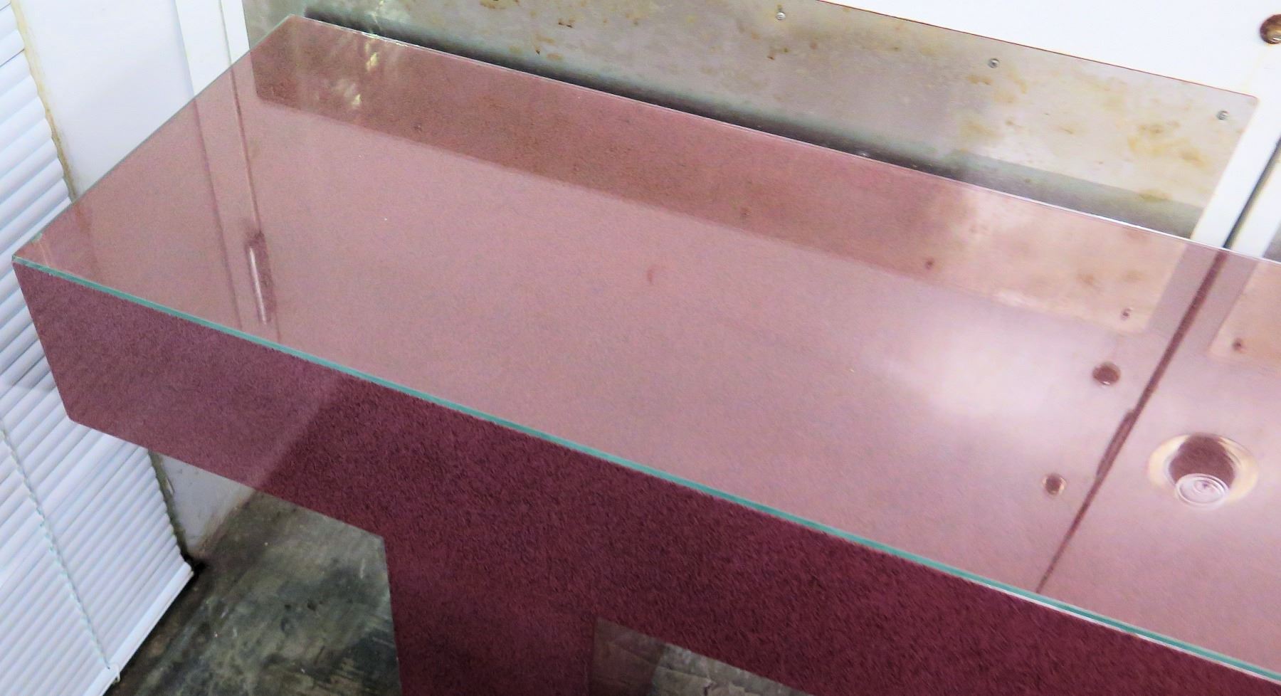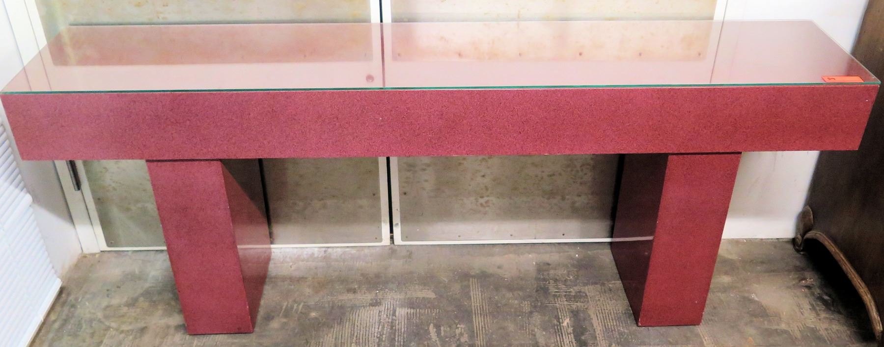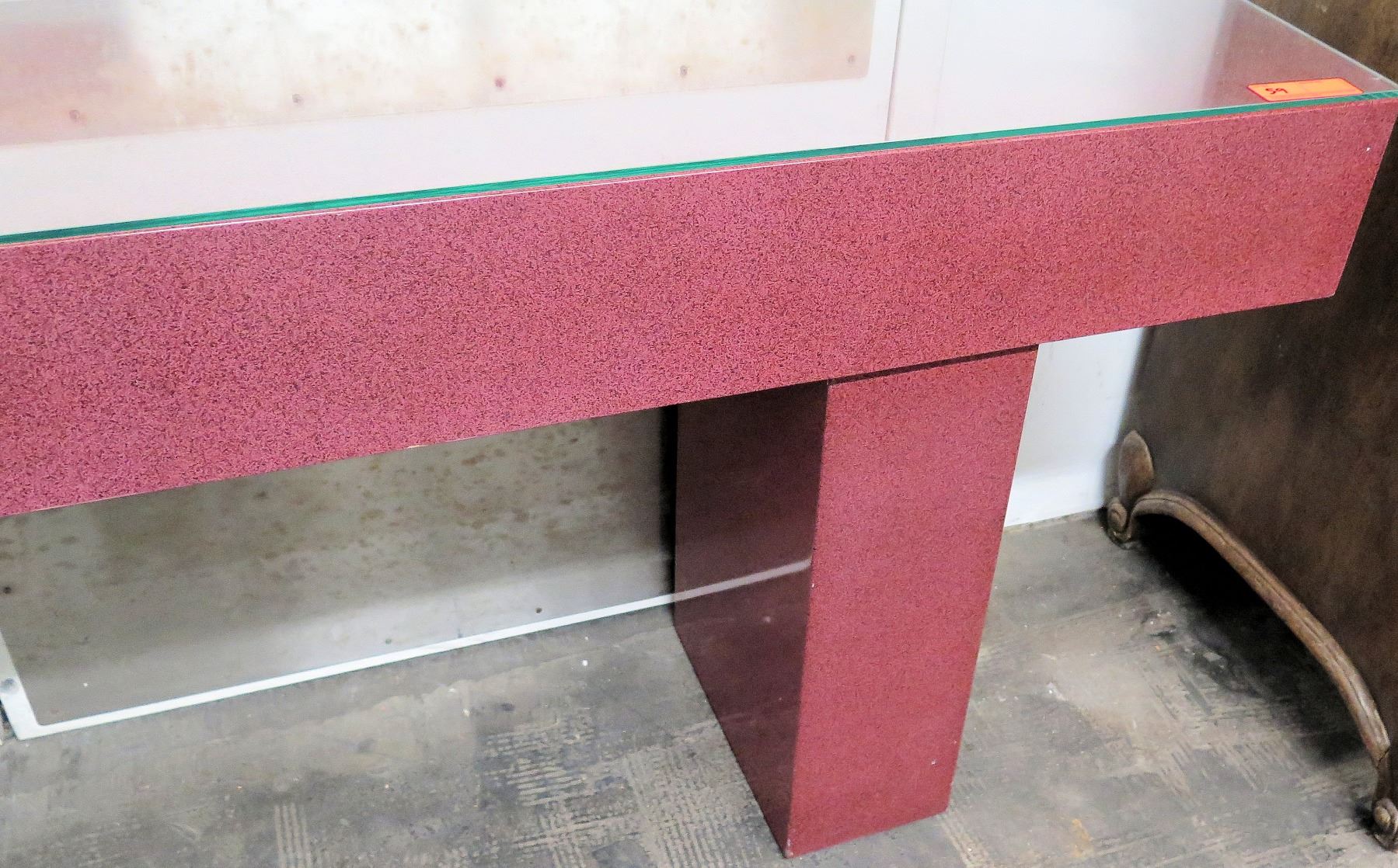 Modern Pink Composite Console Table w/ Glass Top, Synthetic Material 78" x 15" x 30". This can be seen in a photo with Jim Nabors in his home that was sold earlier this year. See last photo.