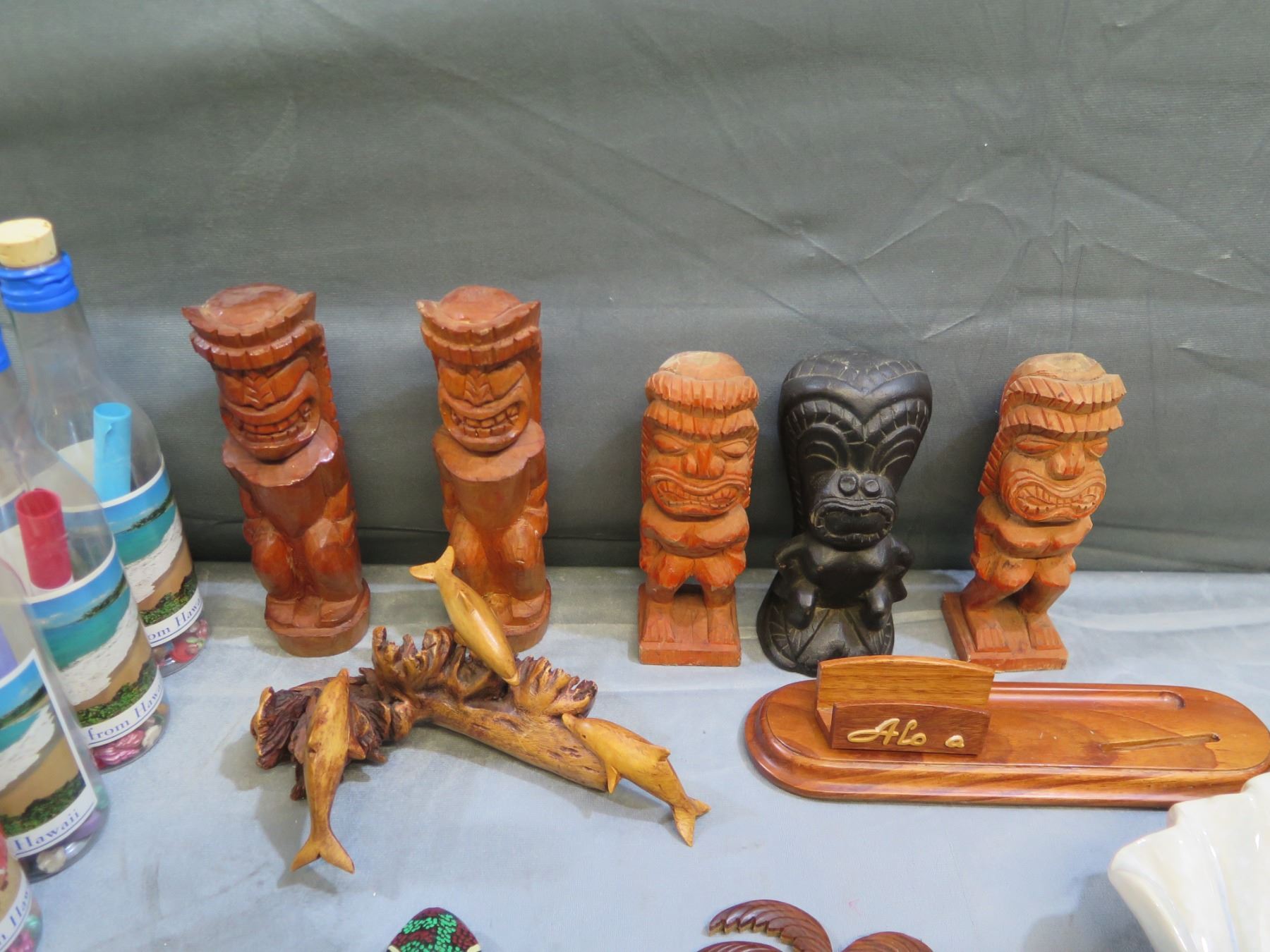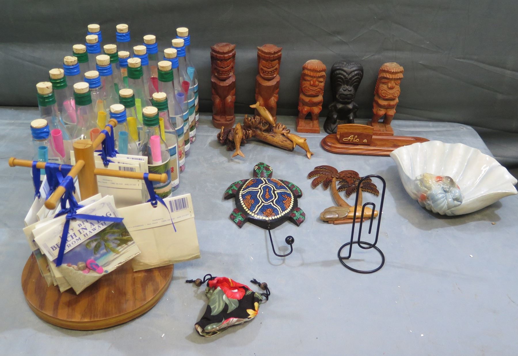 Multiple Aloha from Hawaii Postage Bottles, Beach in a Bag, Tiki Figures, Carved Dolphins, etc (unused)
