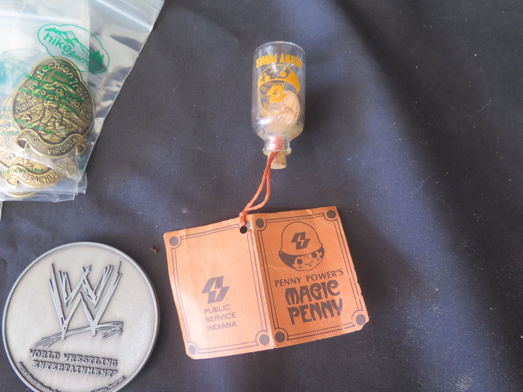 Multiple Appalachian Trail Metal Pins, Entertainment Pins, Magic Penny, Misc Medals, etc
