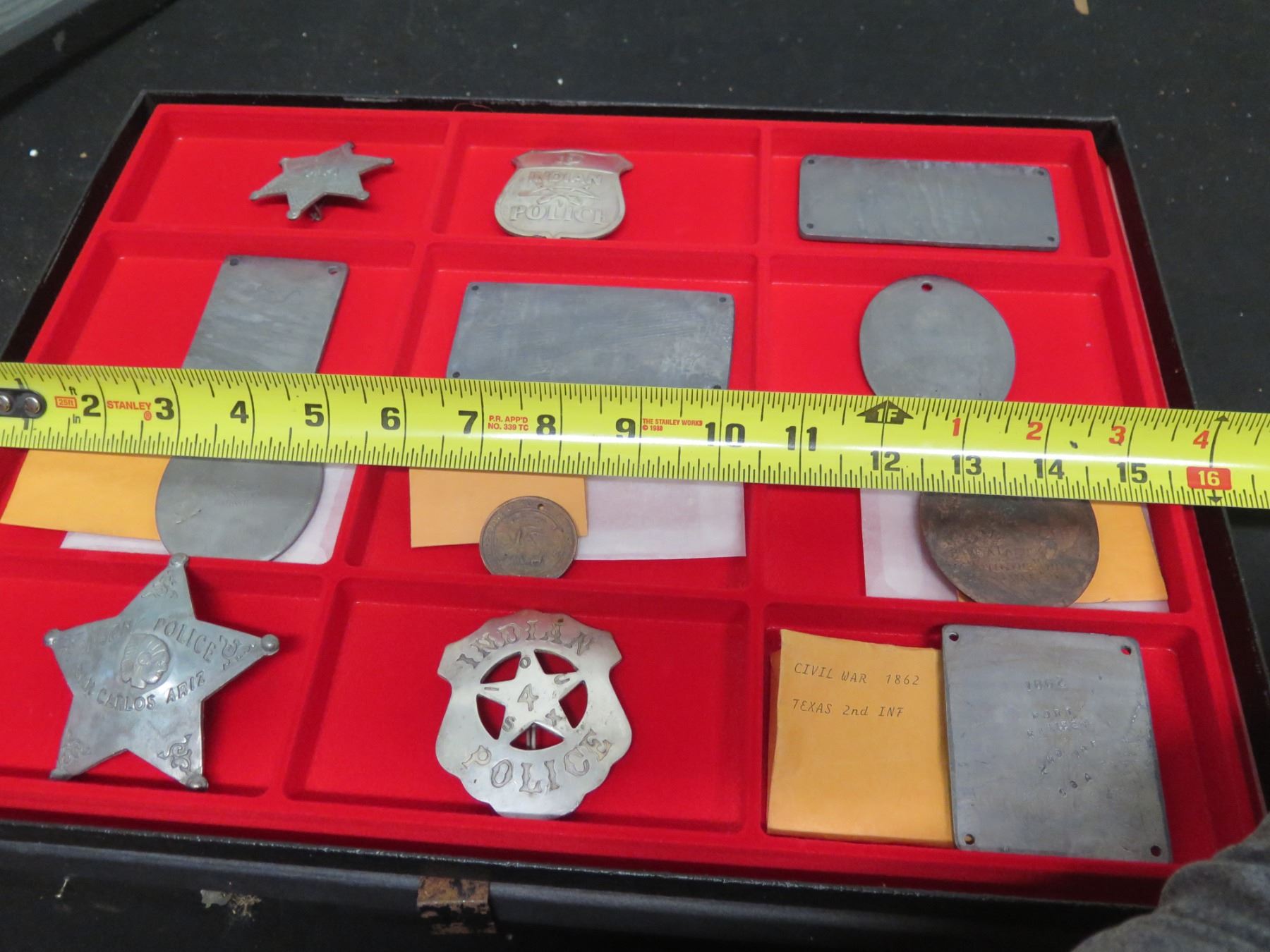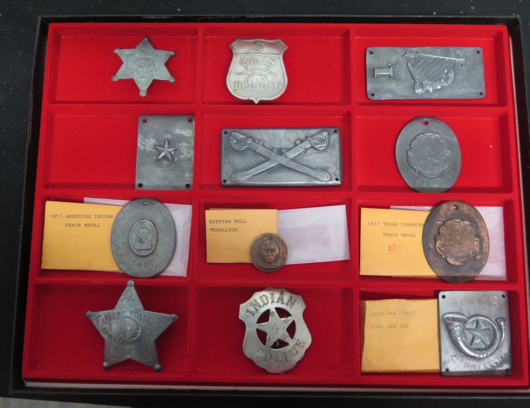 Multiple Badges & Pins: Indian Police, Civil War, 1817 American Peace Medal, Sitting Bull, etc in Case