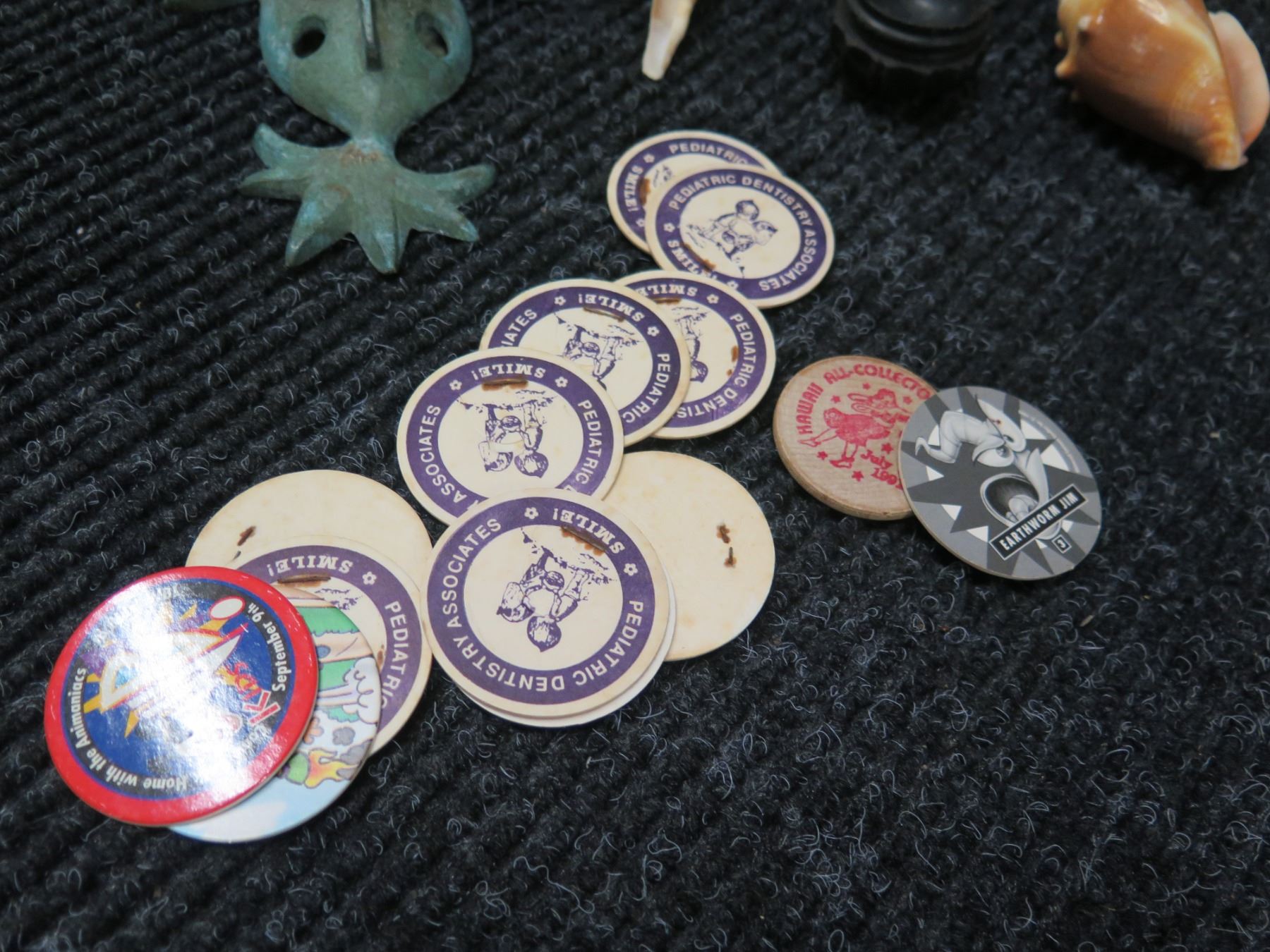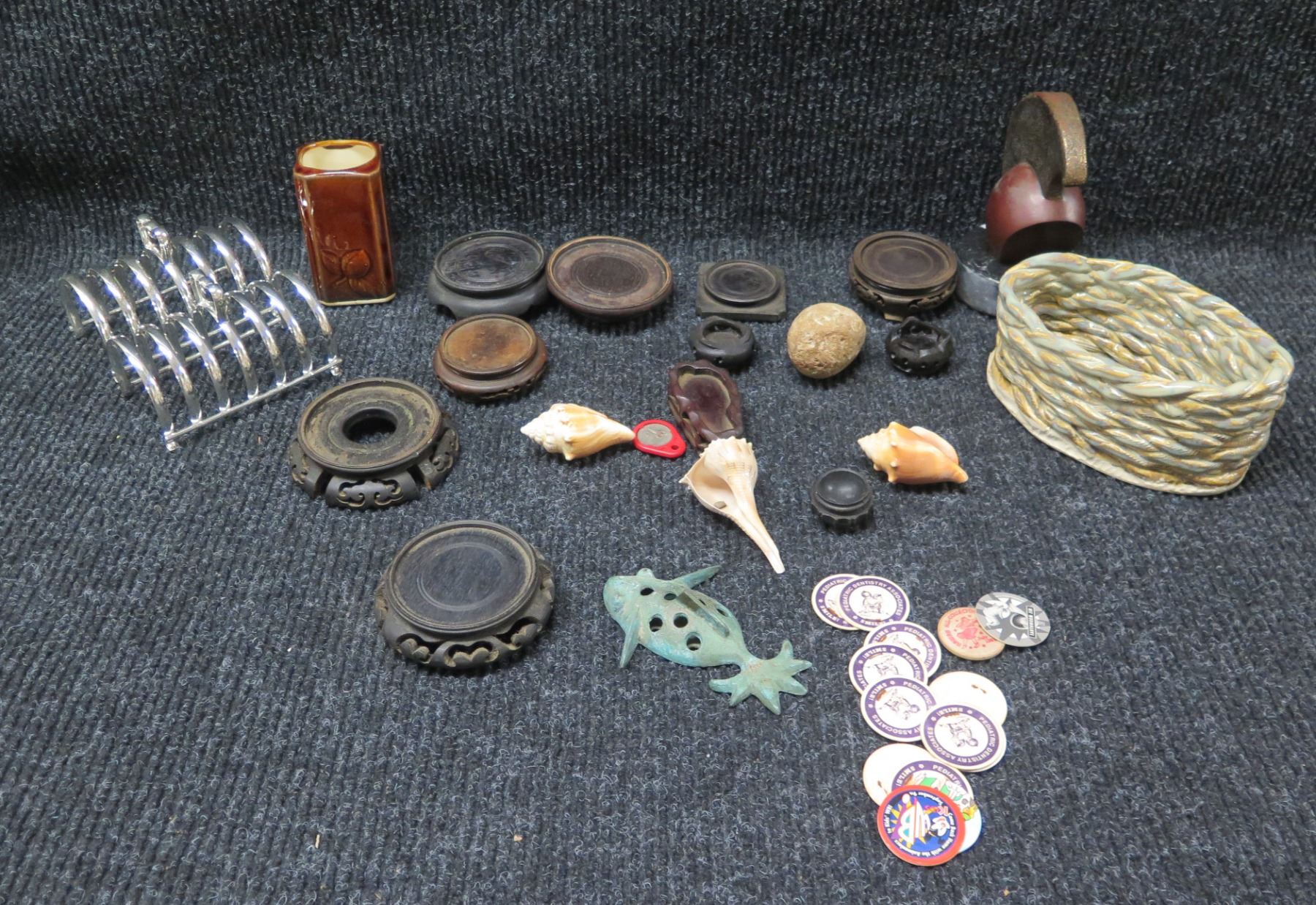 Multiple Base Stands, Metal Holder, Warrior Helmet Figurine, Shells, etc