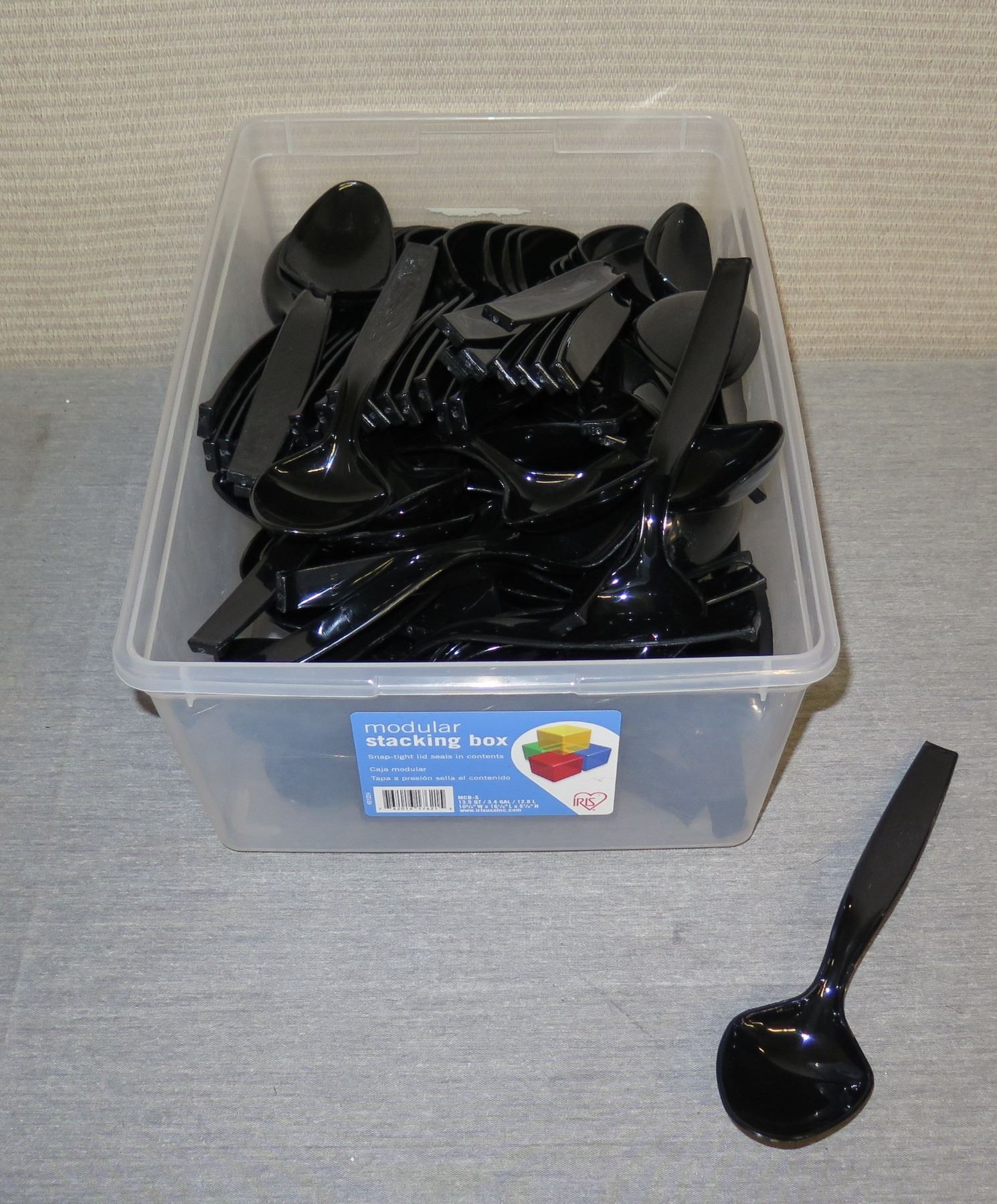 Multiple Black Plastic Serving Spoons 10"L in Plastic Bin