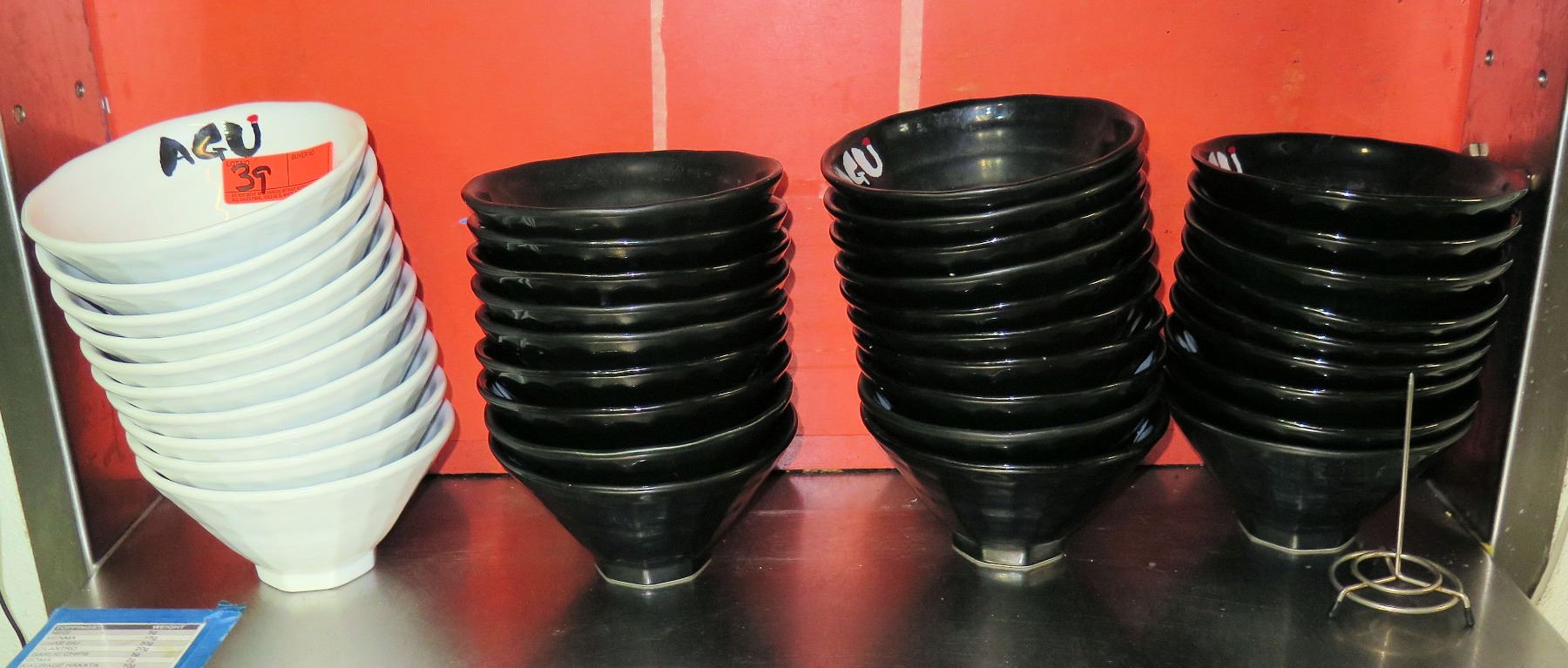 Multiple Black & White Ceramic Saimin Bowls w/ Agu Logo