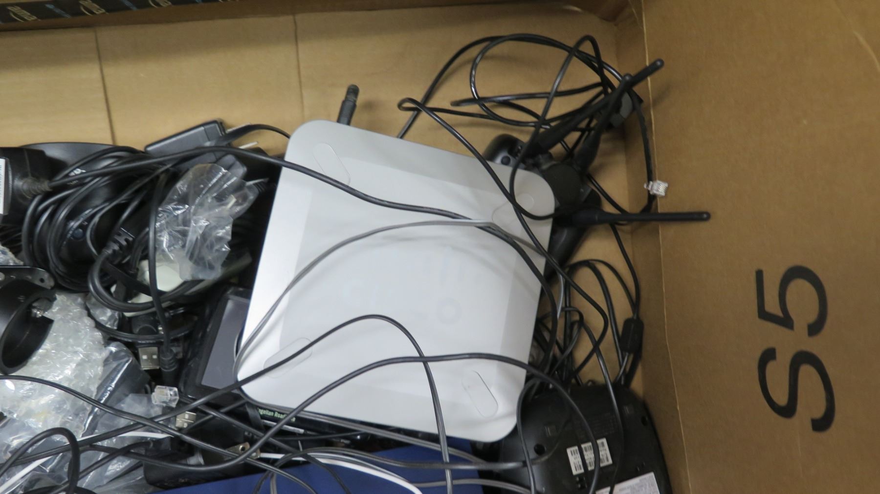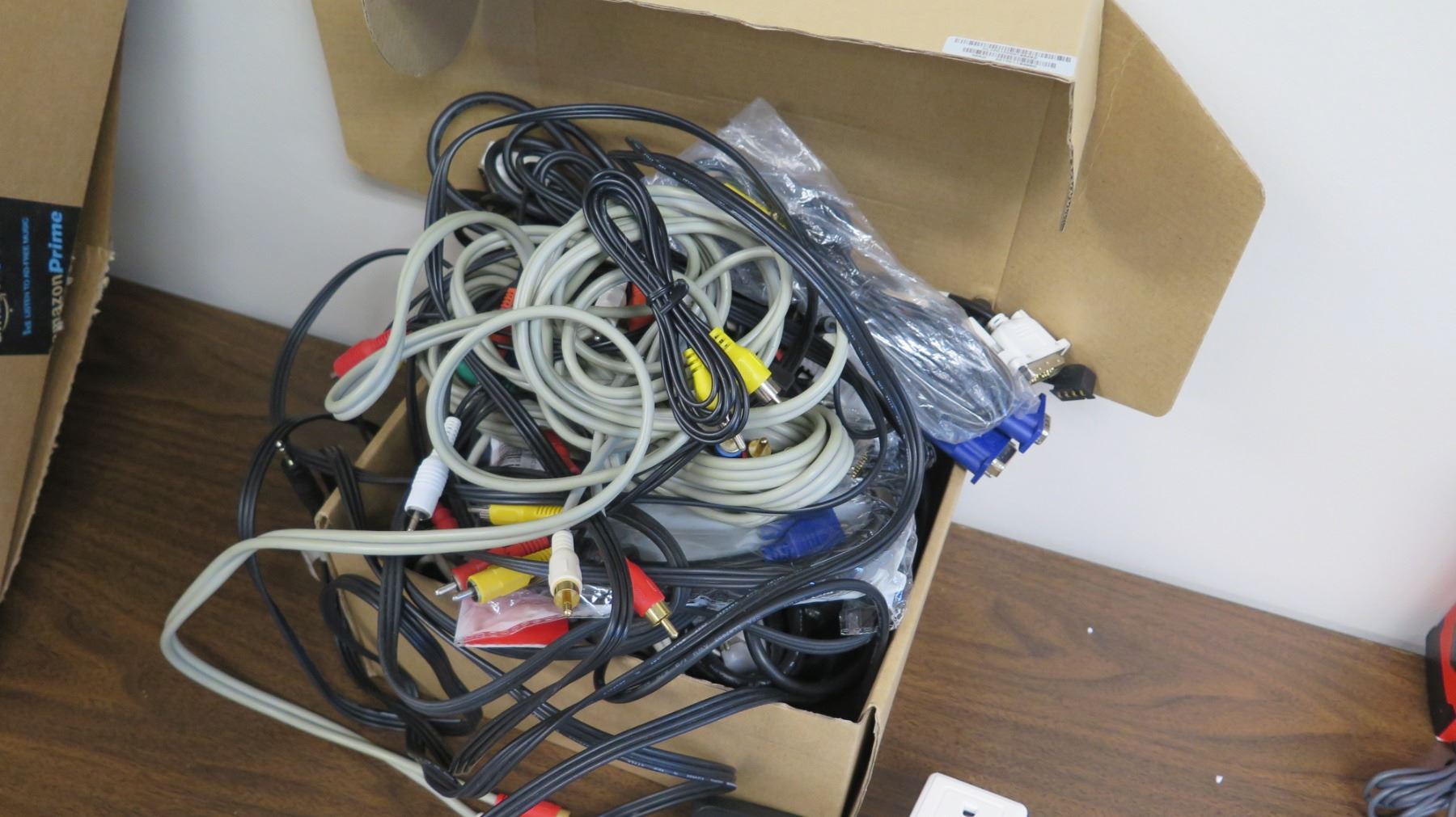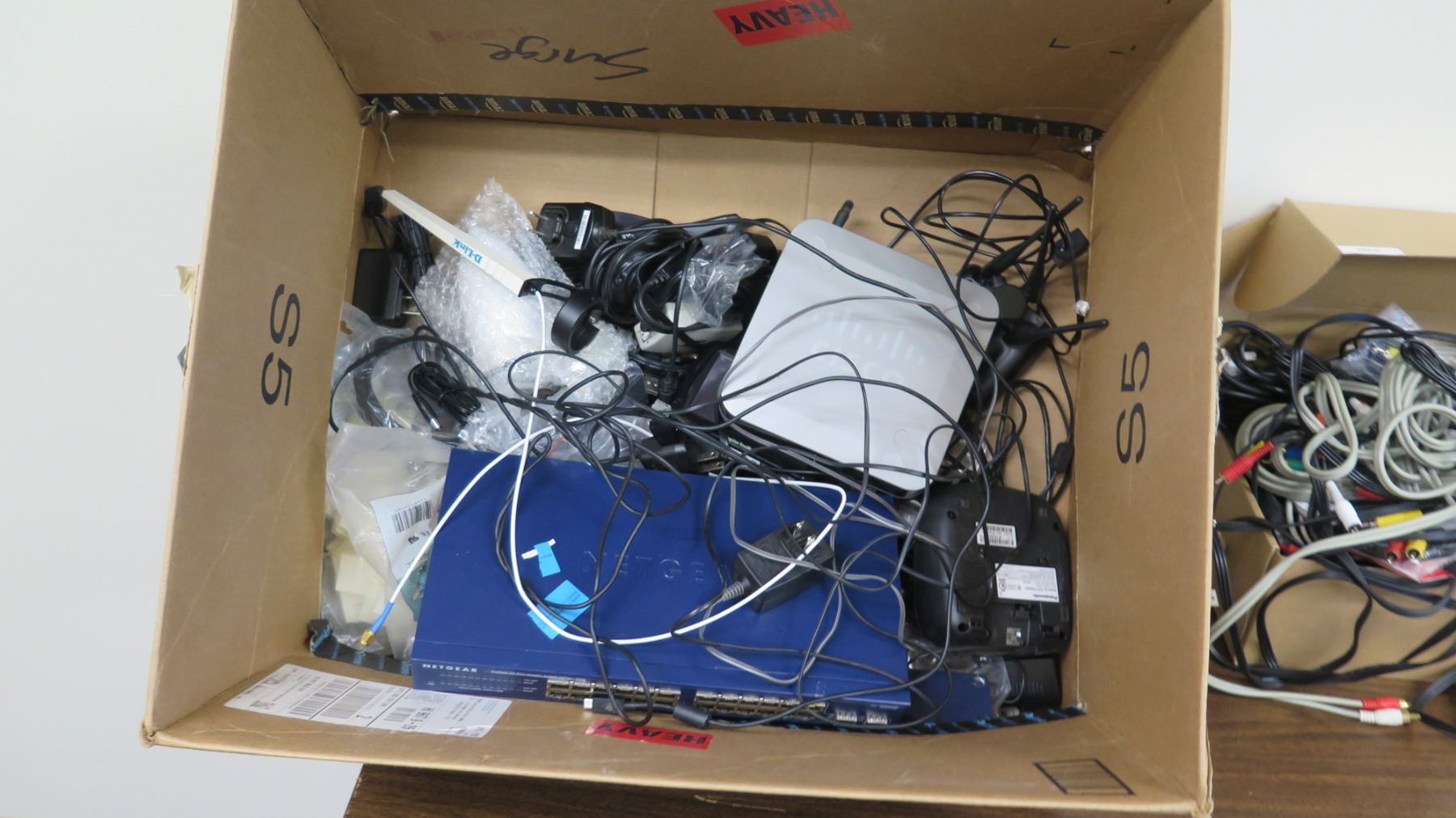 Multiple Boxes Misc Cords & Wire, CyberPower CPS-1220RM PDU, LifeLite Camera, etc