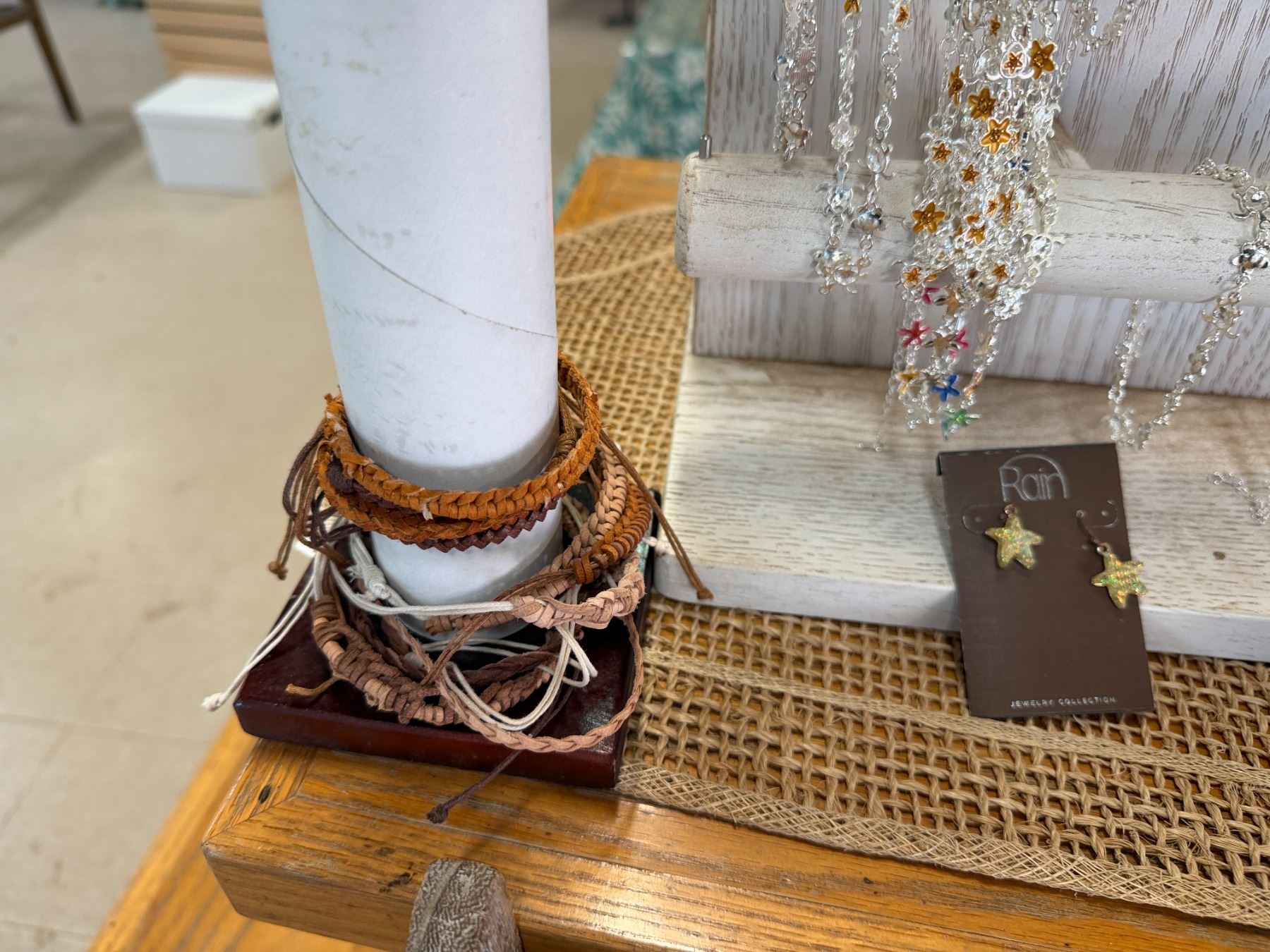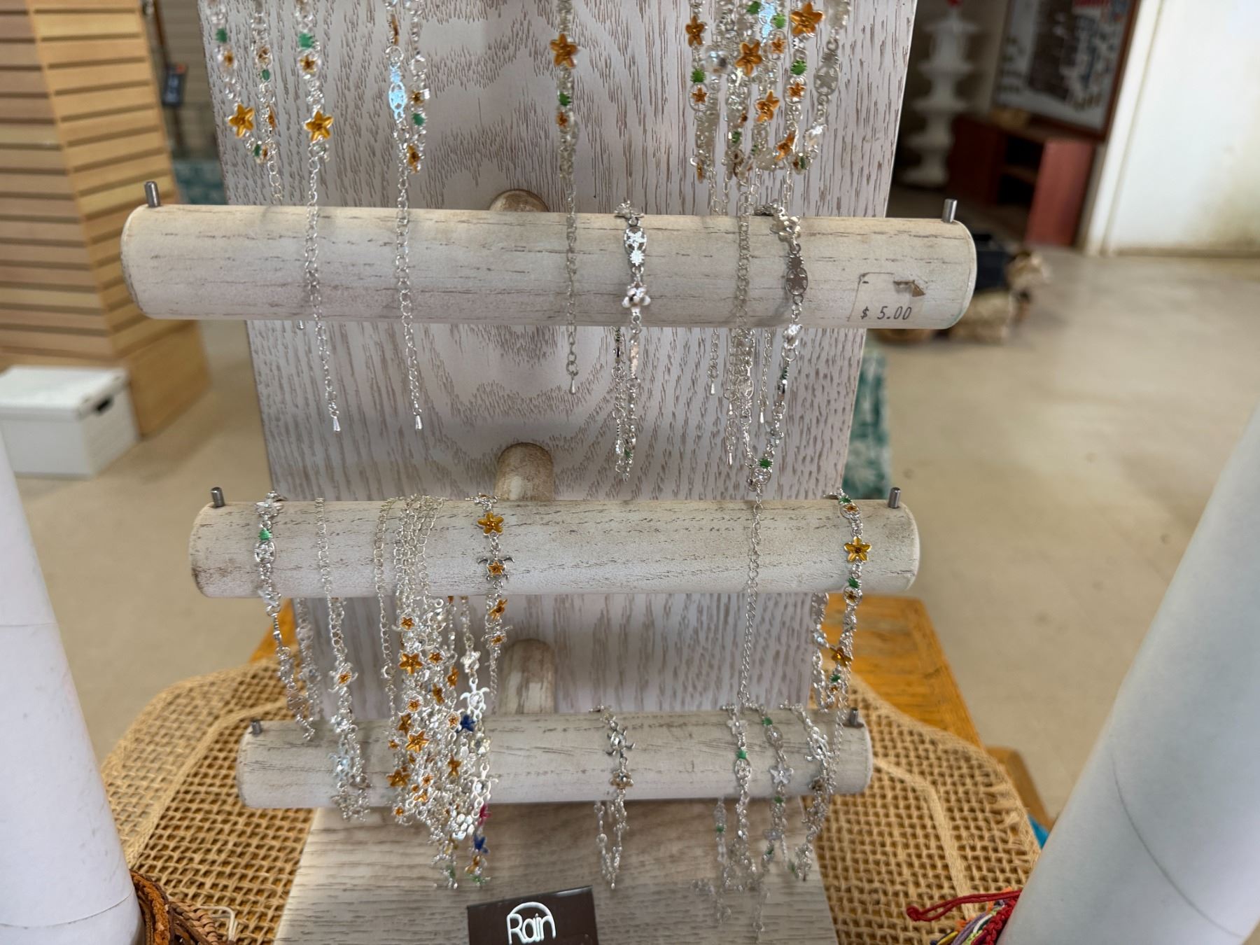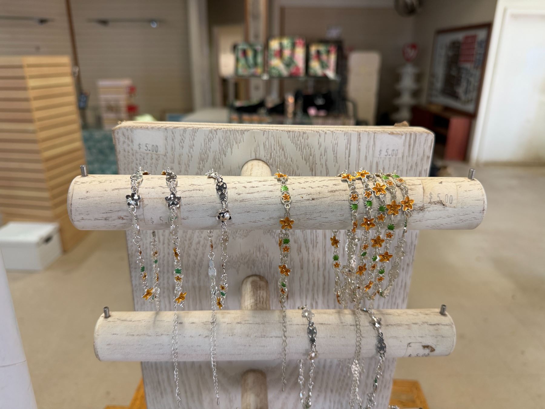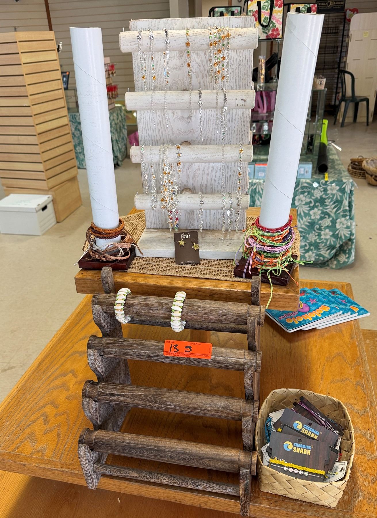 Multiple Bracelets, Earrings, Braided Bands, Charming Shark Smiley, etc on Wooden Display Racks