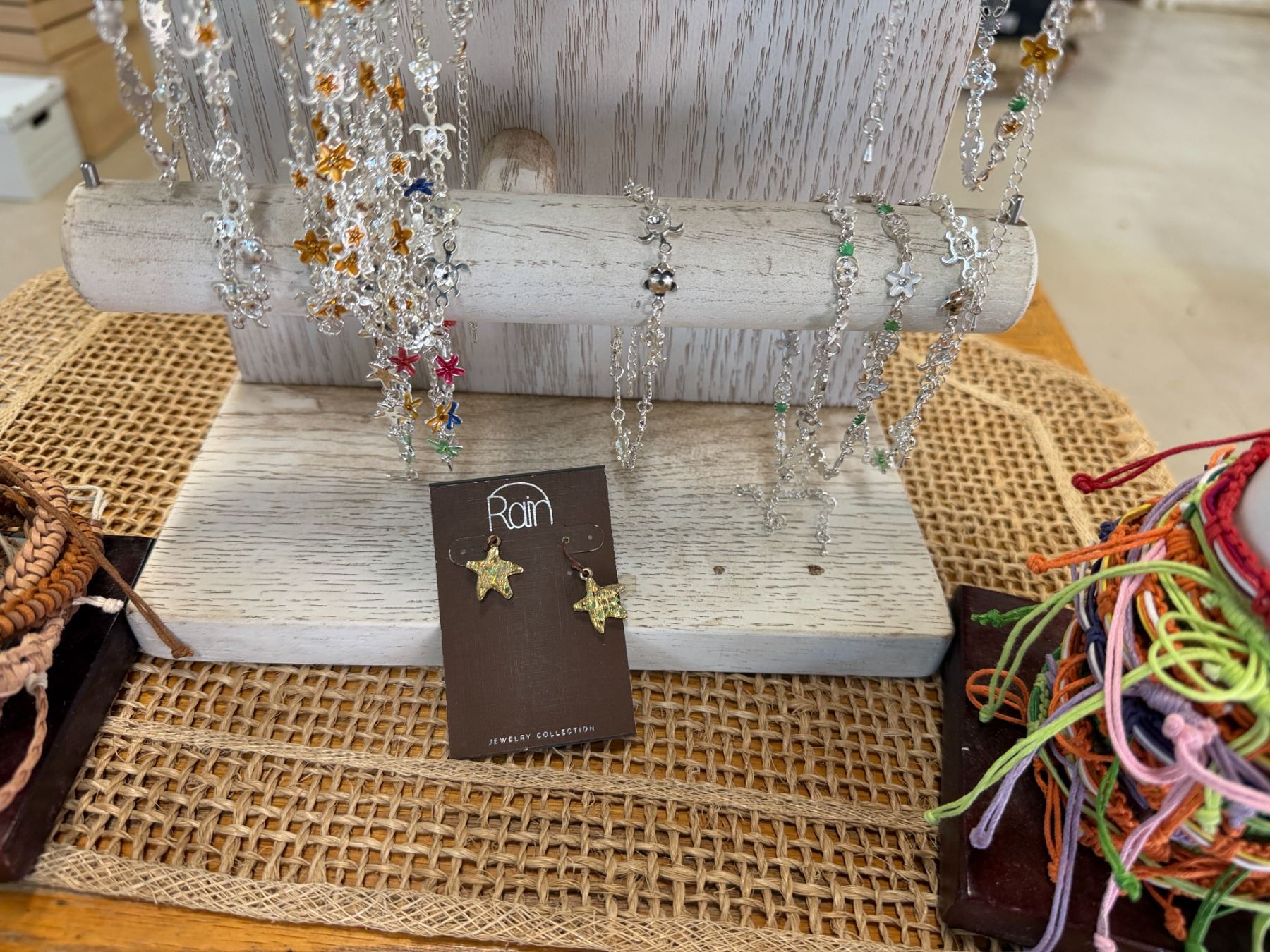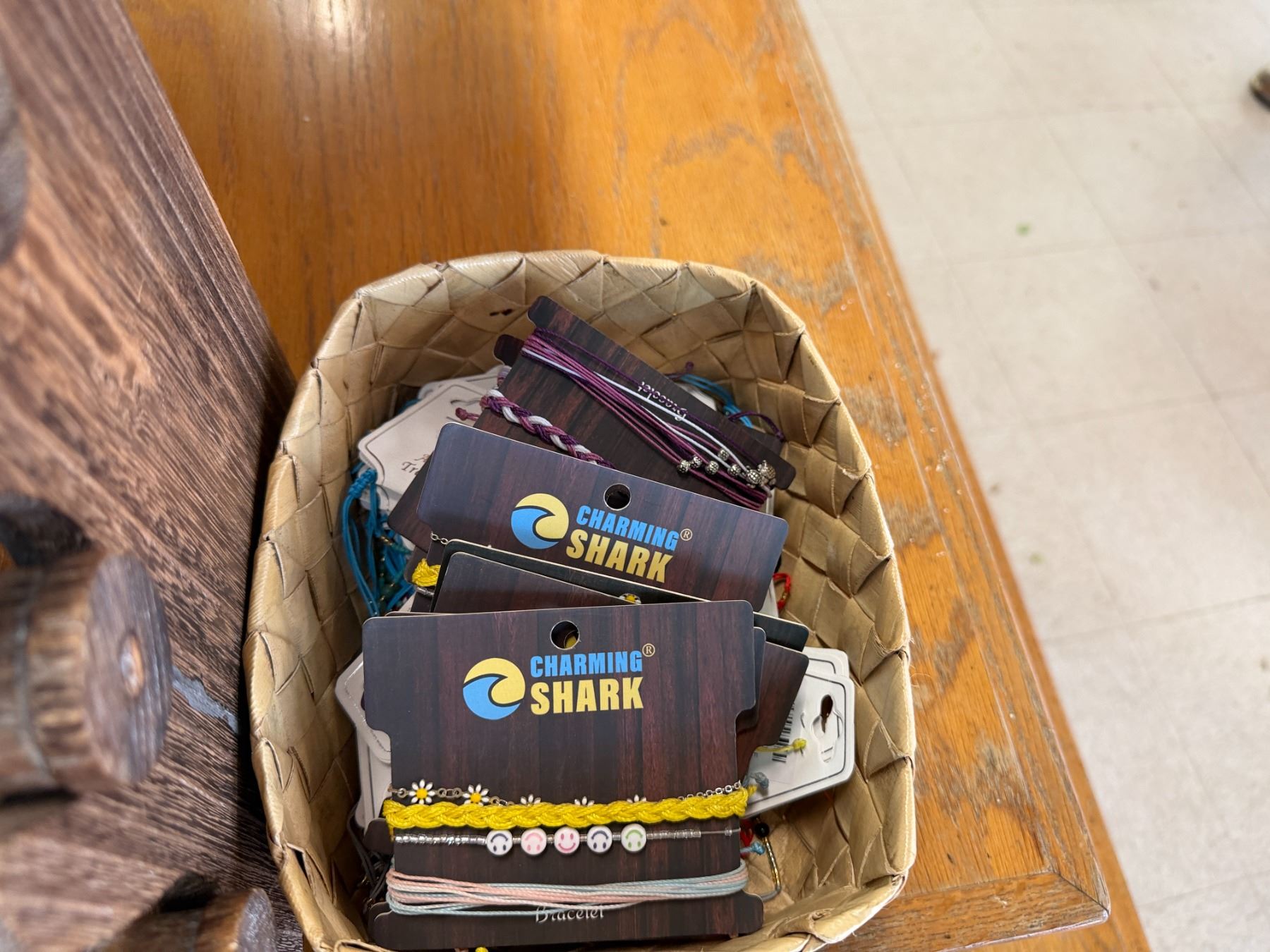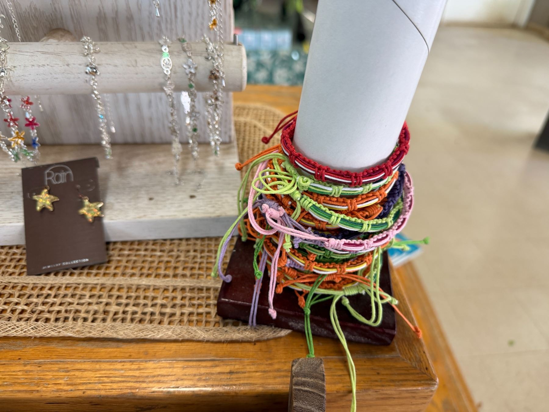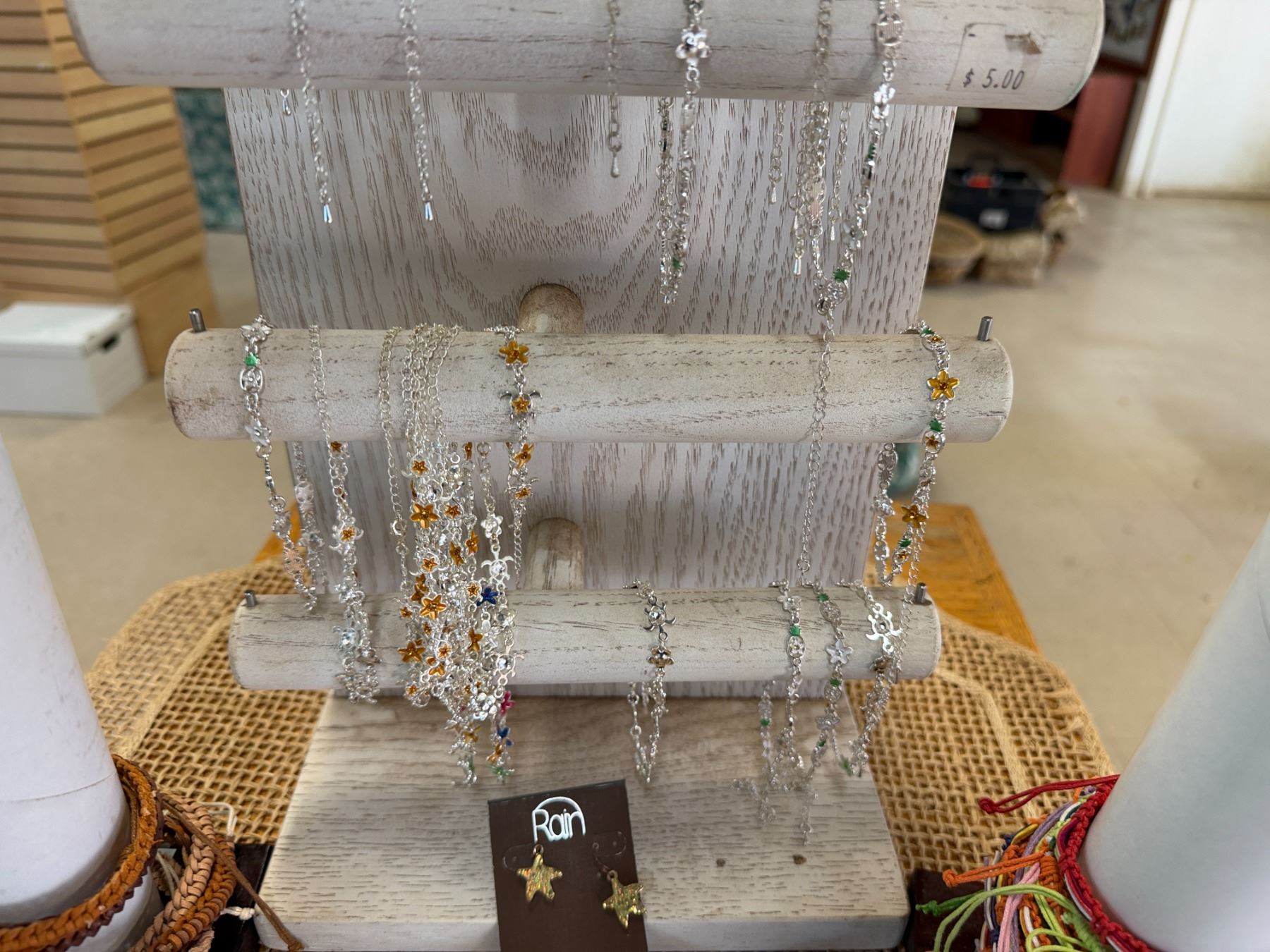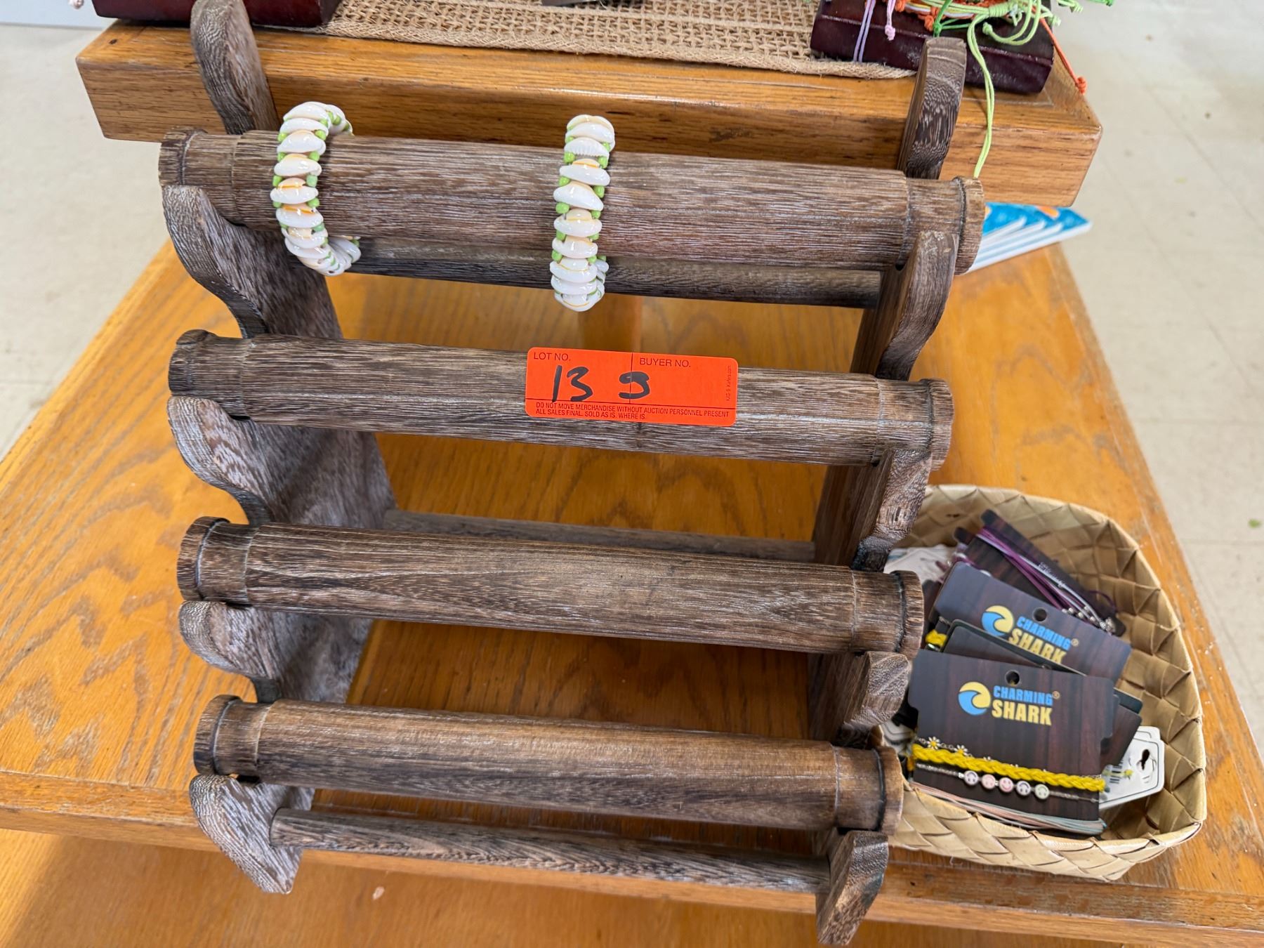 Multiple Bracelets, Earrings, Braided Bands, Charming Shark Smiley, etc on Wooden Display Racks