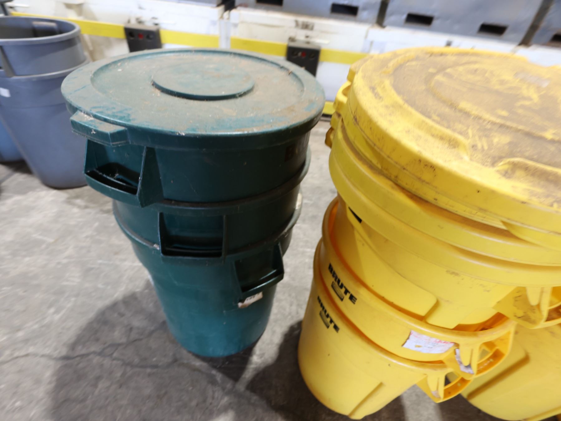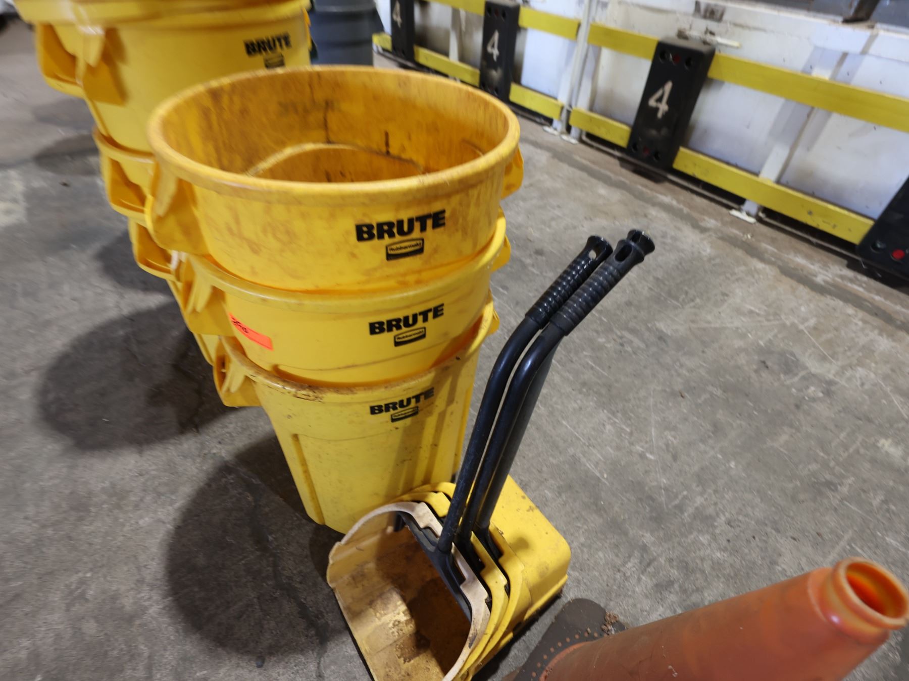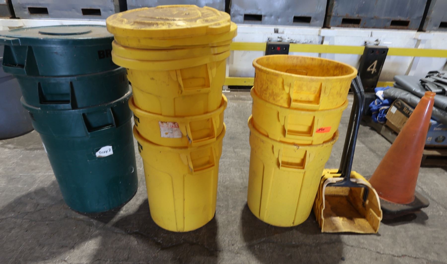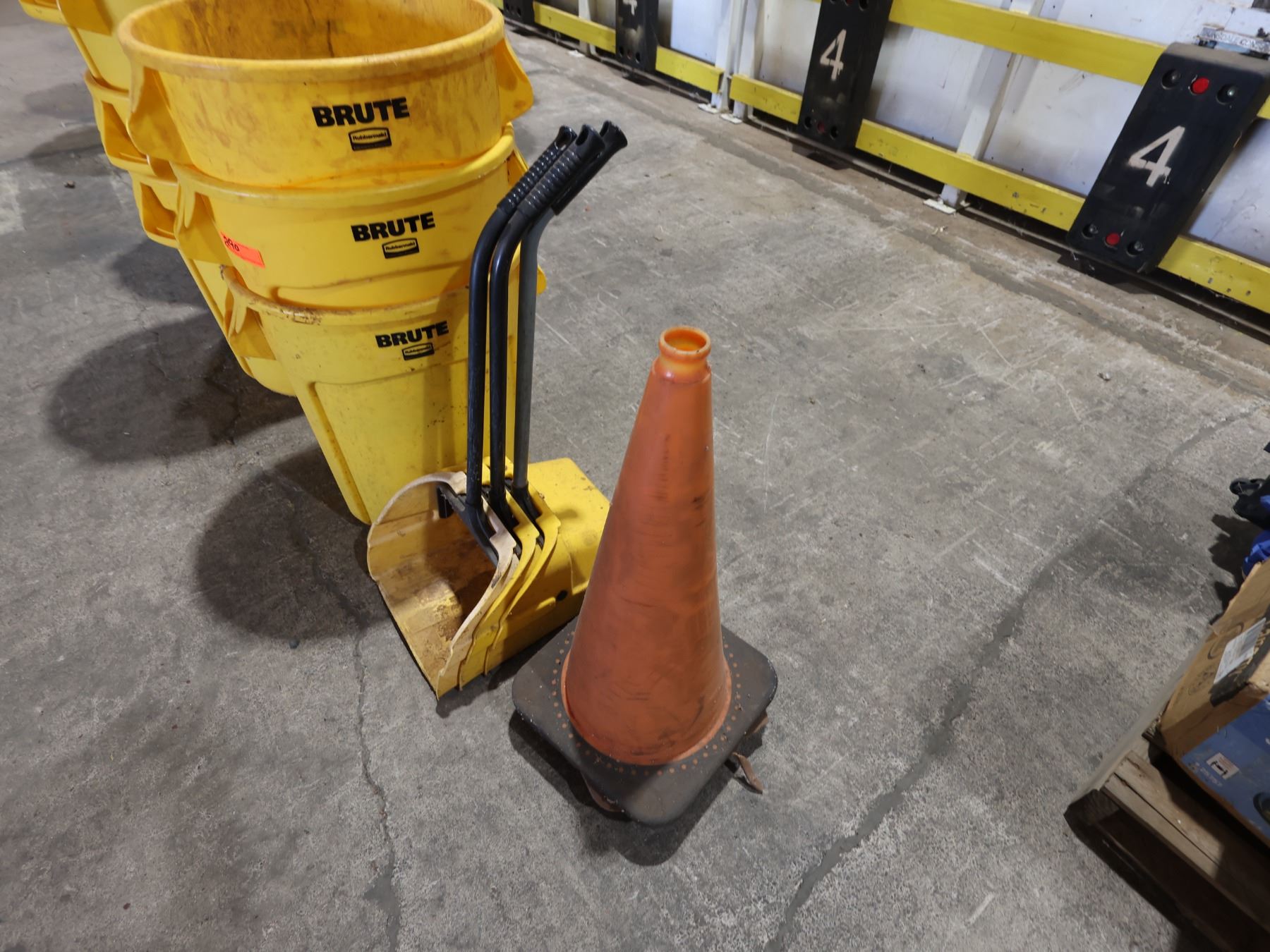 Multiple Brute Waste Cans, Dustpans & Orange Safety Cones