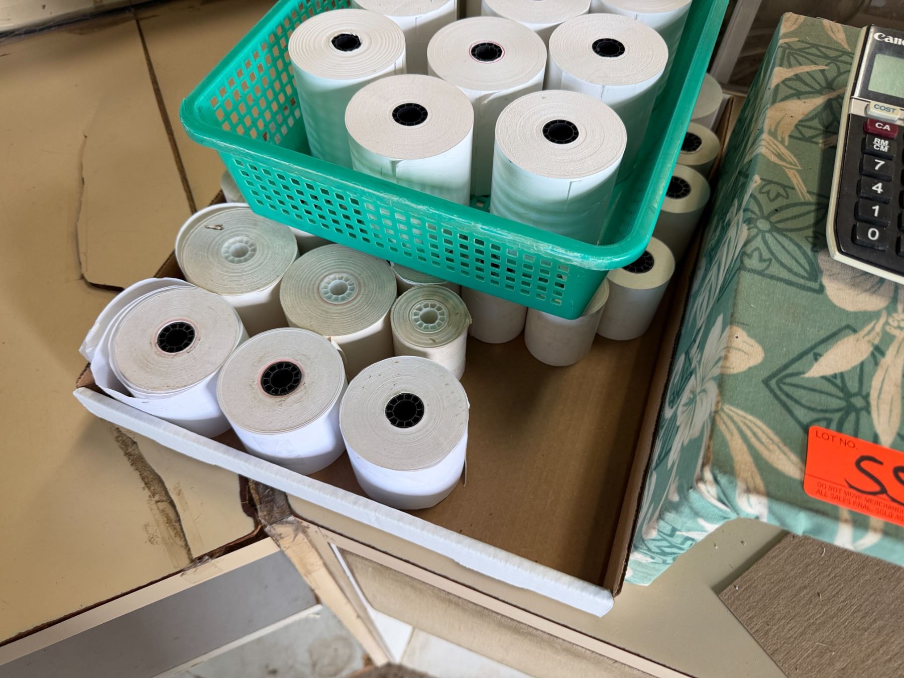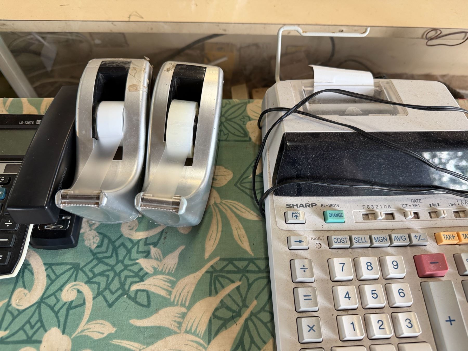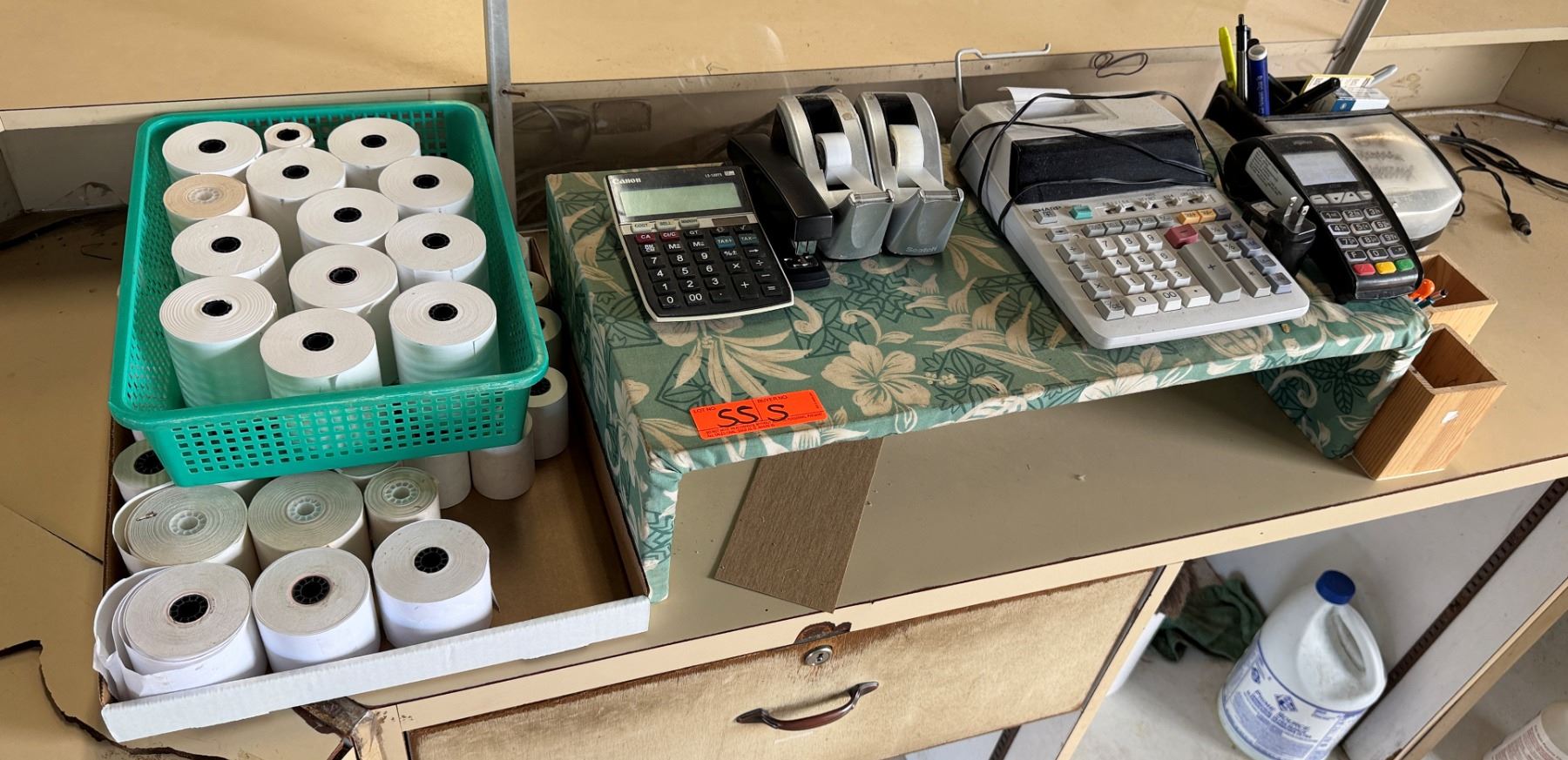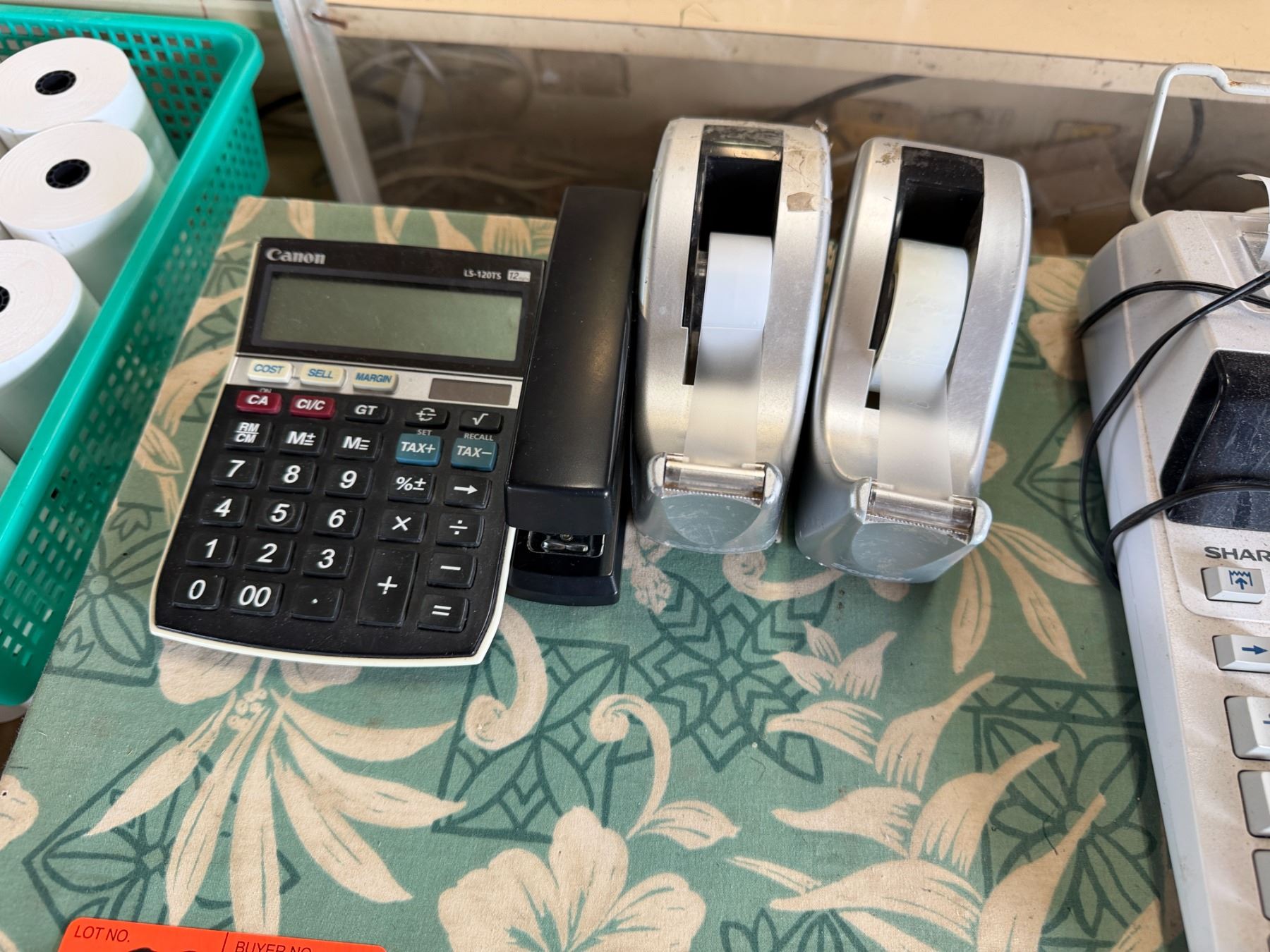 Multiple Calculators, Receipt Paper Rolls, Tape Dispensers, etc