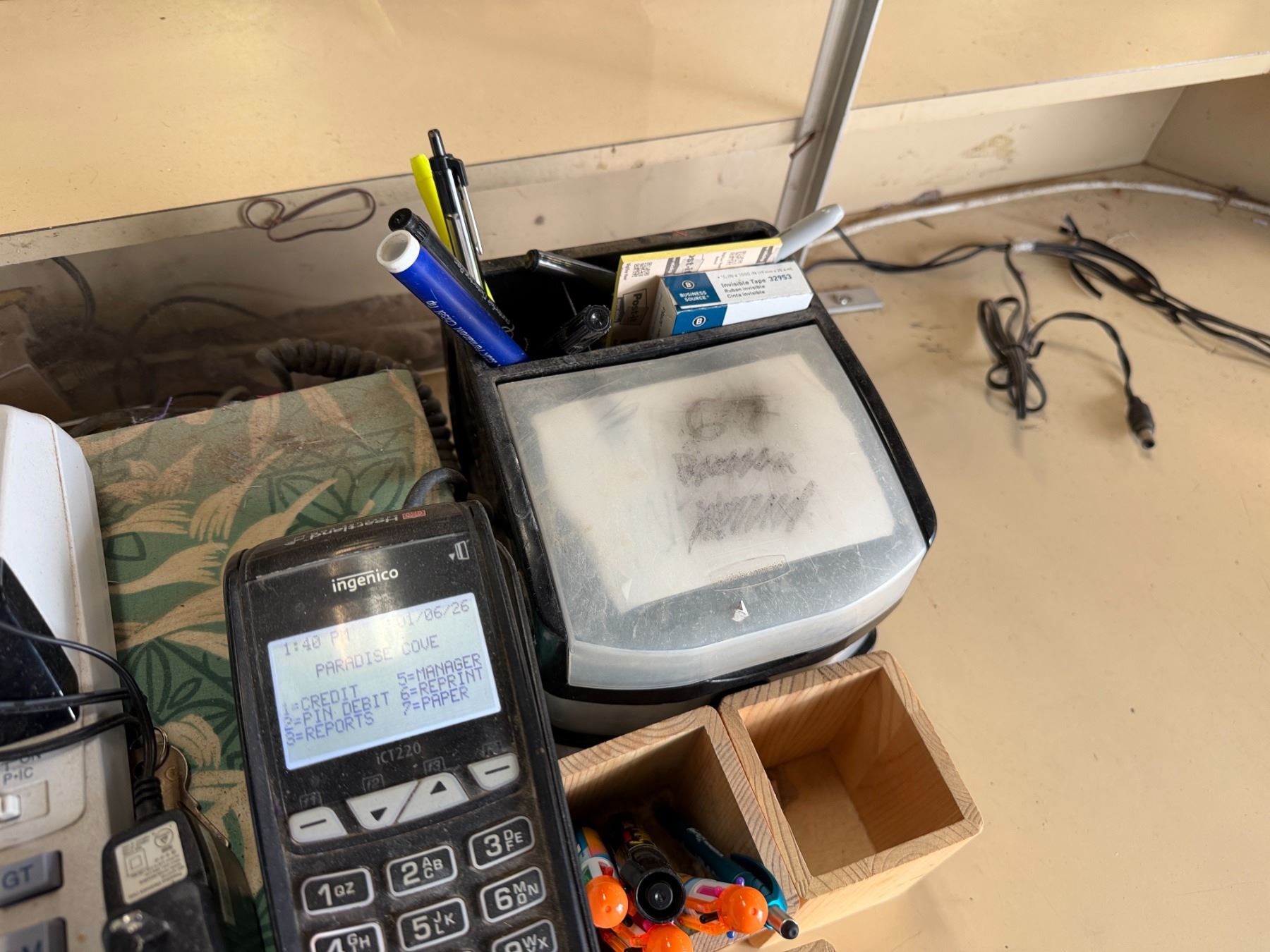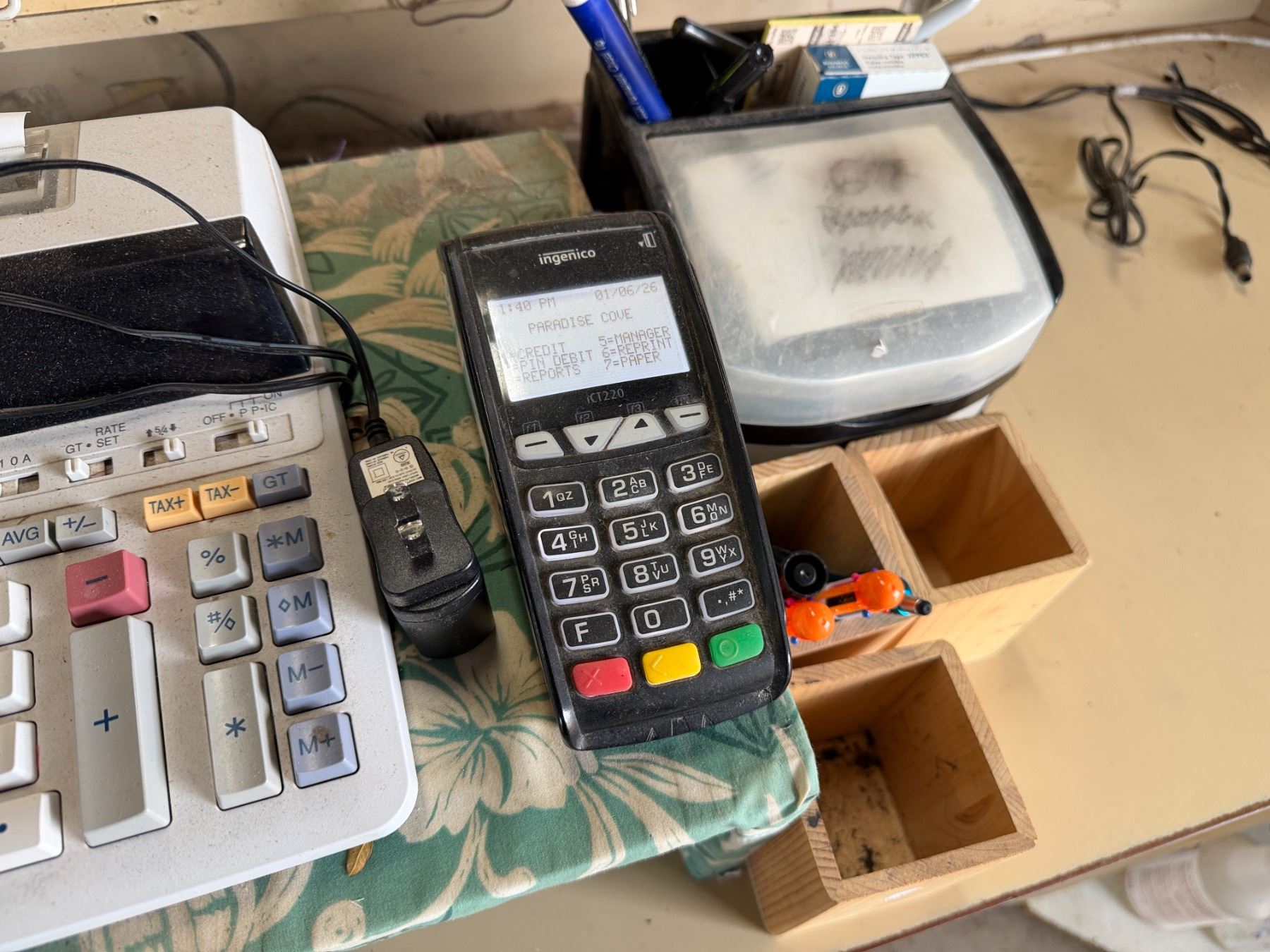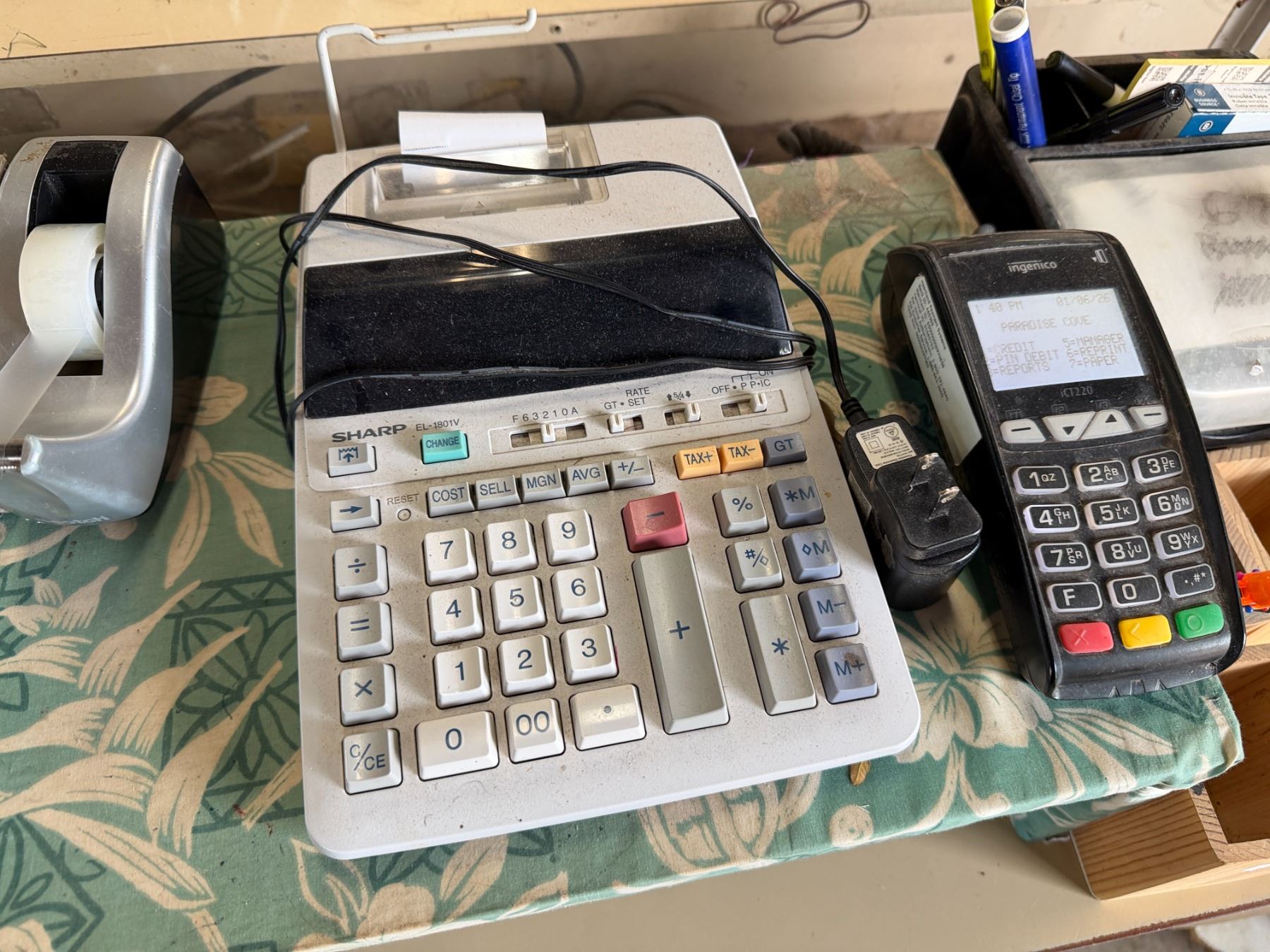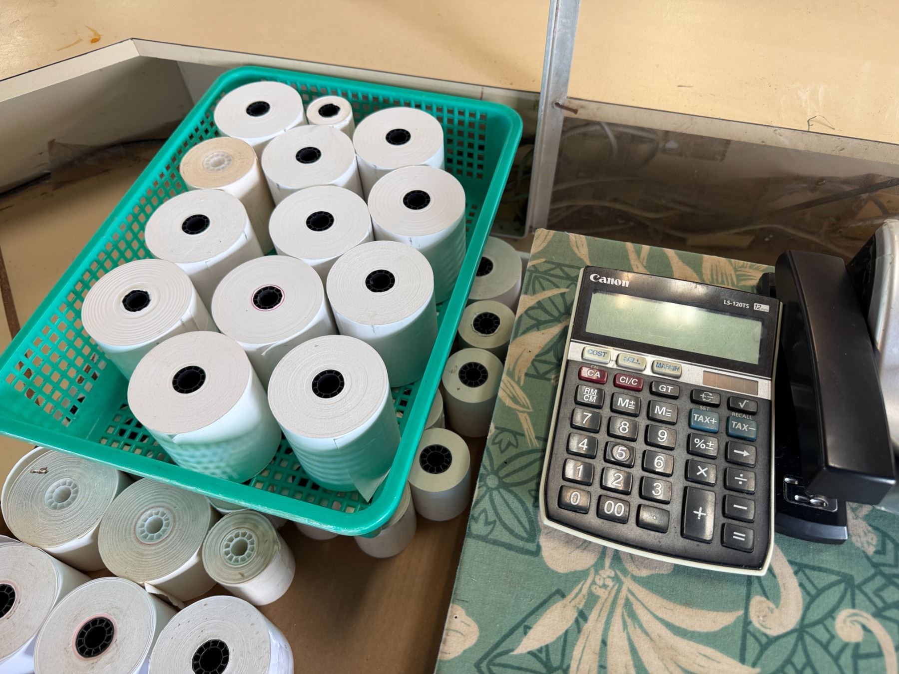 Multiple Calculators, Receipt Paper Rolls, Tape Dispensers, etc
