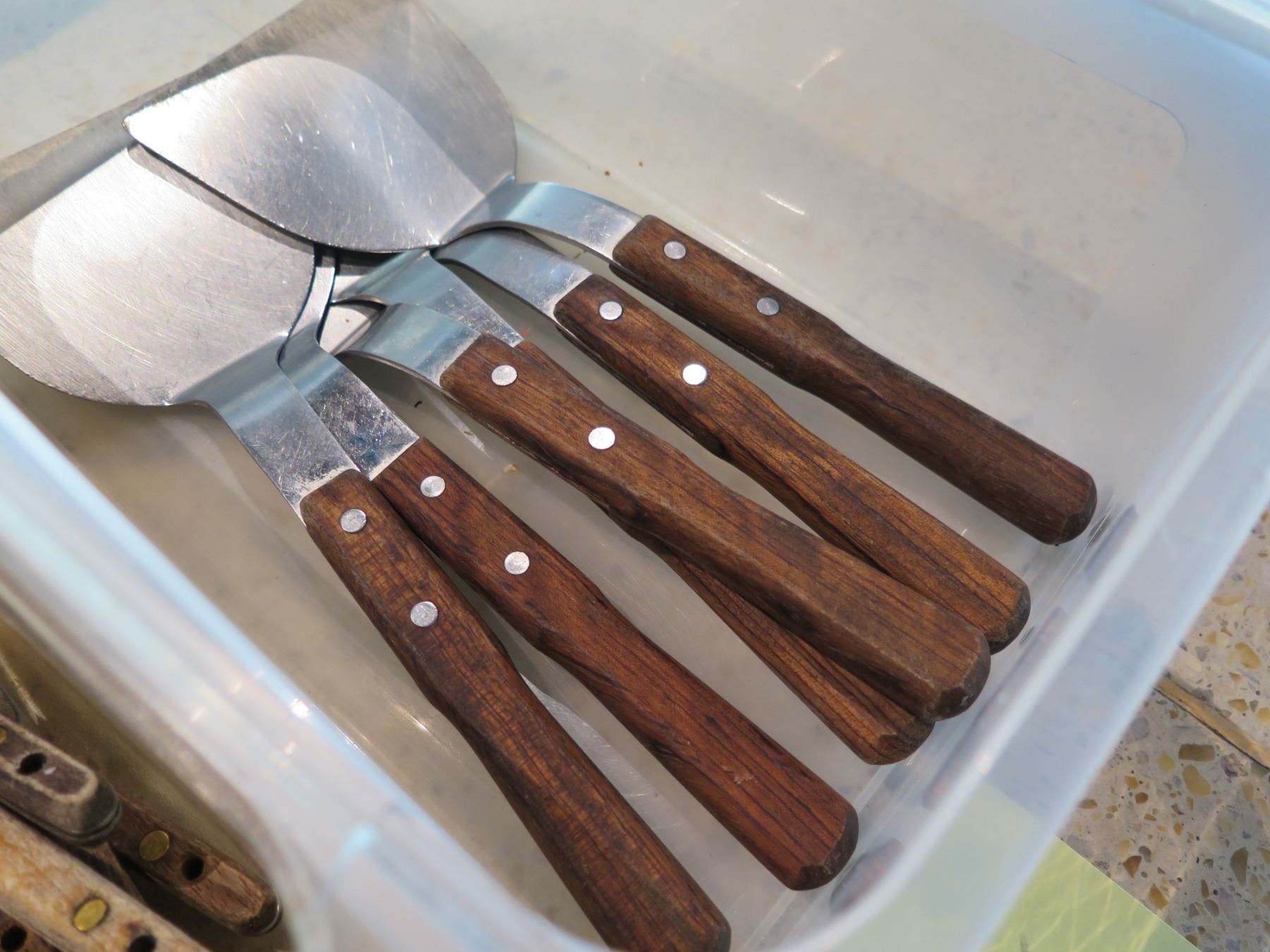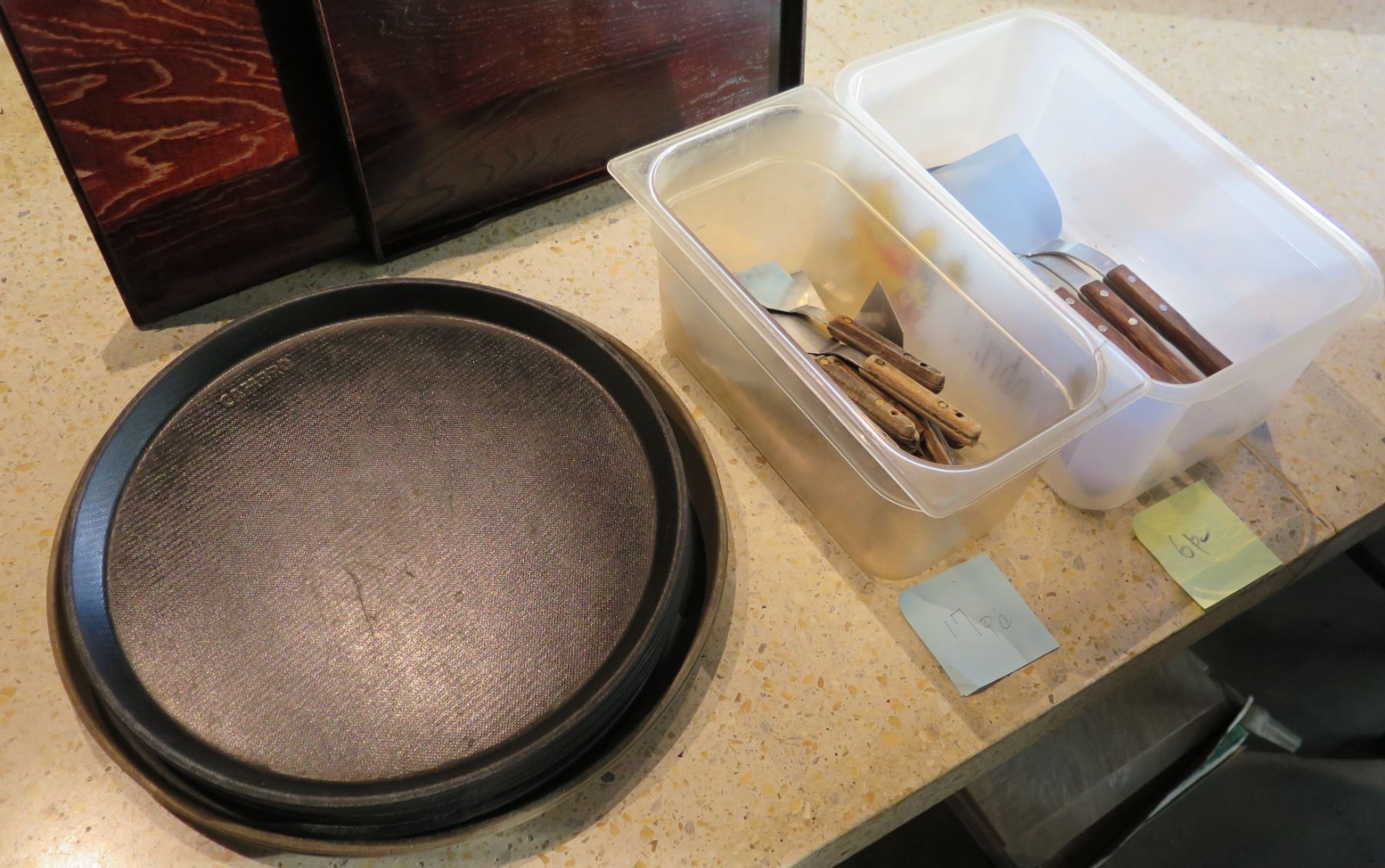 Multiple Cambro Round Serving Trays 14" dia, Metal Spatulas, etc