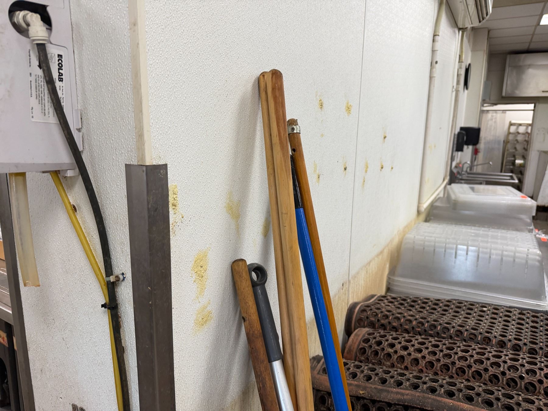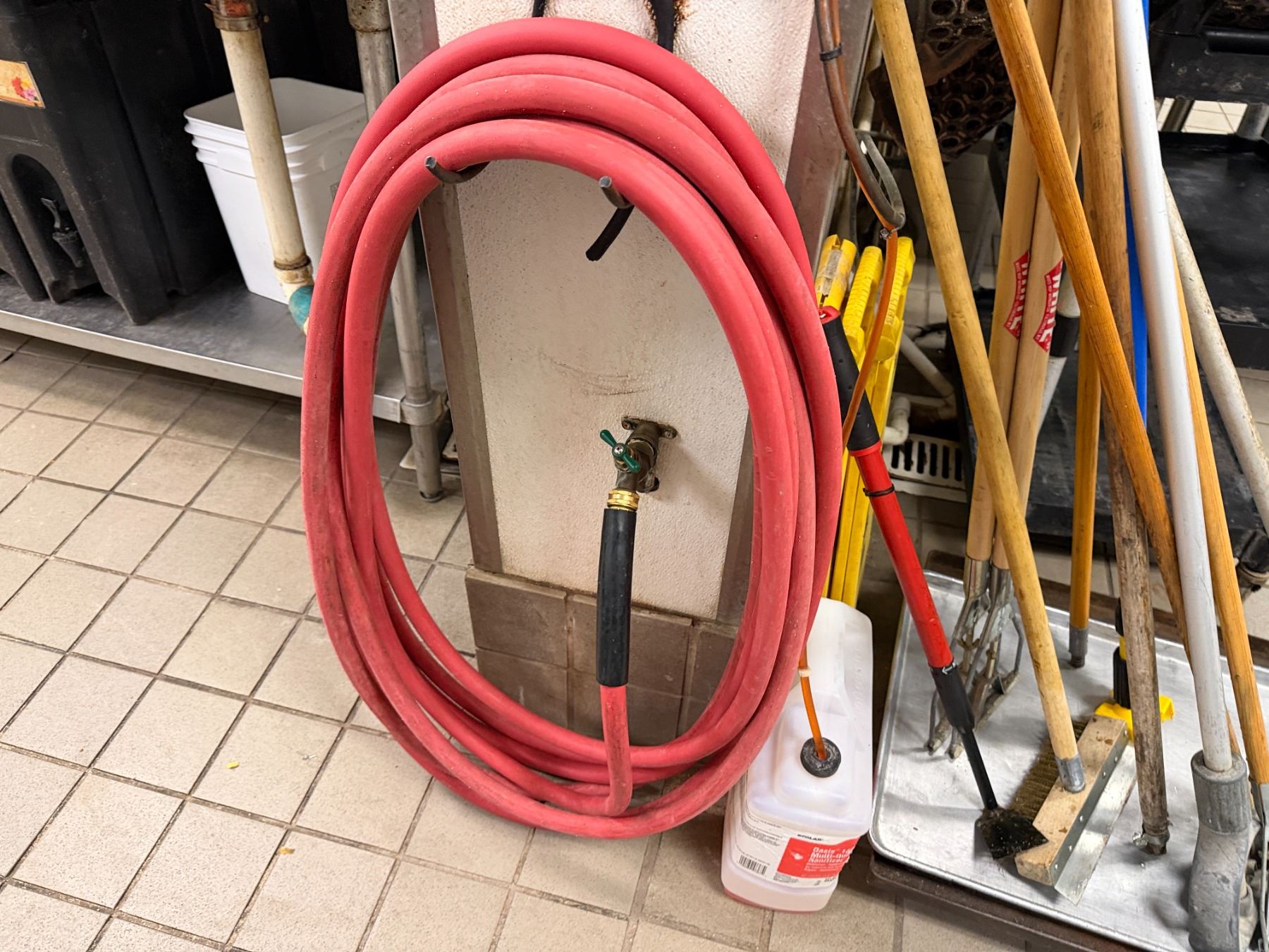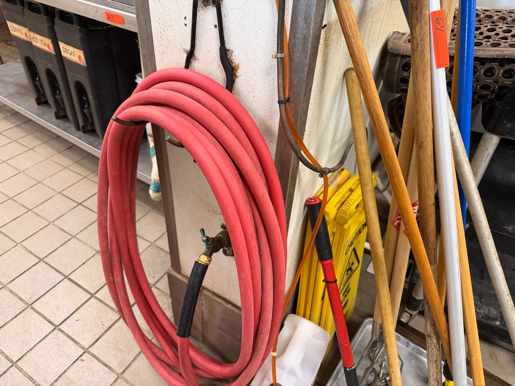 Multiple Cleaning Tools: Hose, Mops, Caution Signs, etc