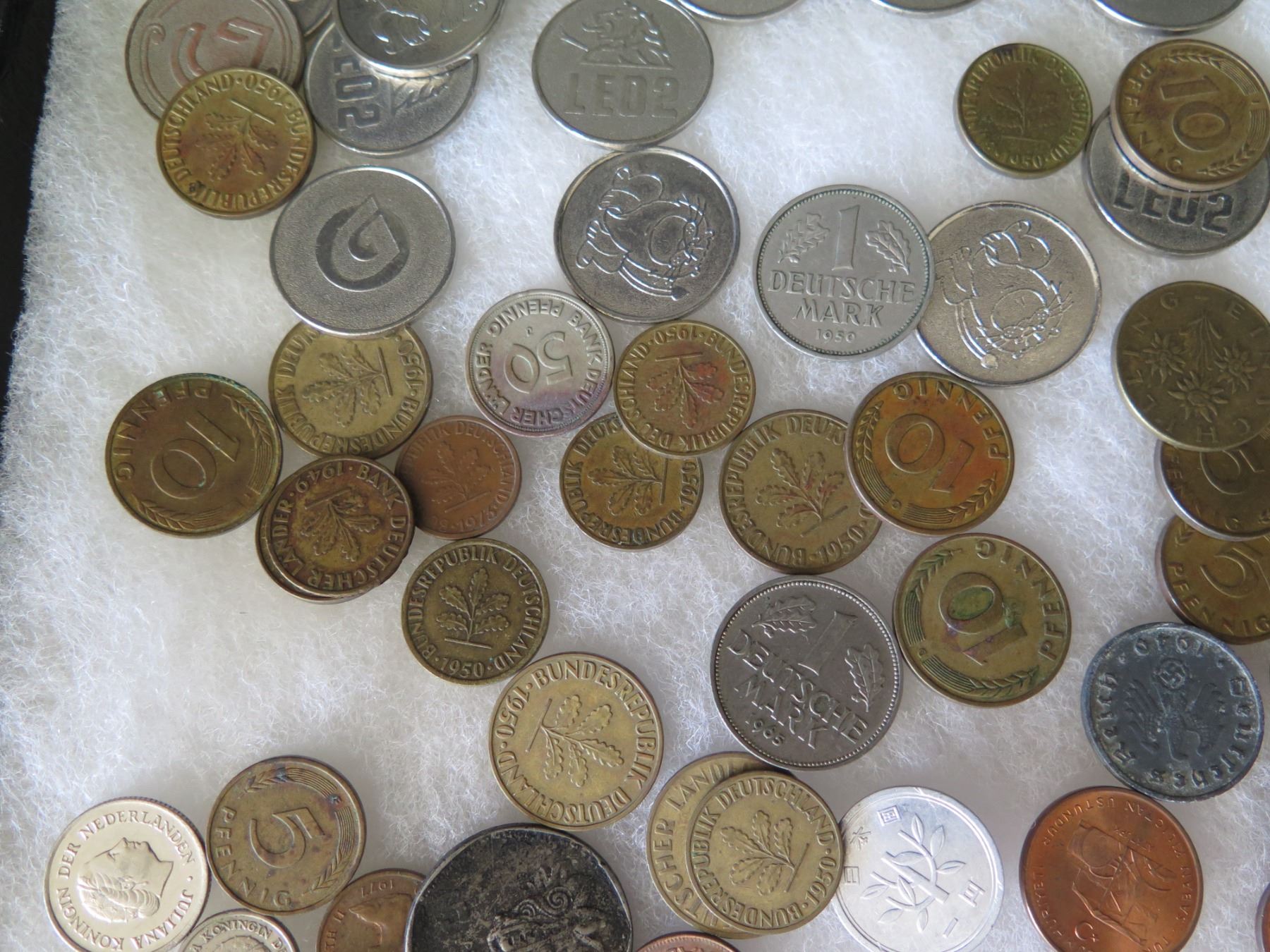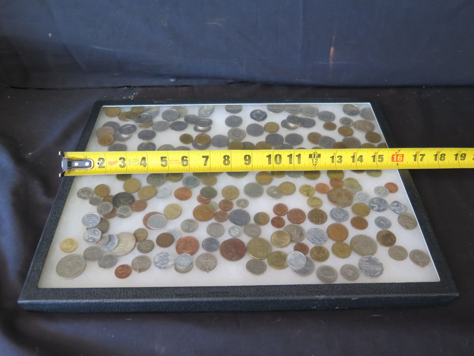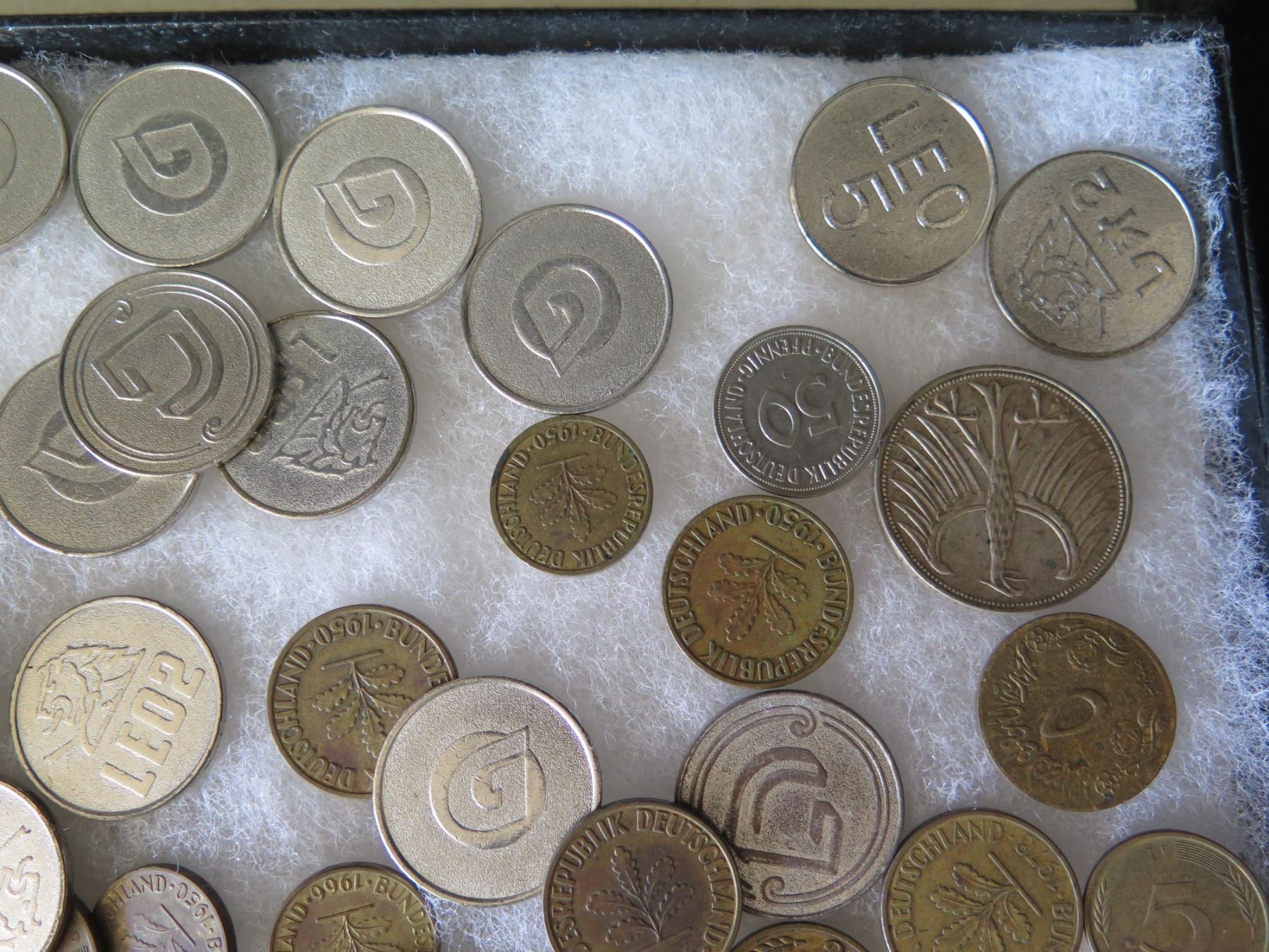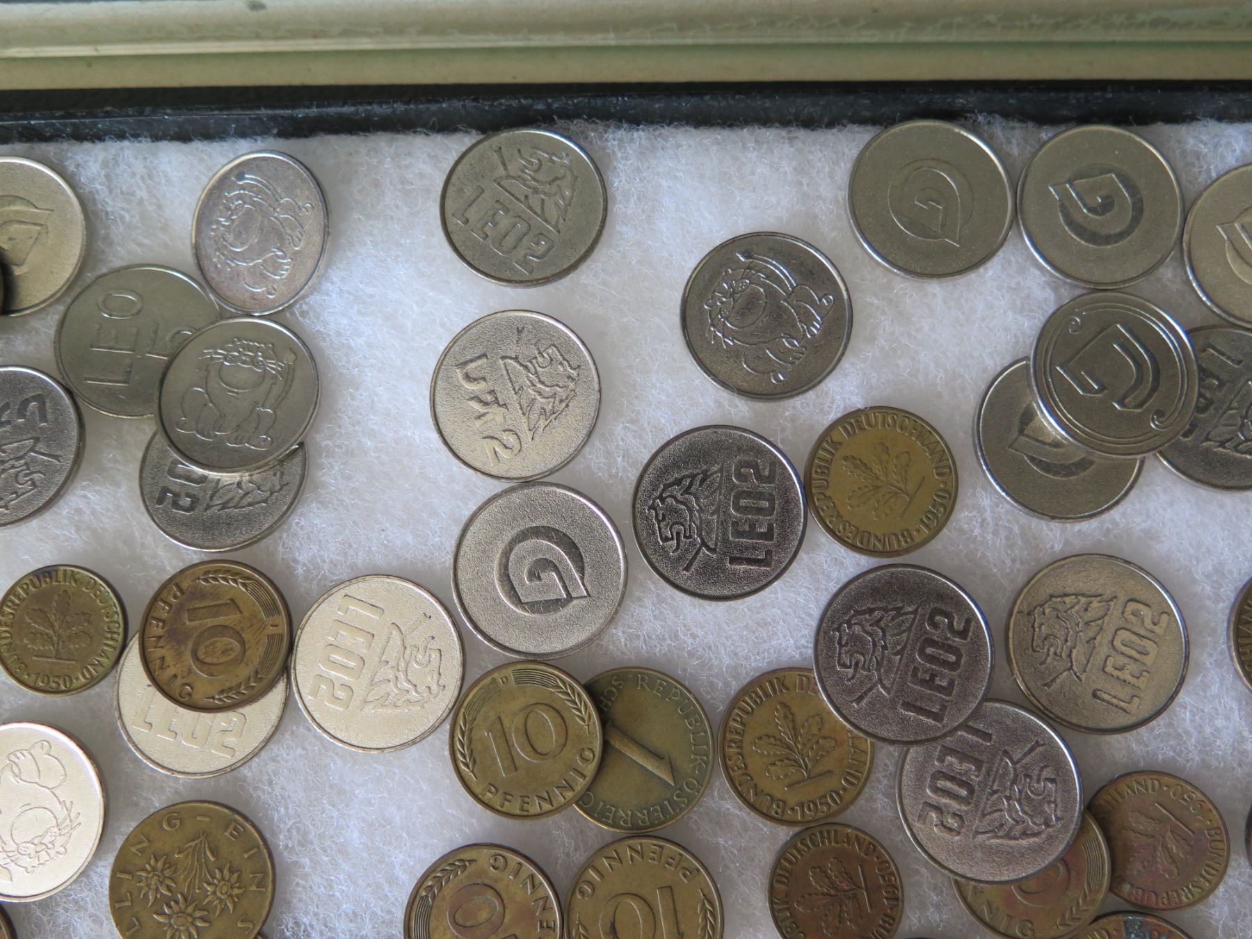 Multiple Coins: Leo 1/2/5, Deutschemark, 10 Pfenning, SVF Rice, Centavo, etc in Display Case 16"L