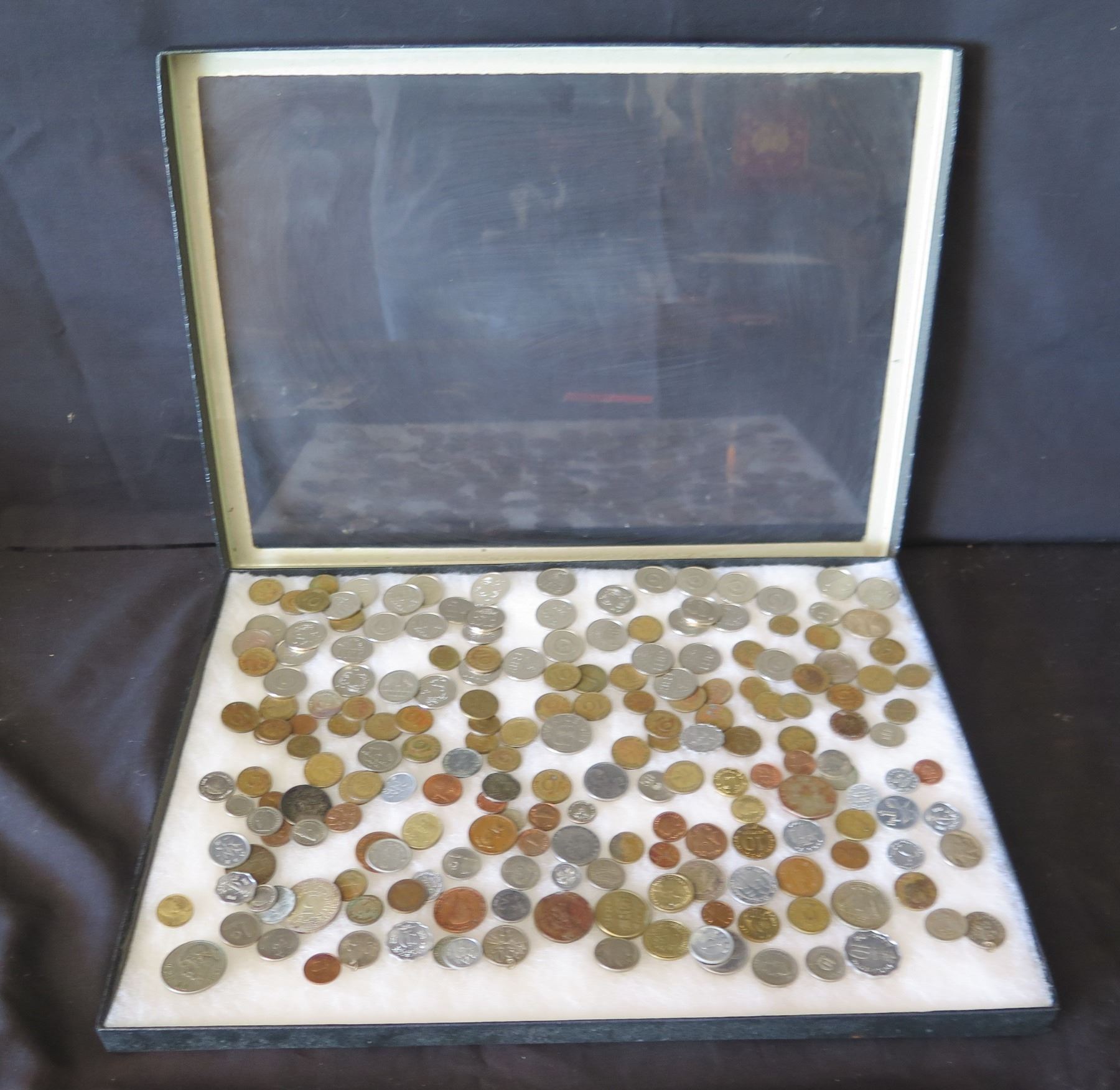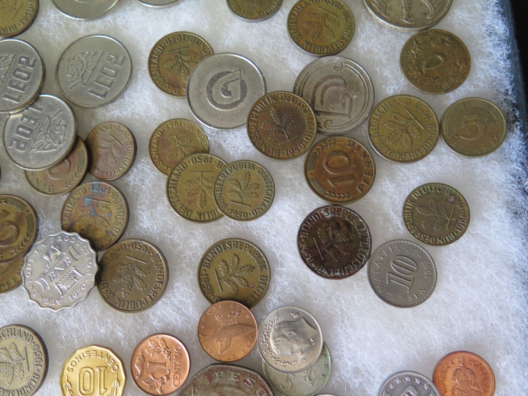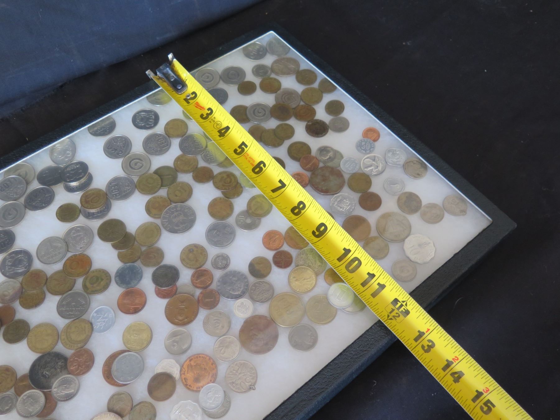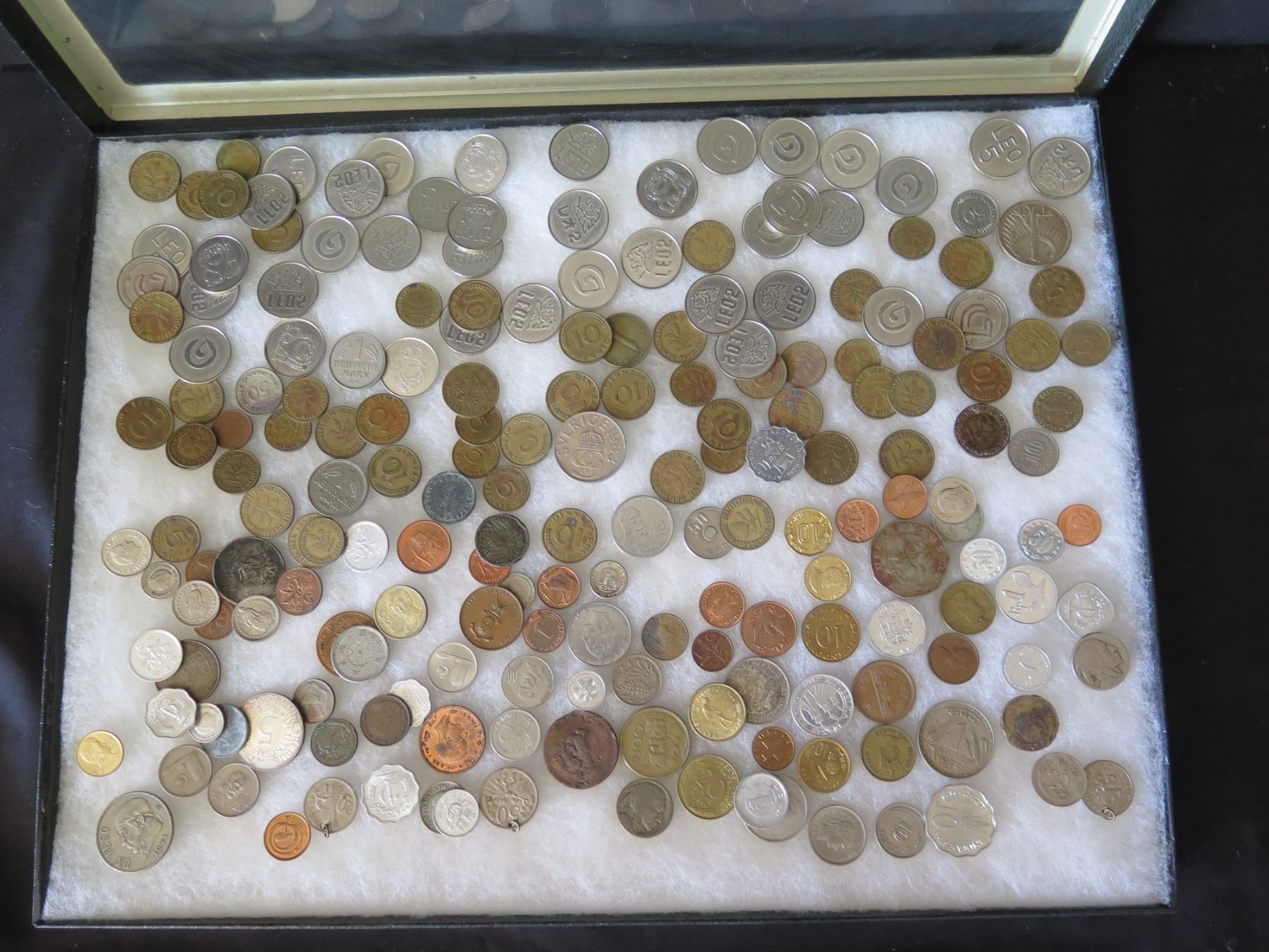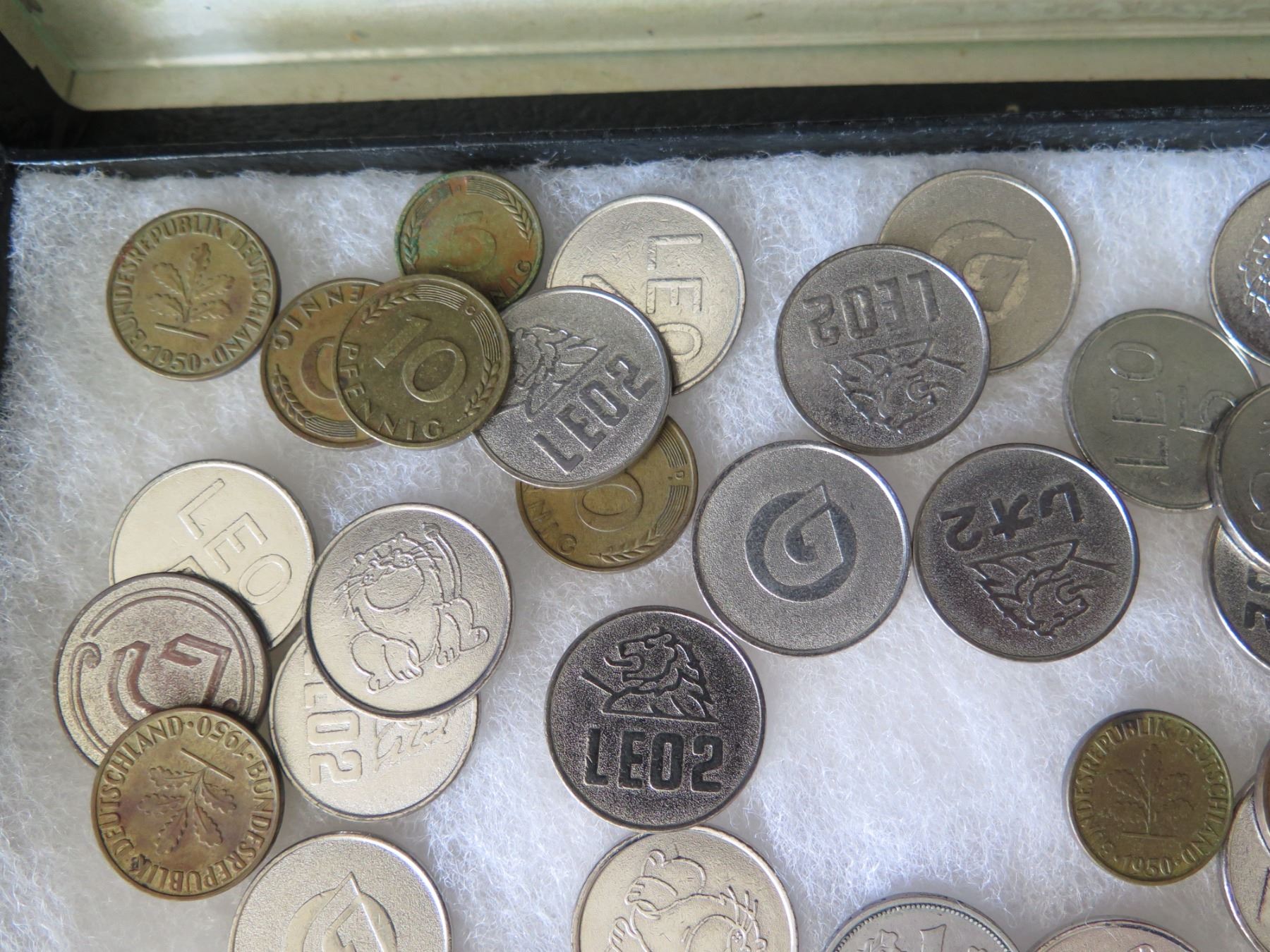 Multiple Coins: Leo 1/2/5, Deutschemark, 10 Pfenning, SVF Rice, Centavo, etc in Display Case 16"L