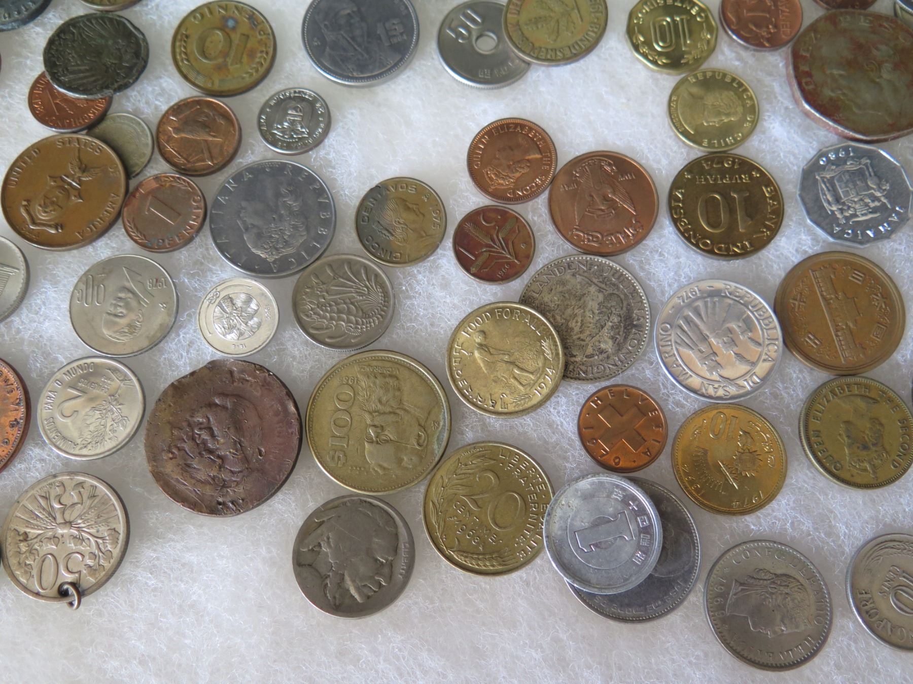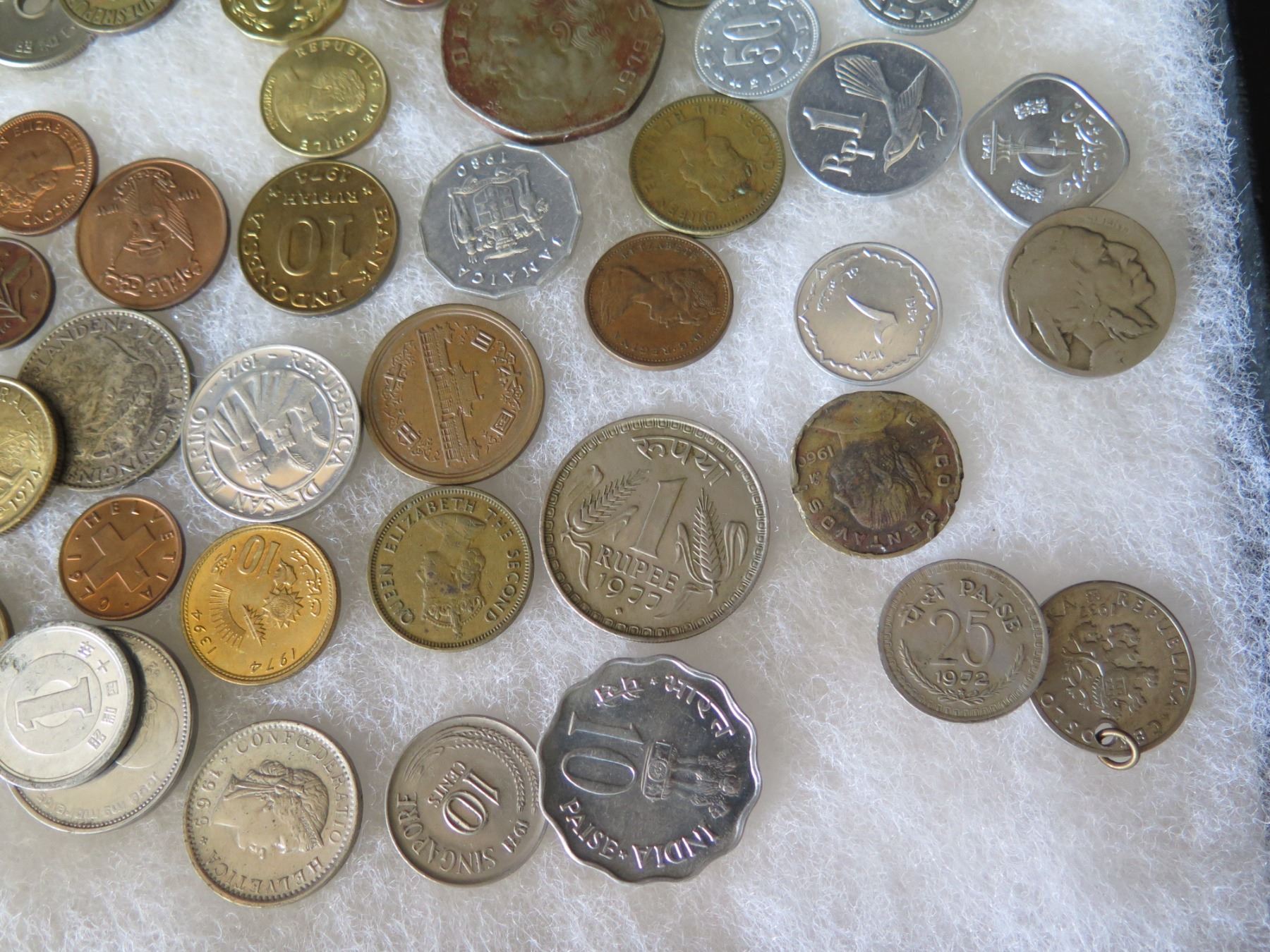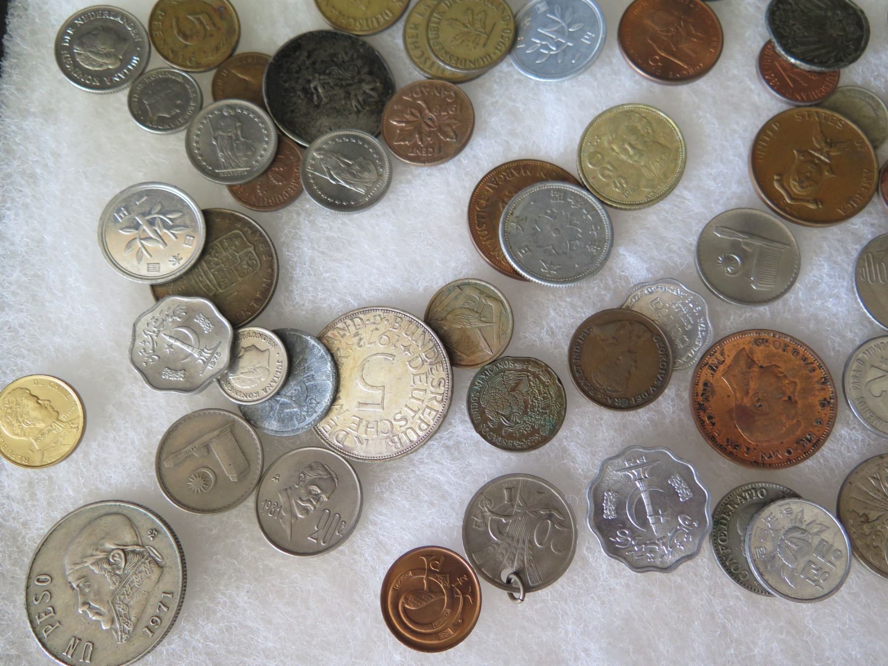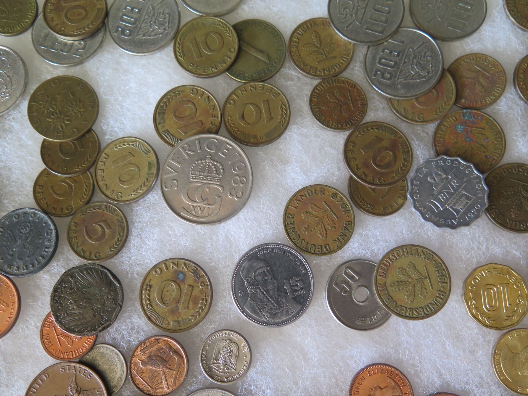Multiple Coins: Leo 1/2/5, Deutschemark, 10 Pfenning, SVF Rice, Centavo, etc in Display Case 16"L