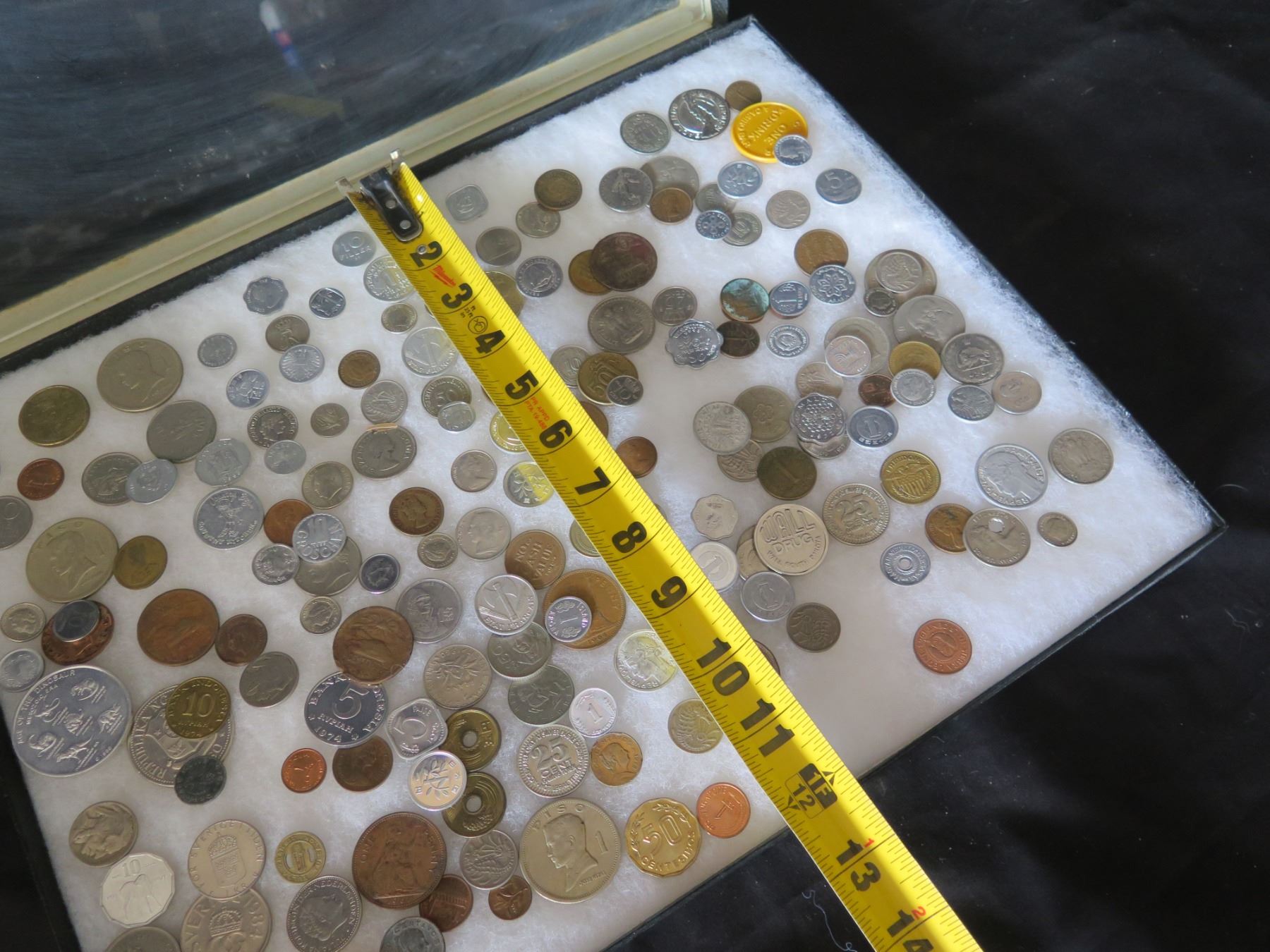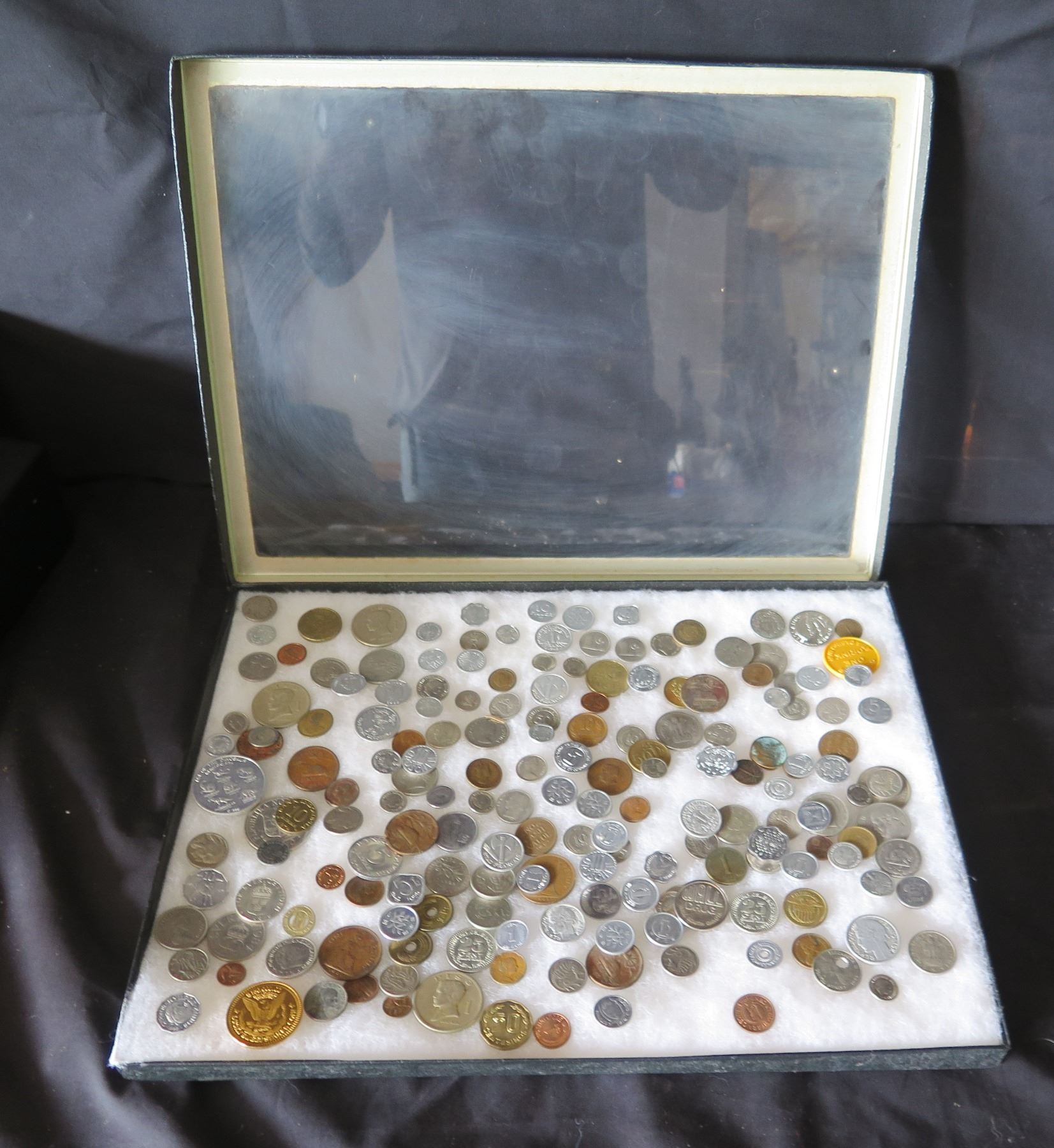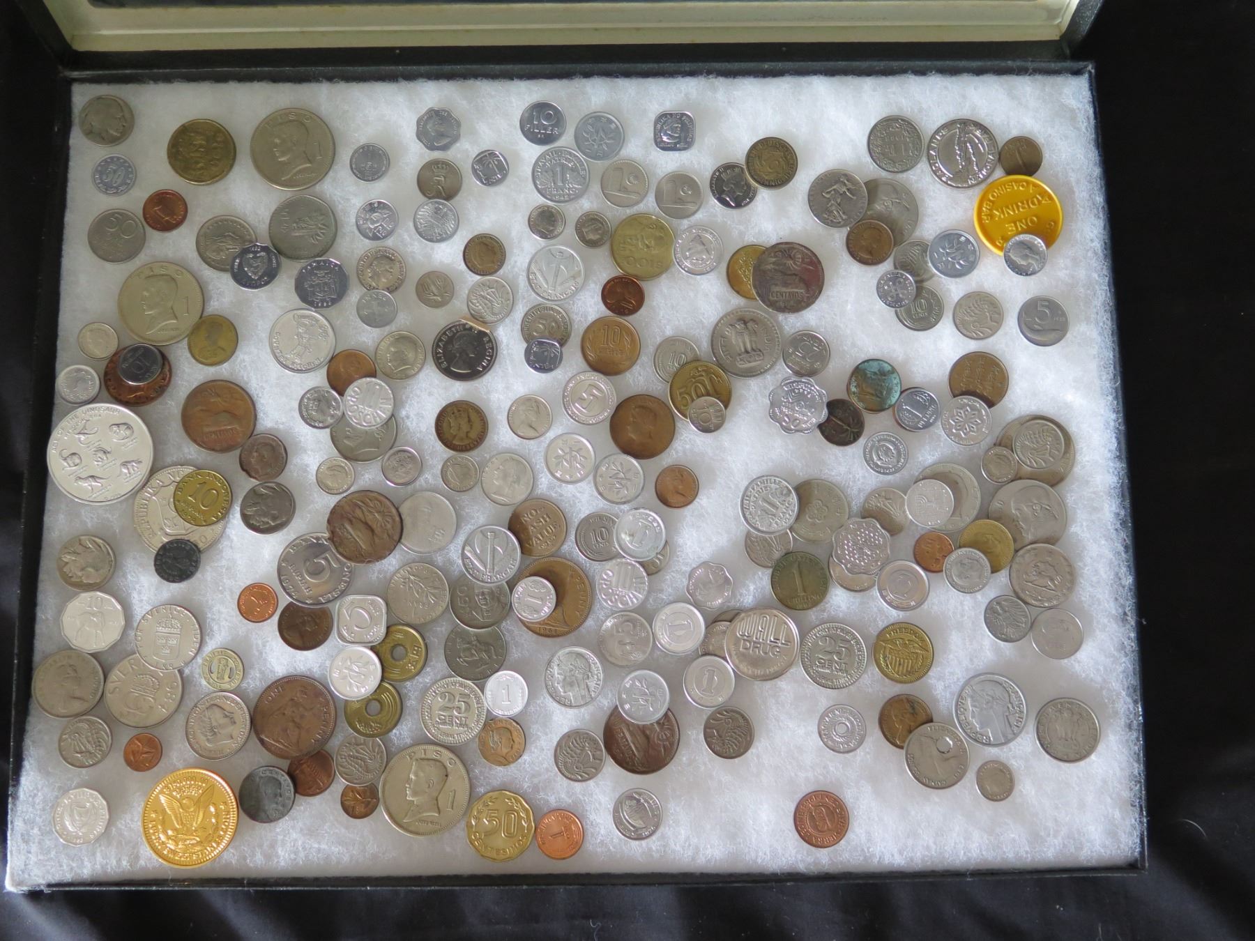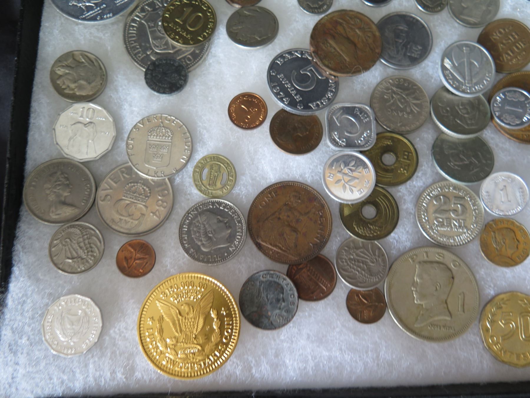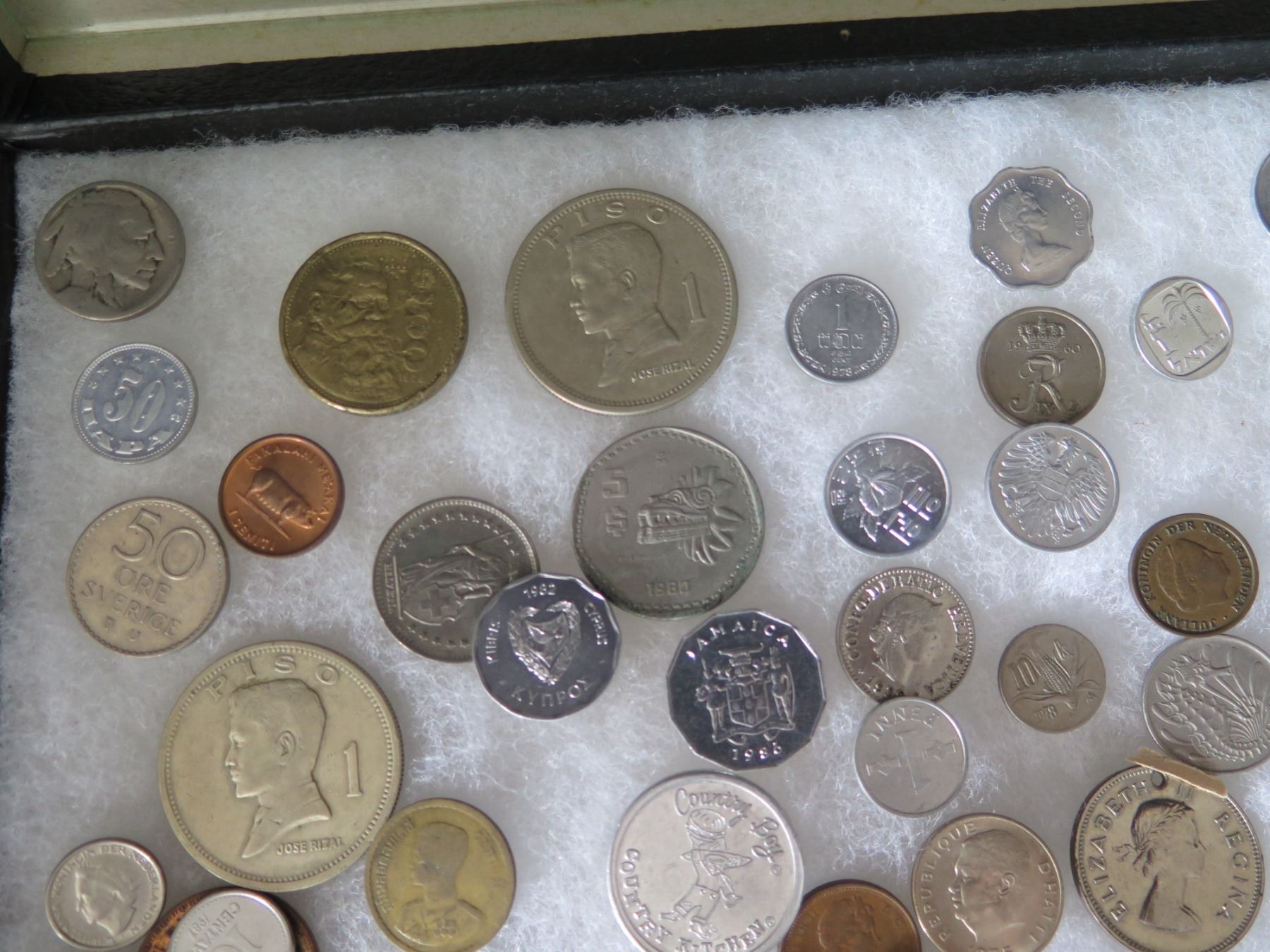 Multiple Coins: Piso, Jamaica, Country Boy, Bank Indonesia, Singapore, etc in Display Case 16"L