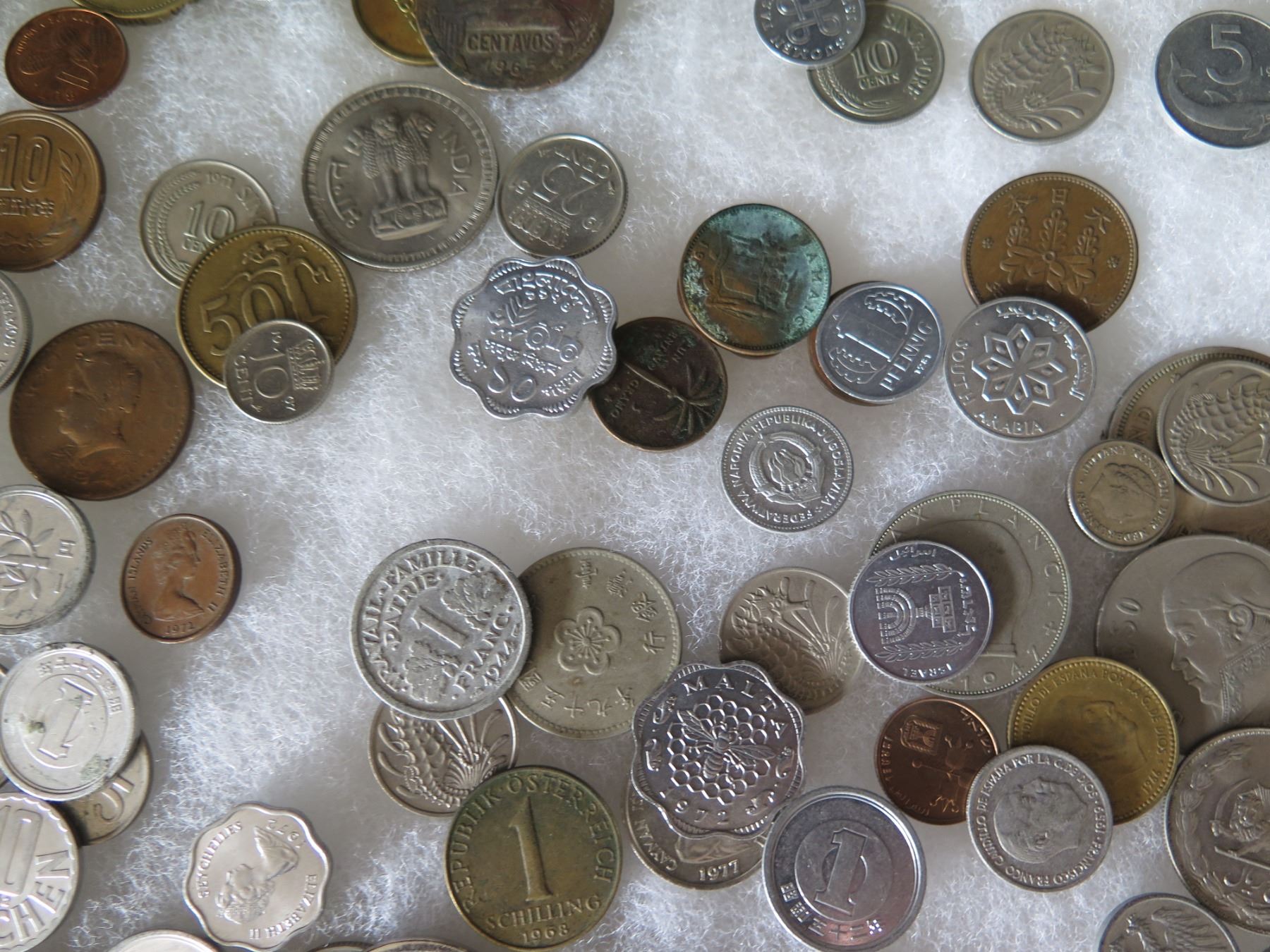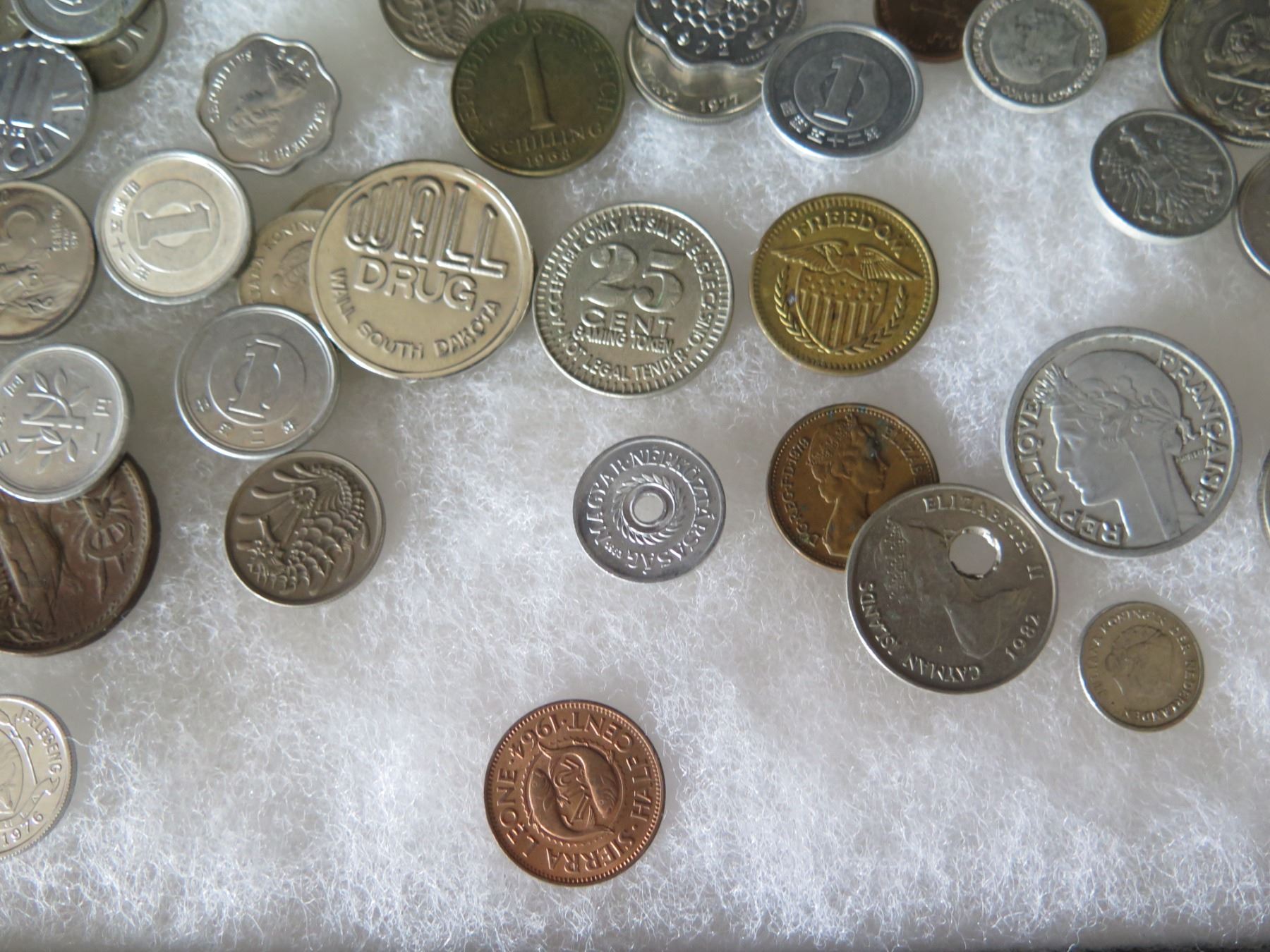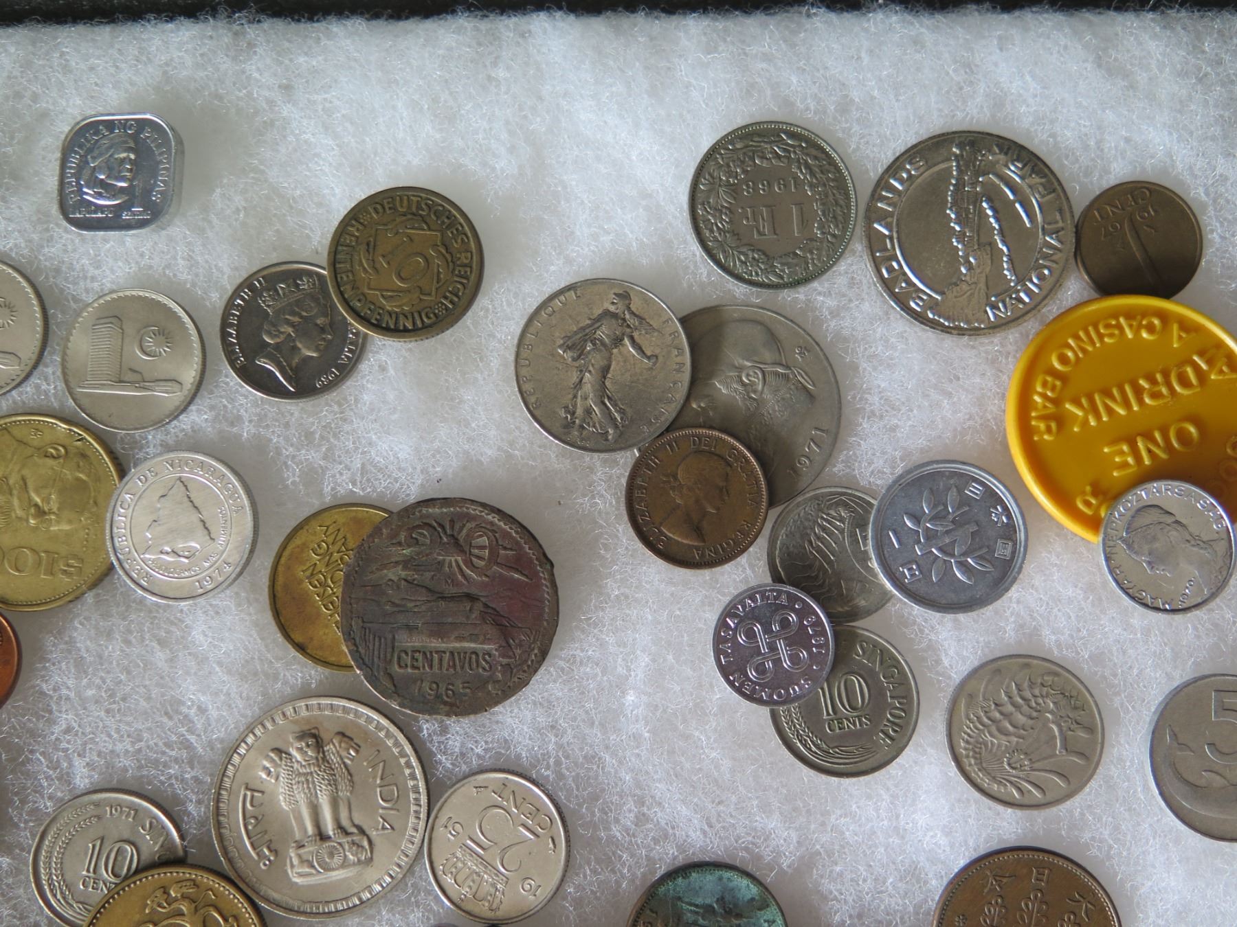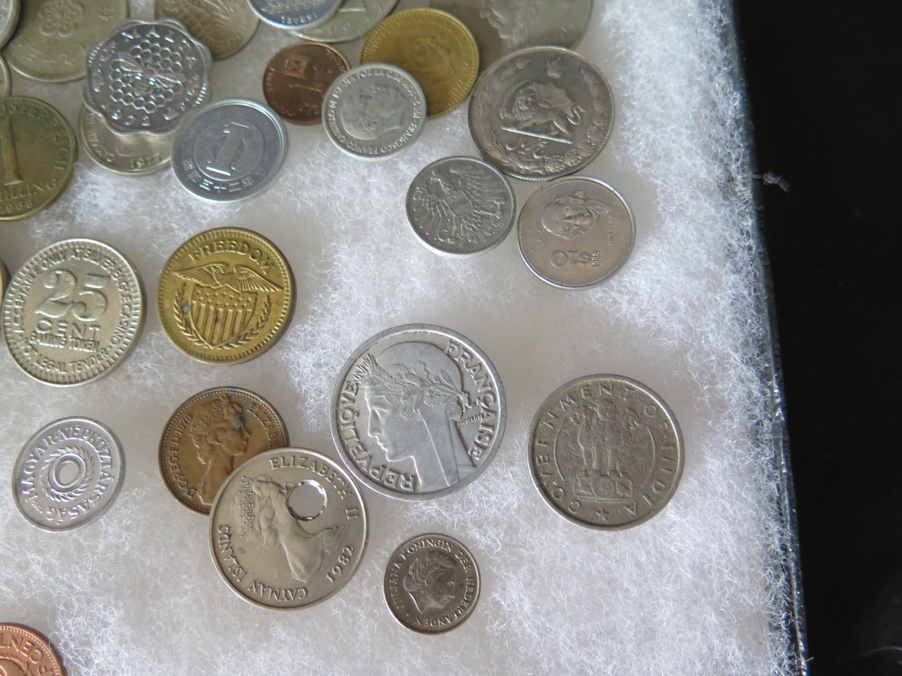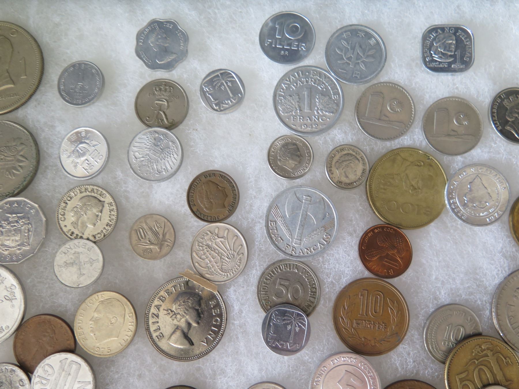 Multiple Coins: Piso, Jamaica, Country Boy, Bank Indonesia, Singapore, etc in Display Case 16"L