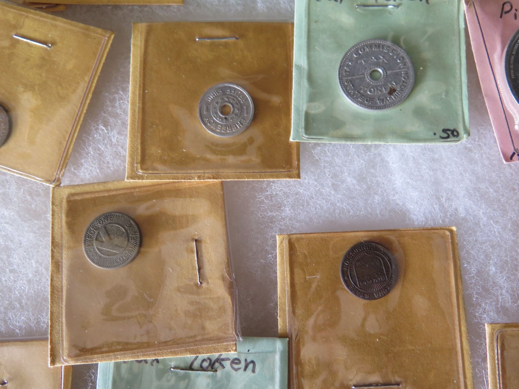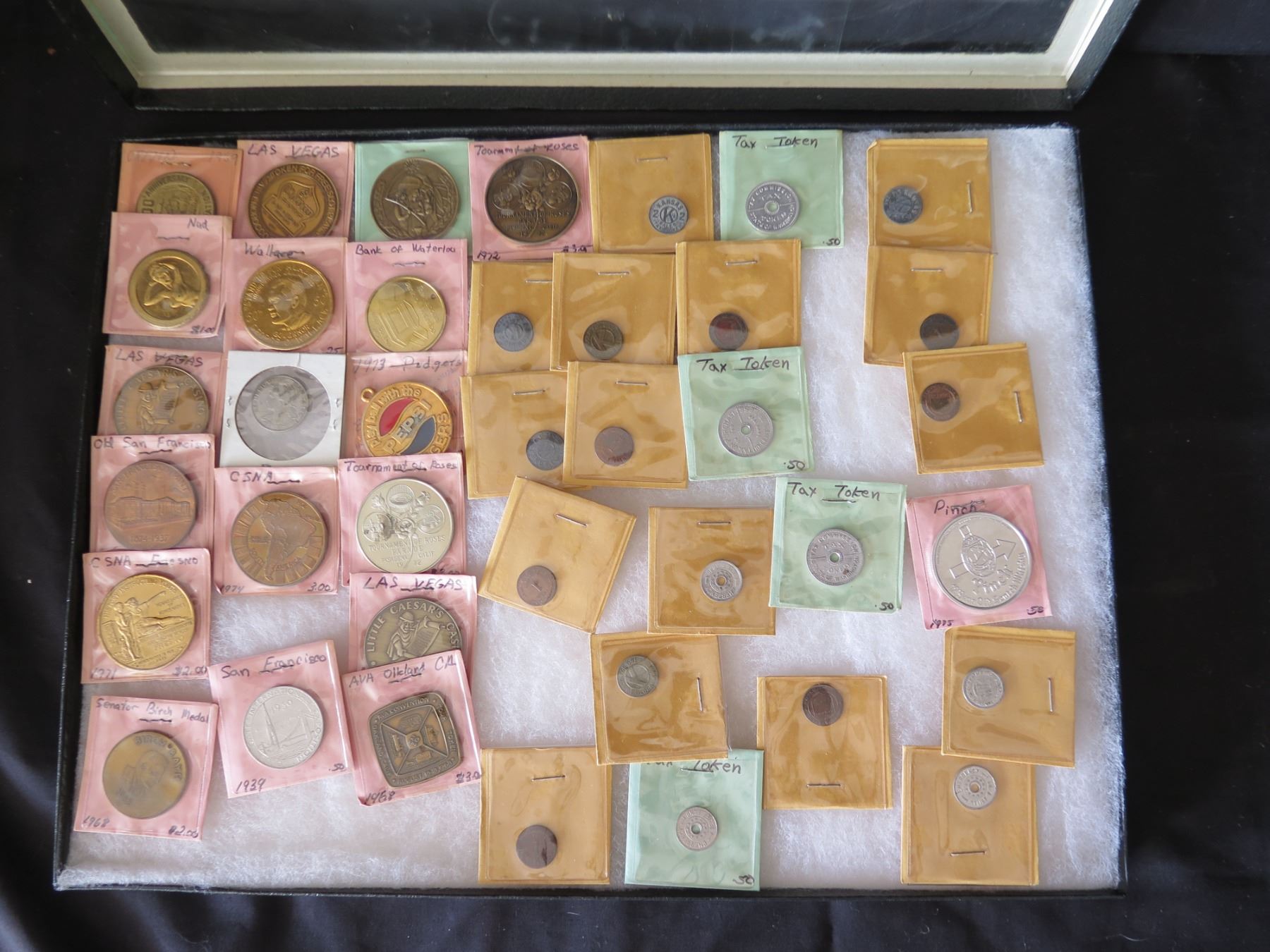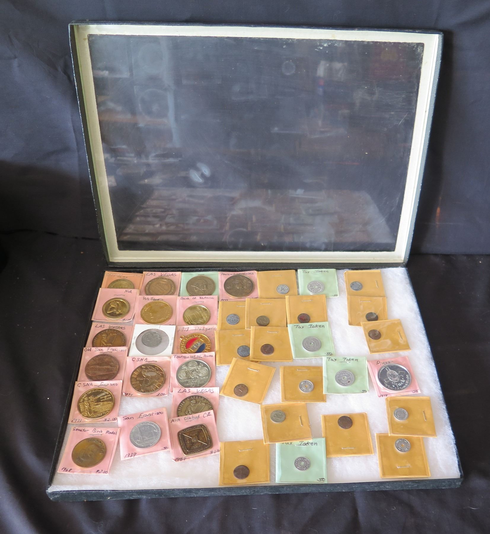Multiple Coins in Paper Flips: Las Vegas, Wallace, San Francisco, Tax Token etc in Display Case 16"L