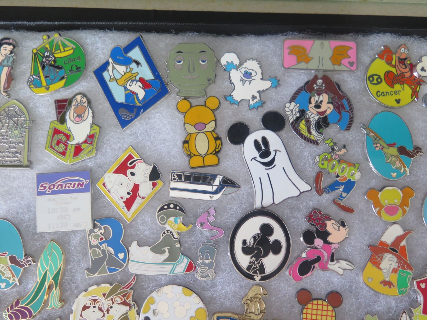 Multiple Collectible Pins: Cartoons, Disney, Animals, Trading, etc in Display Case 16"L