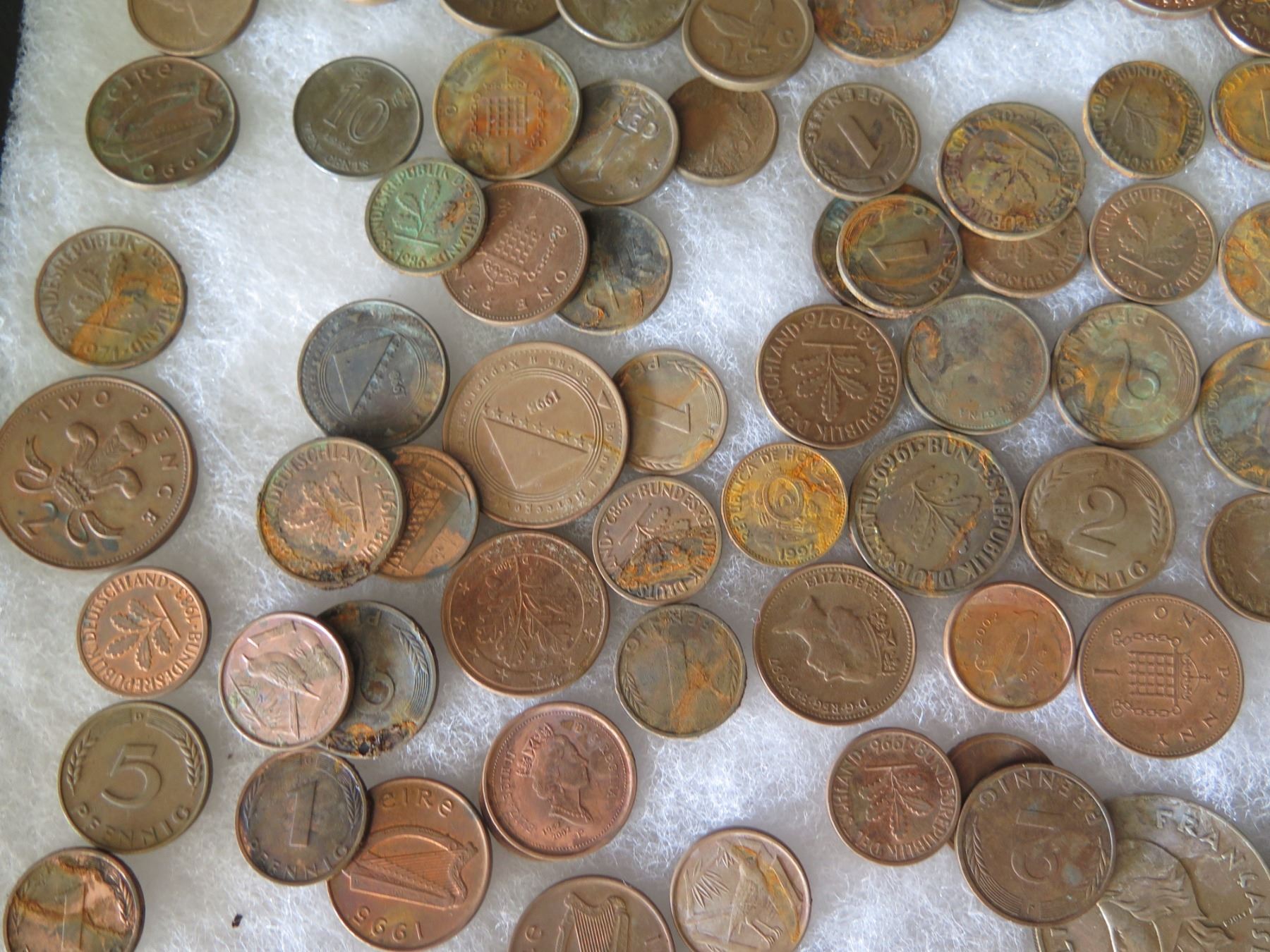 Multiple Collector Coins: Canadian Pennies, French Francs, etc in Display Case 16"L