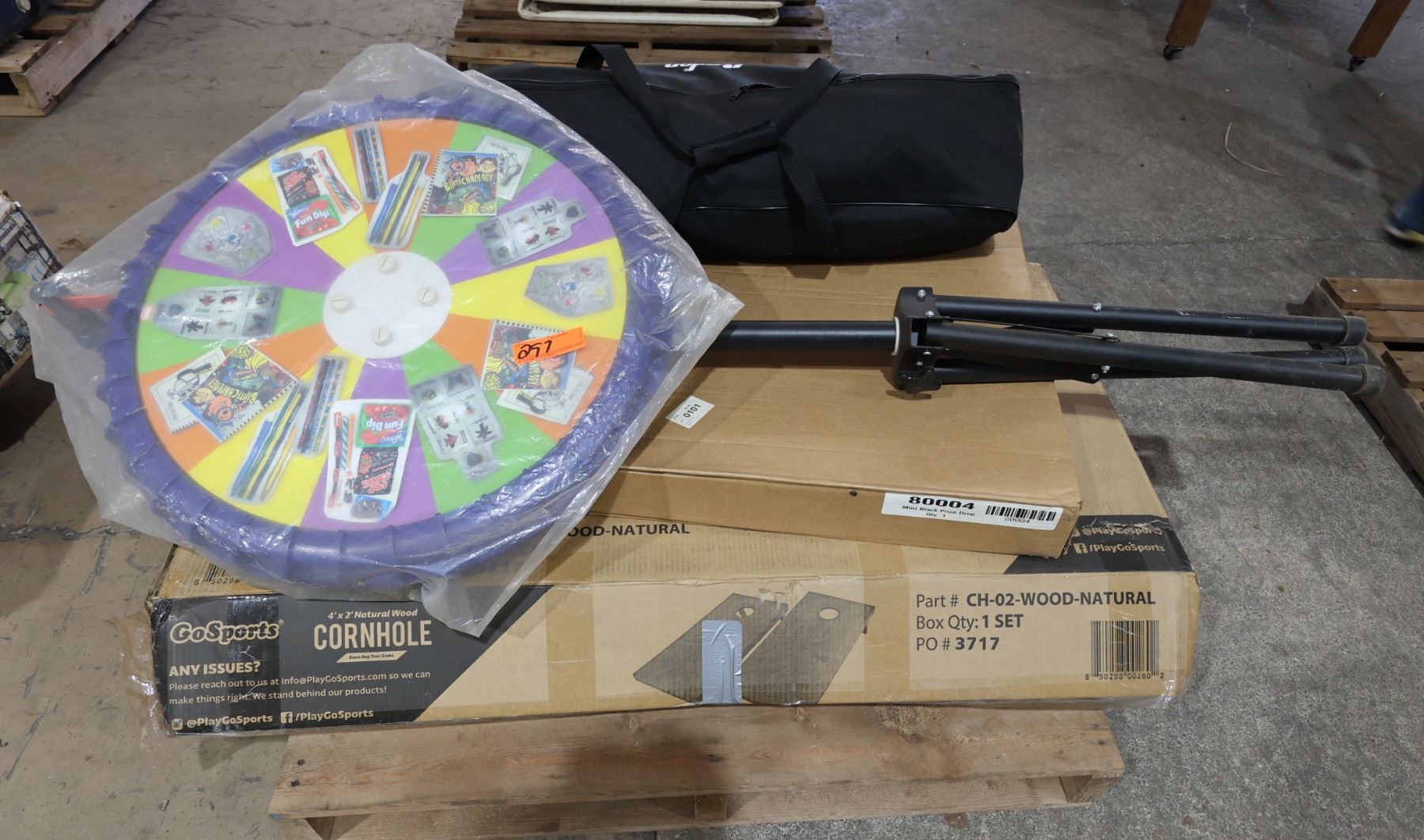 Multiple Games: Wooden CornHole Set, Baden Volleyball Net, Prize Wheel, etc