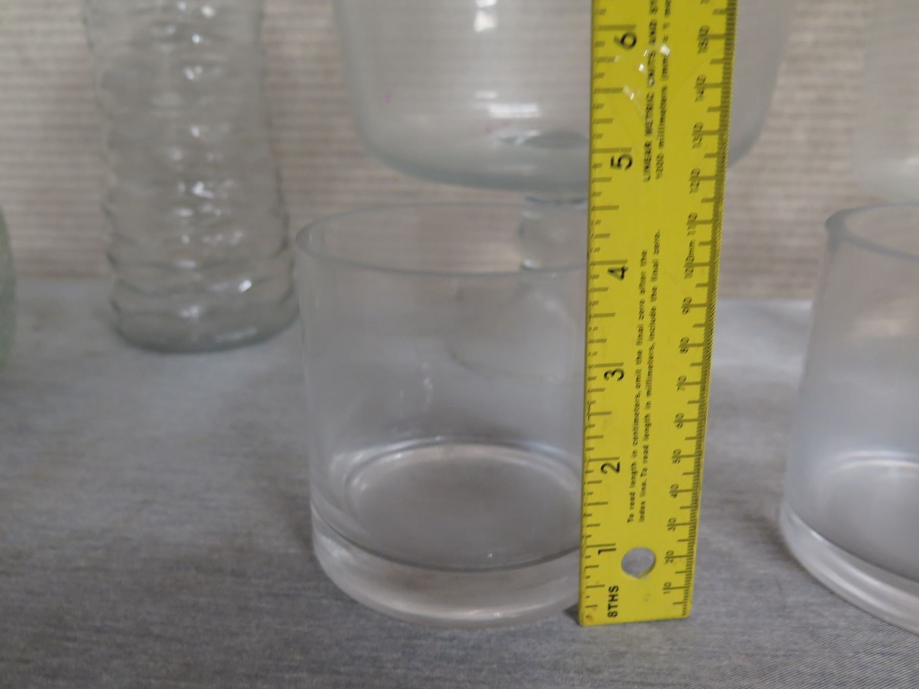 Multiple Glassware: 3 Cylinder Vases, 2 Bowls on Pedestal Bases, Ribbed Vases