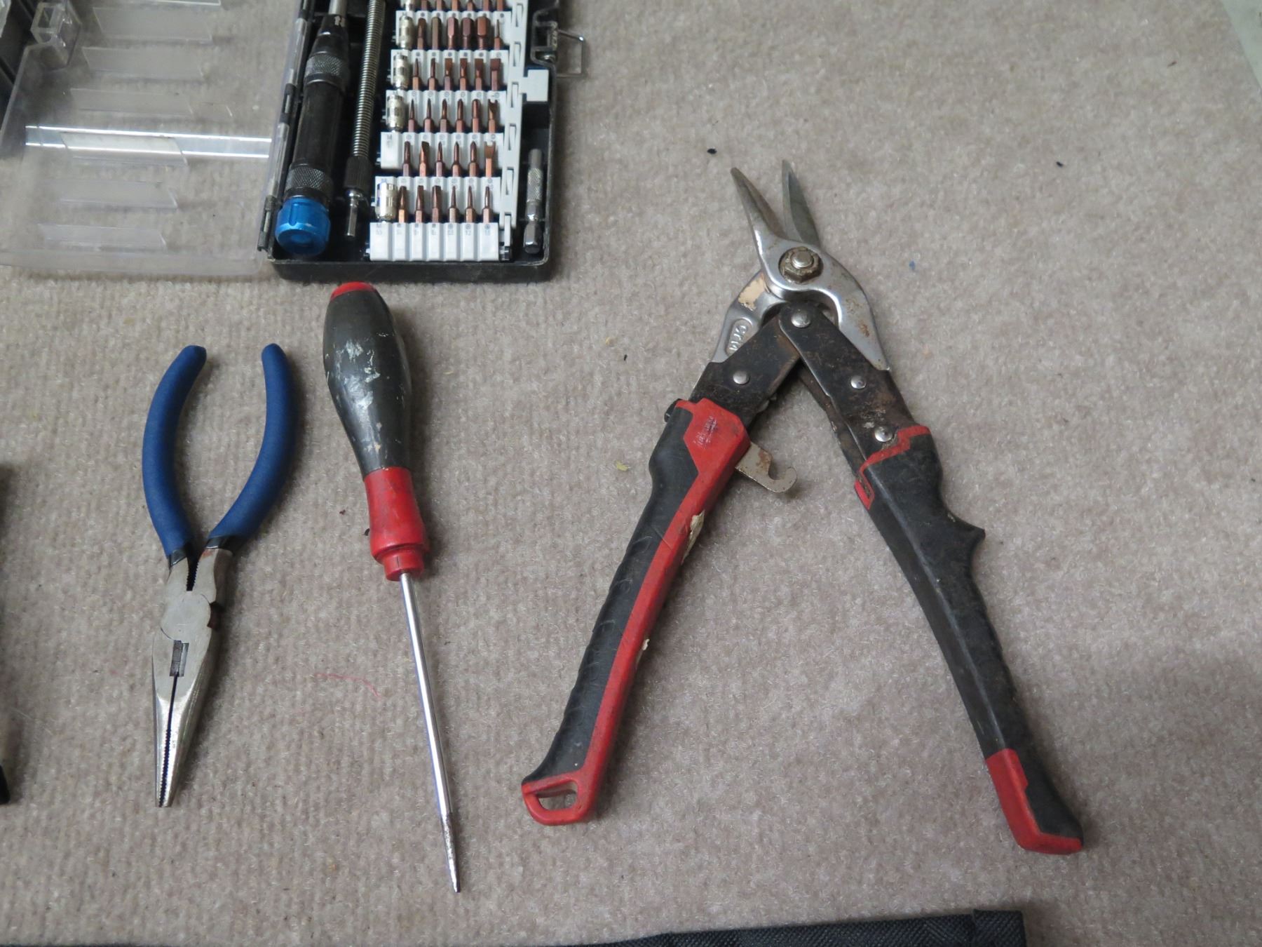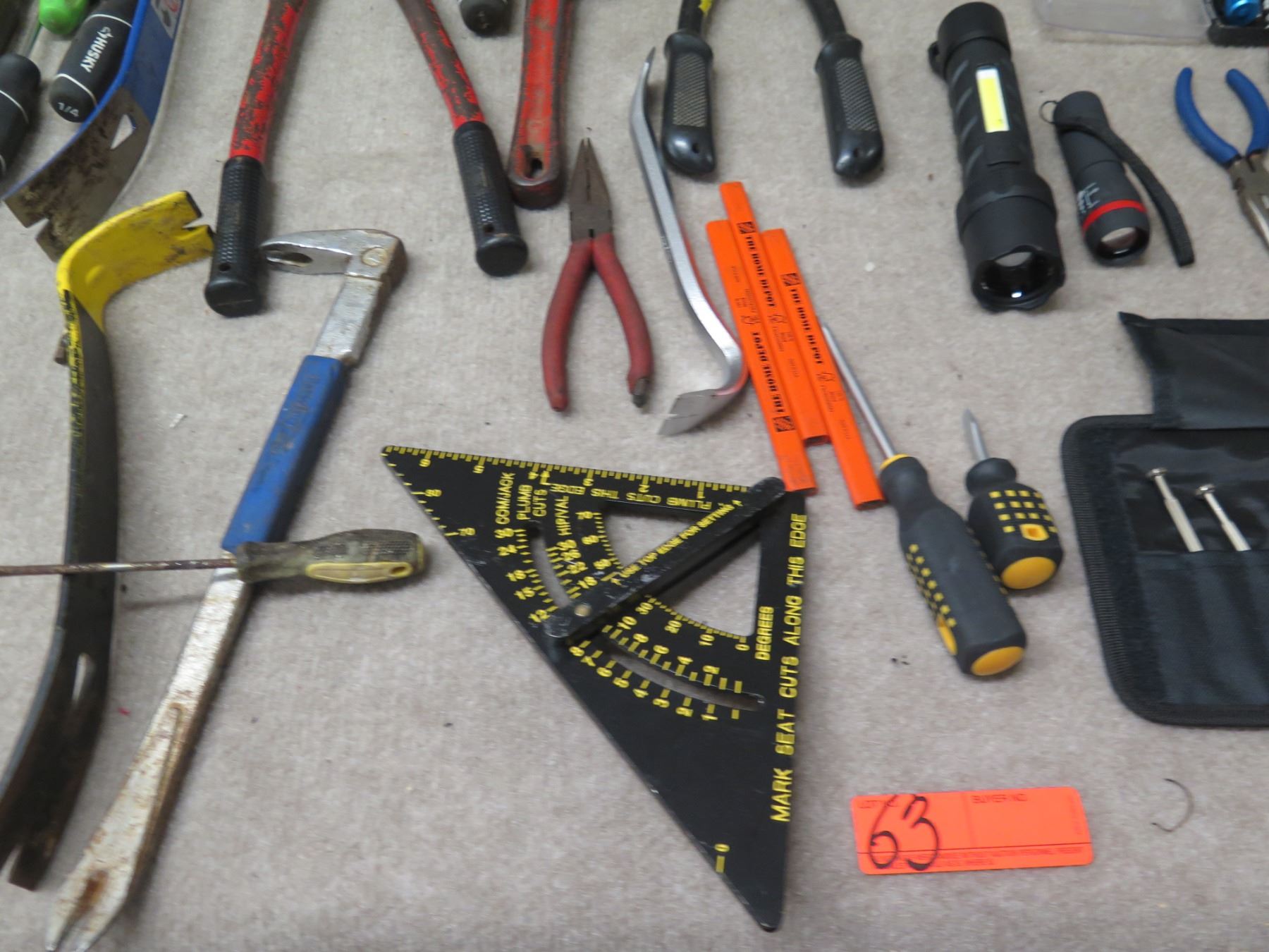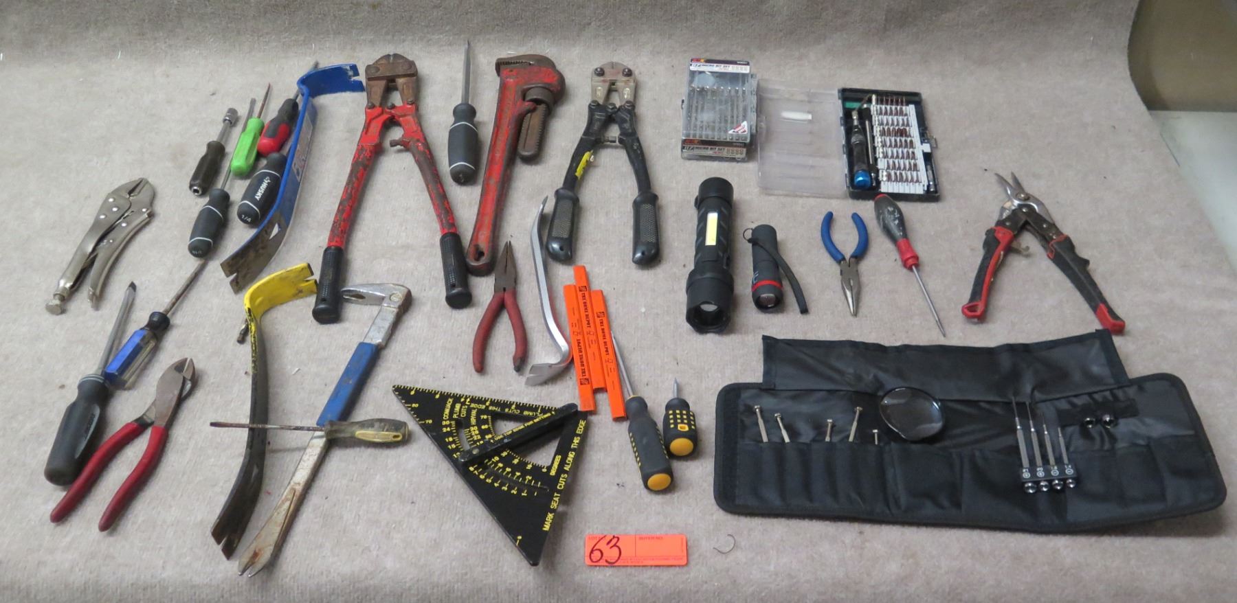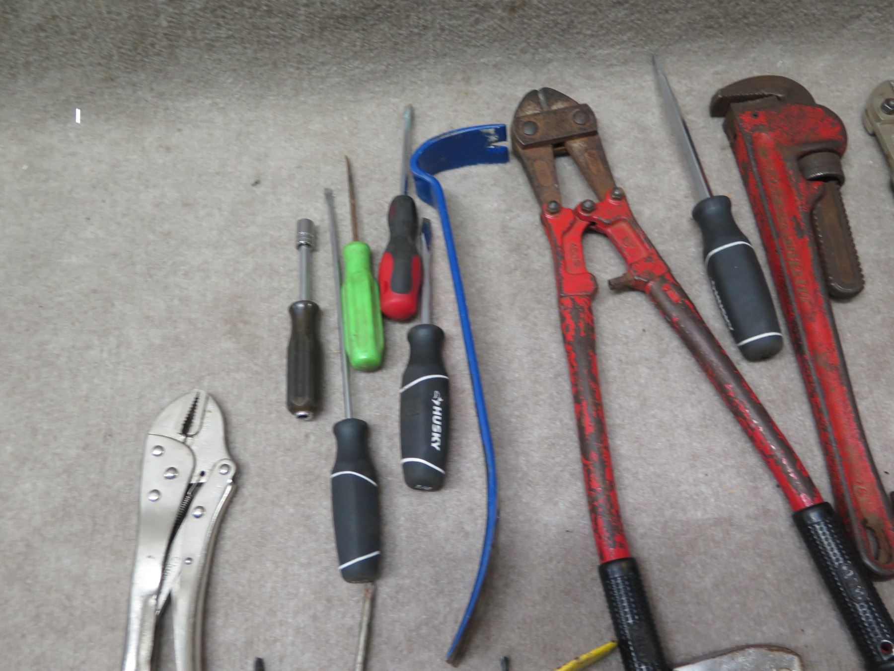 Multiple Hand Tools: Bolt Cutters, Pry Bar, Pliers, Bit Sets, Pipe Wrench, Drivers, etc