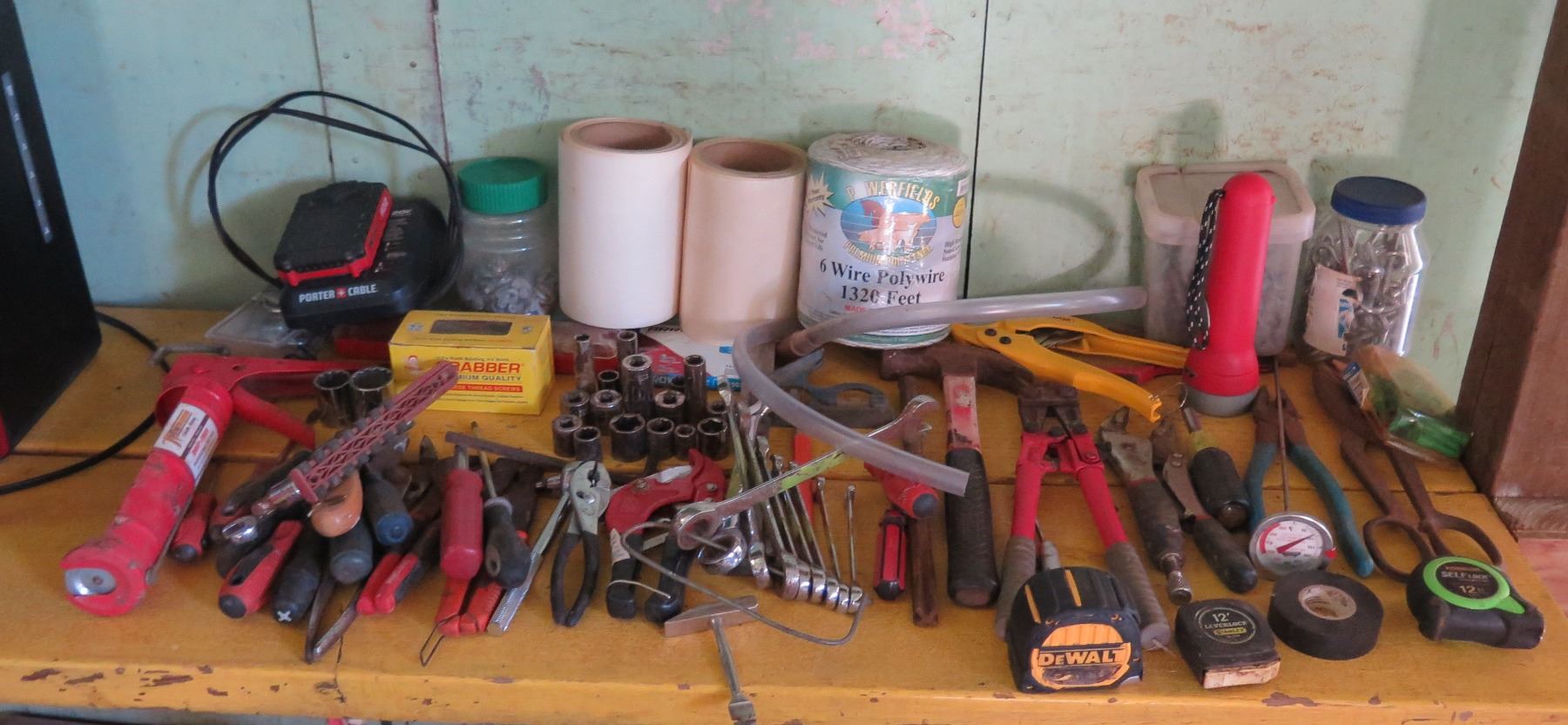 Multiple Hand Tools, Grease Guns, Measuring Tapes, Wire, Hardware, etc