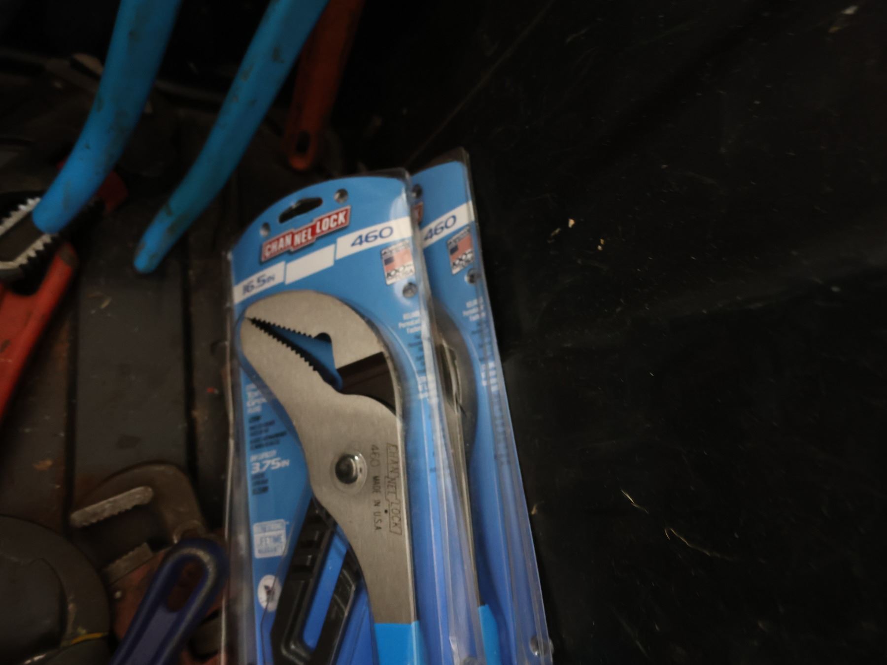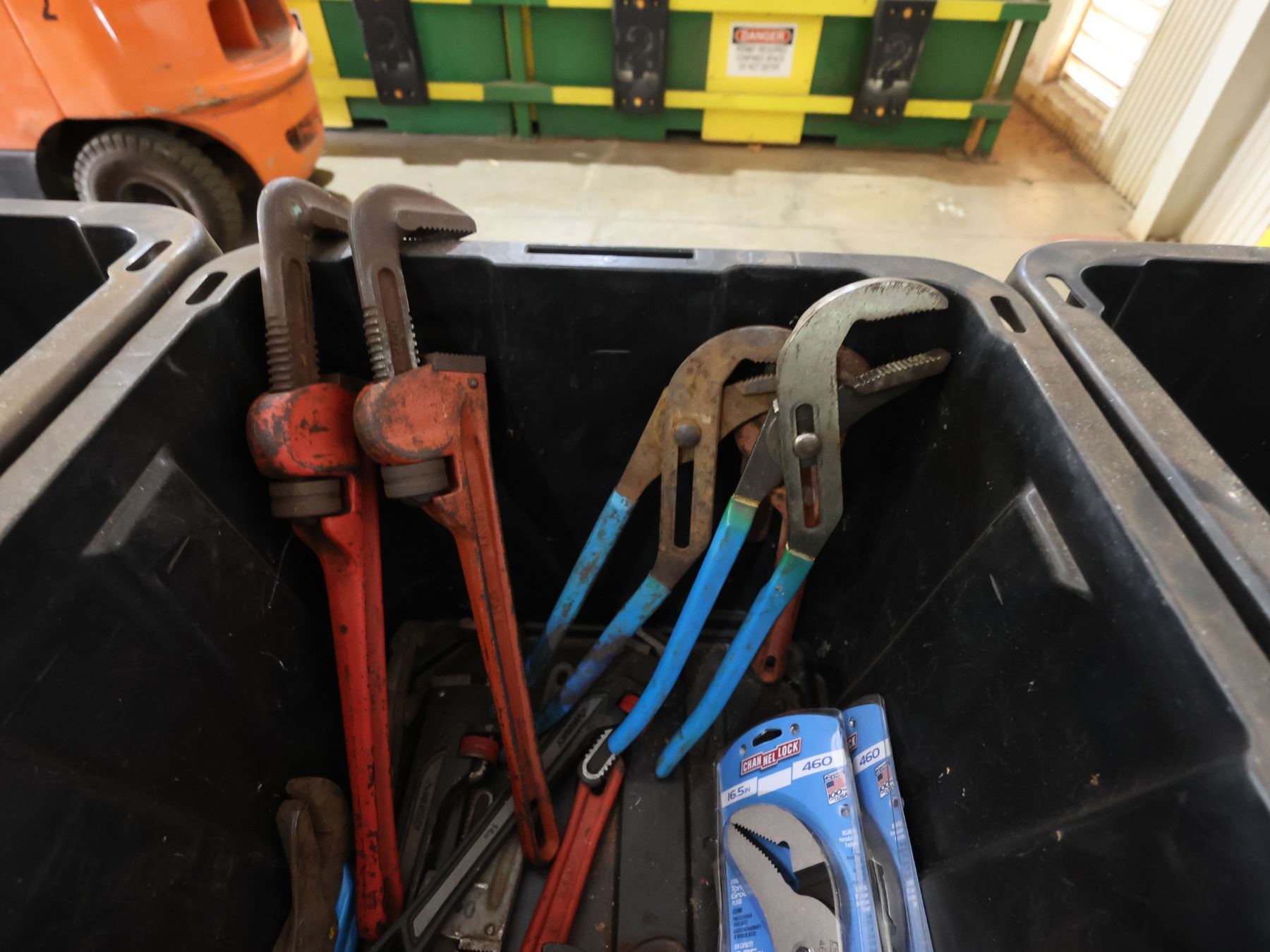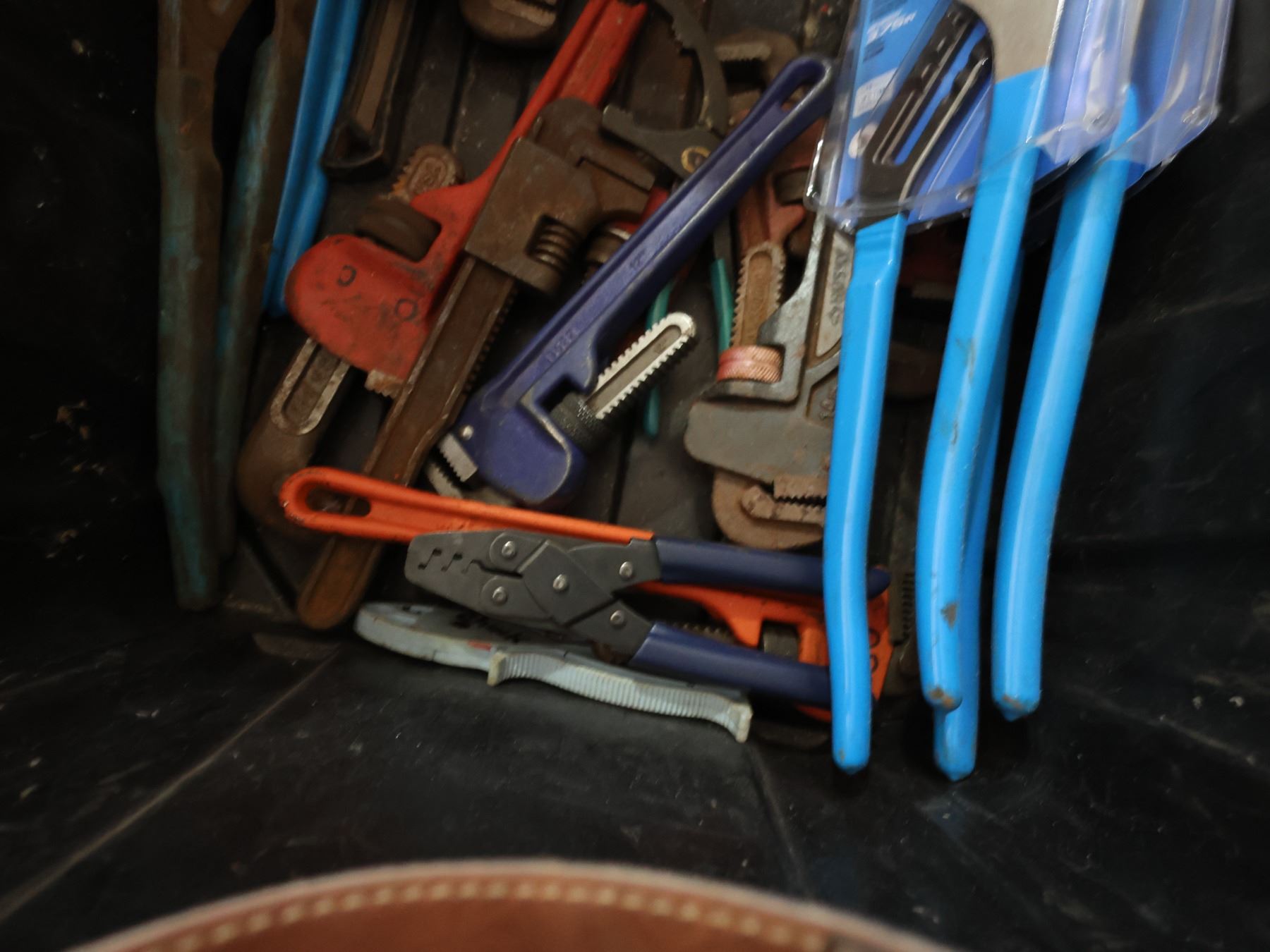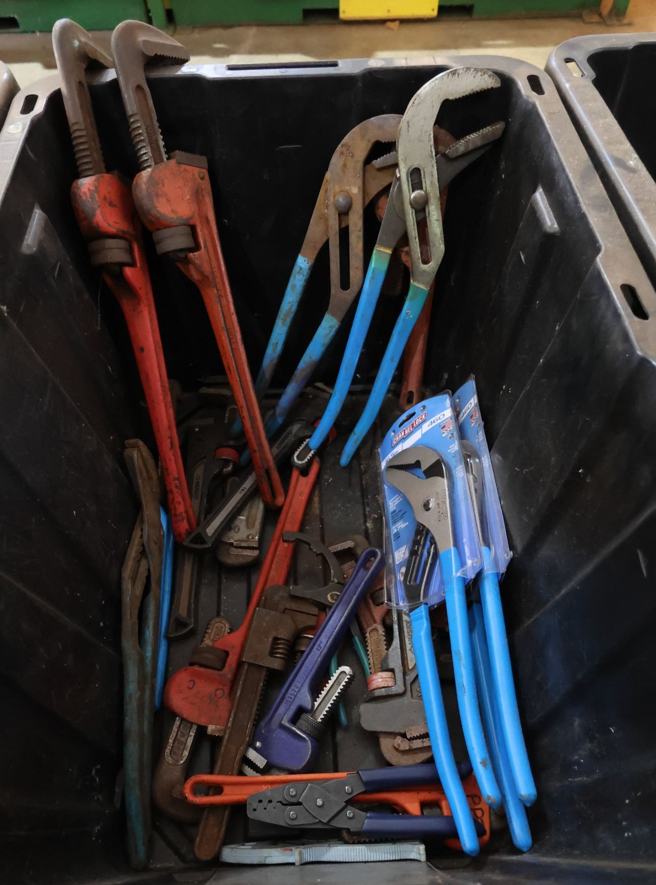 Multiple Hand Tools: Pipe Wrenches, Channel Lock Wrenches, Wire Cutter, etc in Bin